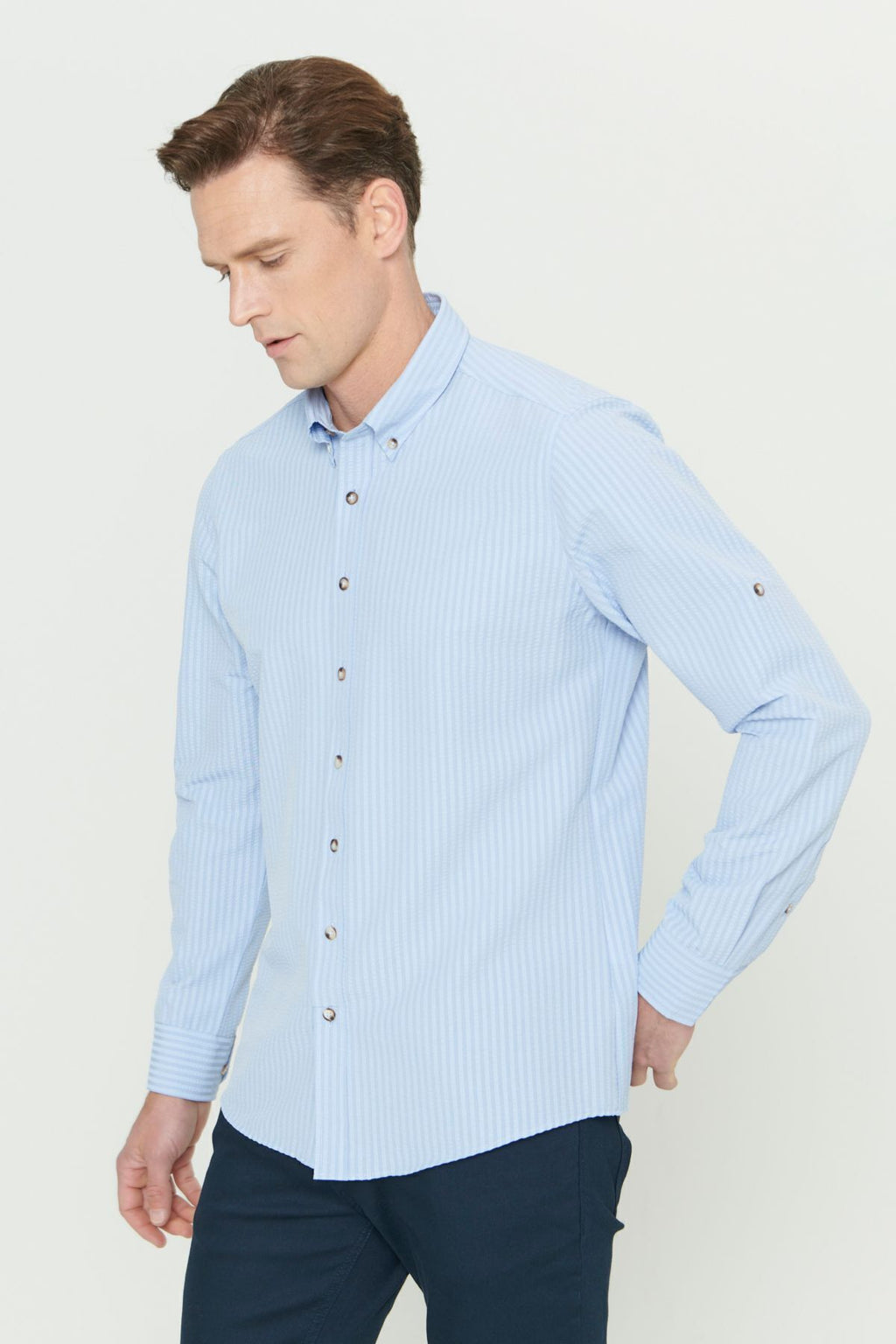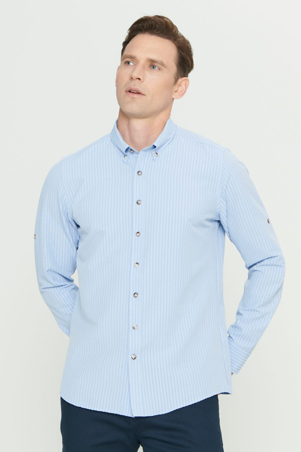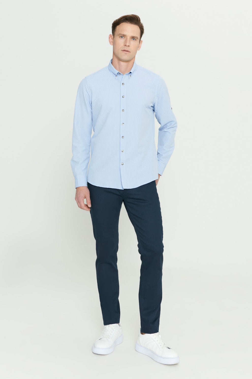 Men's navy blue wrinkle Oxford wafer patterned slim fit narrow cut buttoned collar flexible shirt
