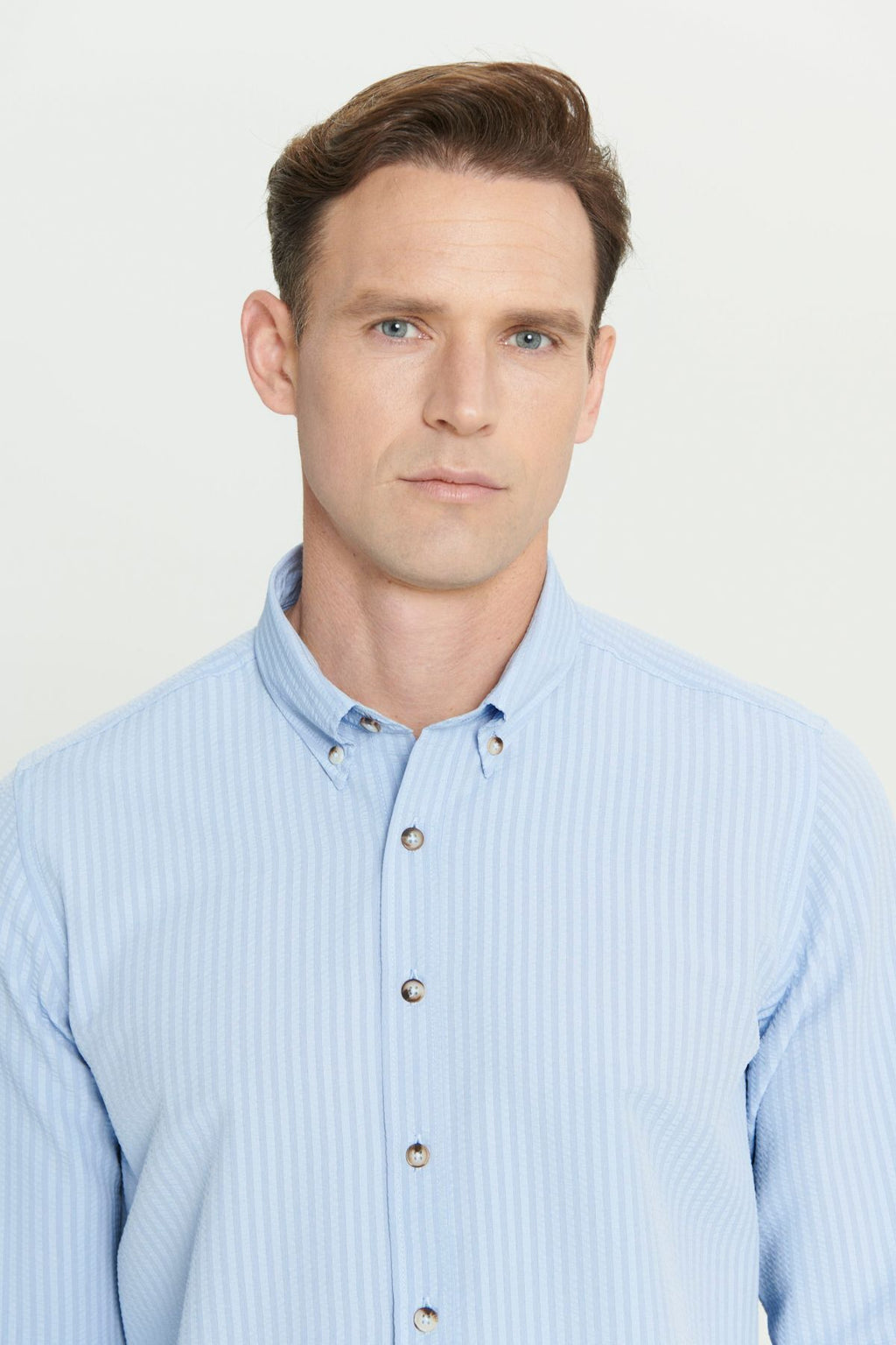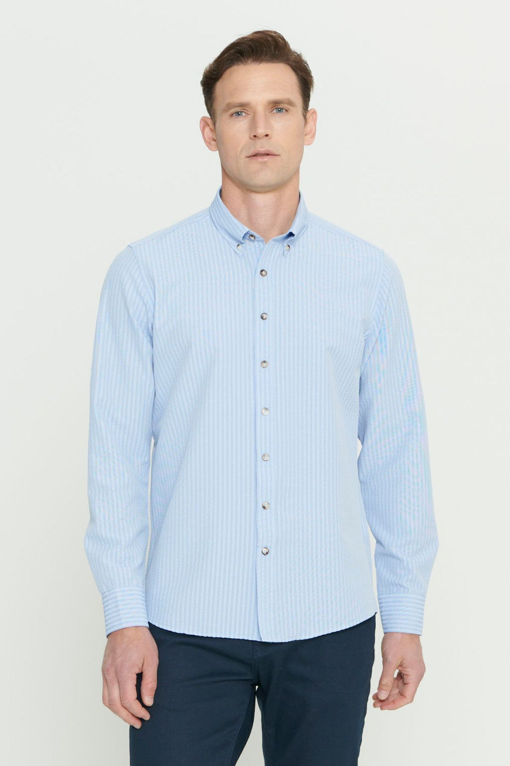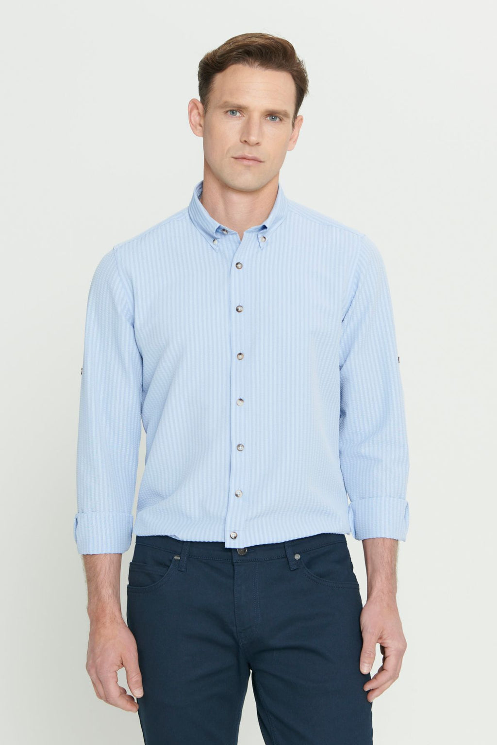 Men's navy blue wrinkle Oxford wafer patterned slim fit narrow cut buttoned collar flexible shirt