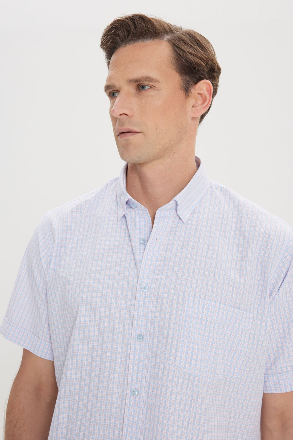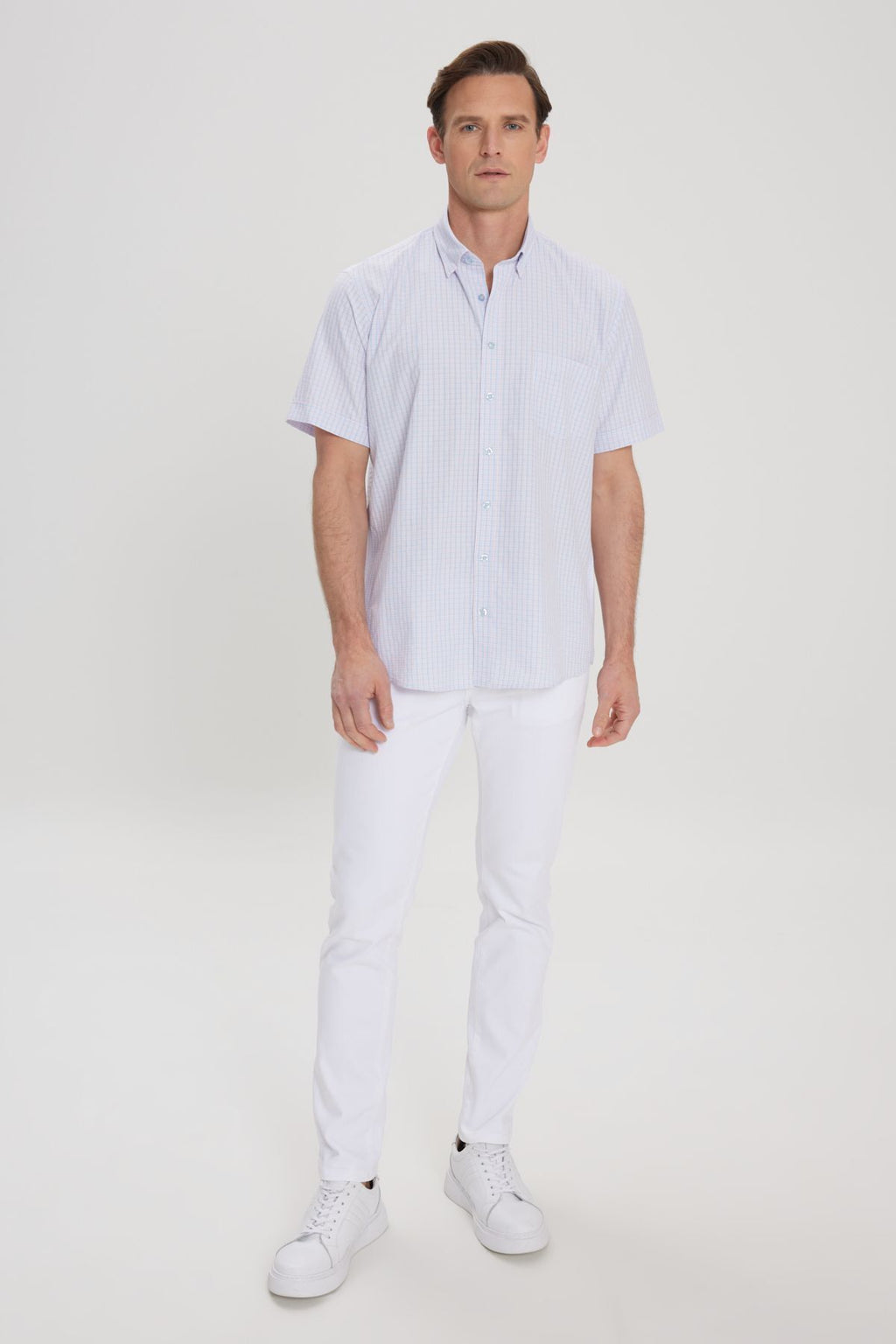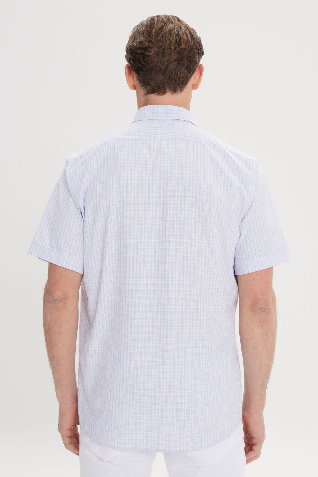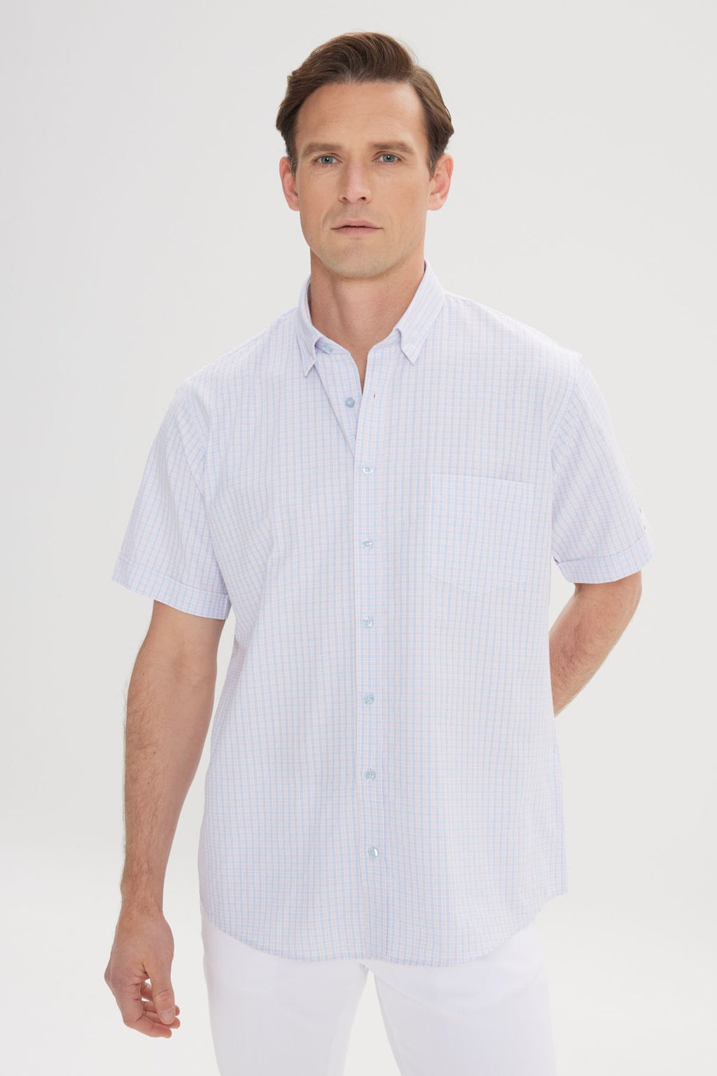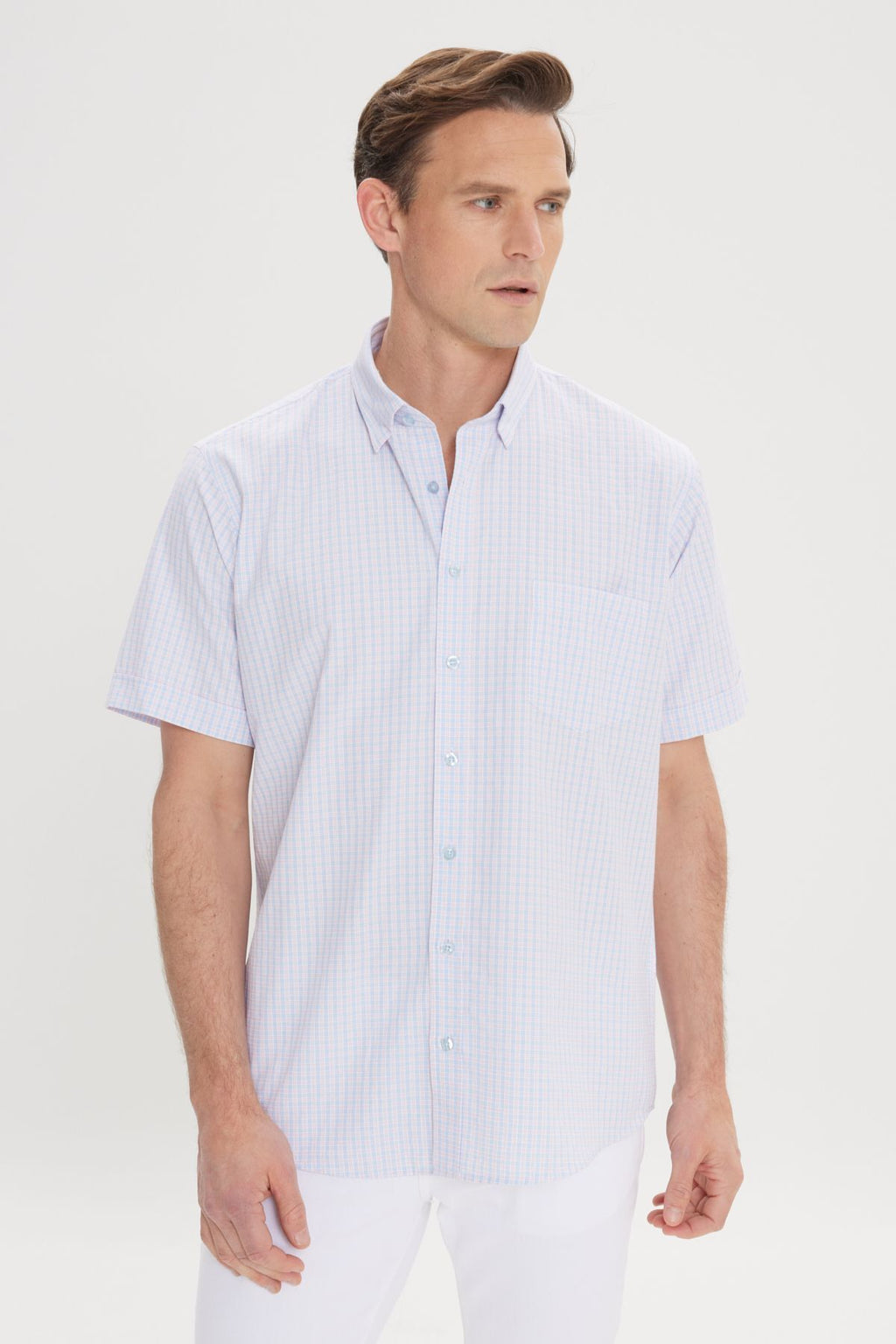 Men's White-Blue Comfort Fit Casual Cutting Buttoned Neck Square Short Sleeve Shirt