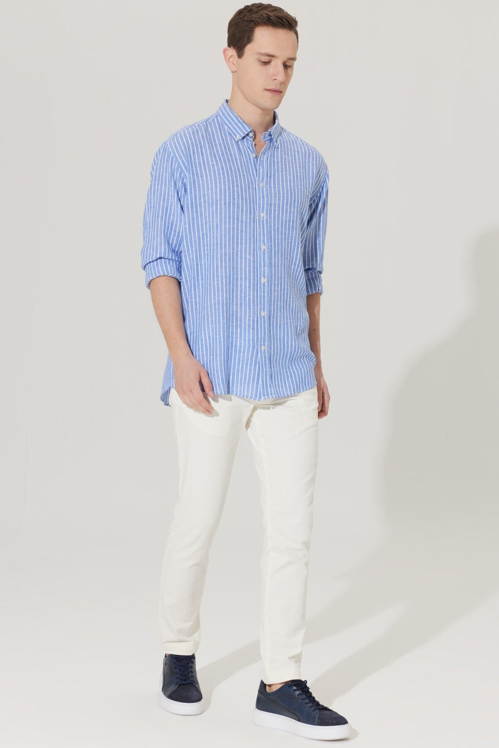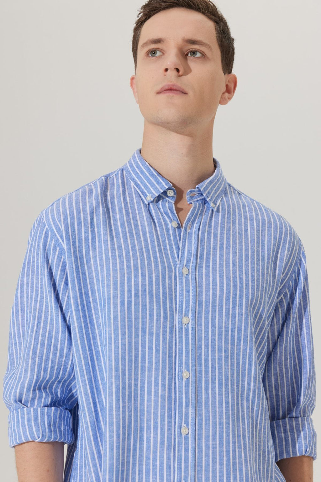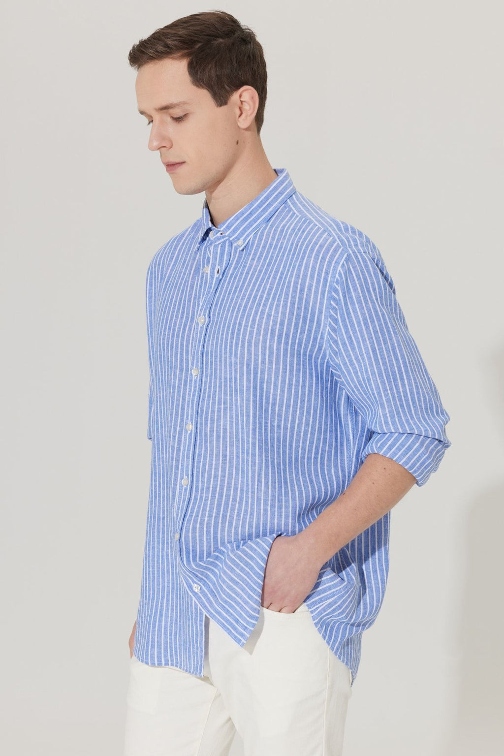 Men's white-blue linen comfort fit comfortable cutting buttoned shirts with collar striped