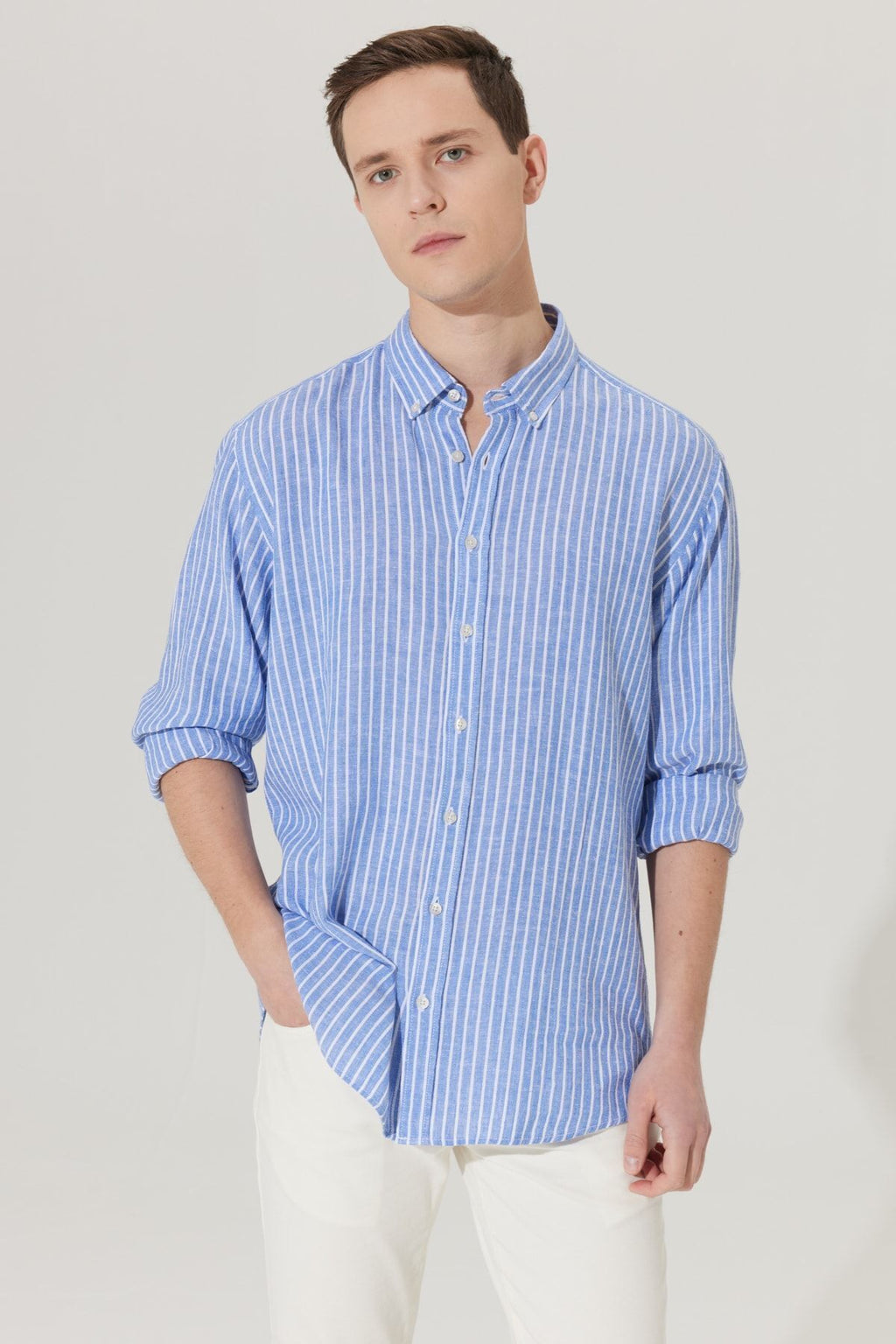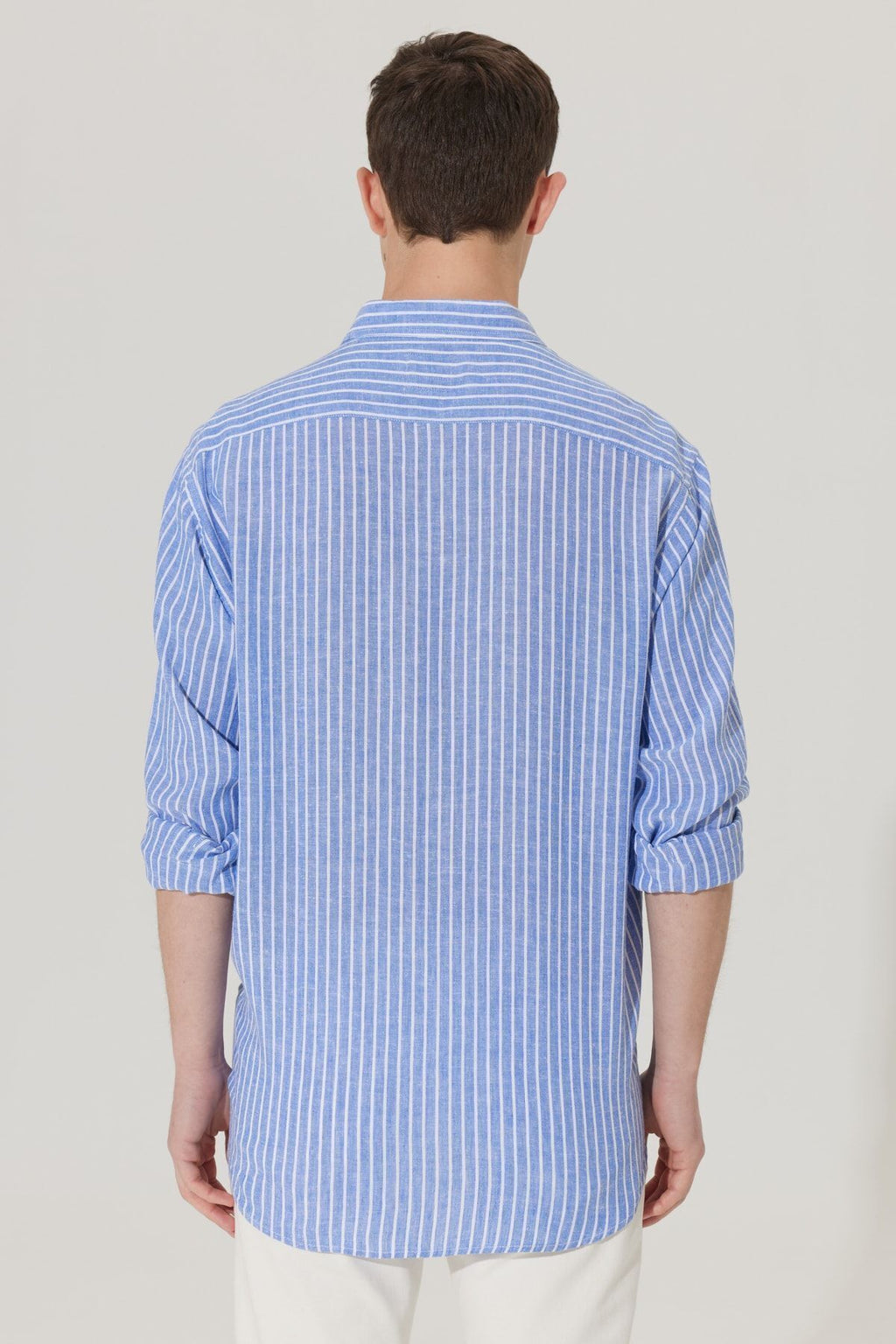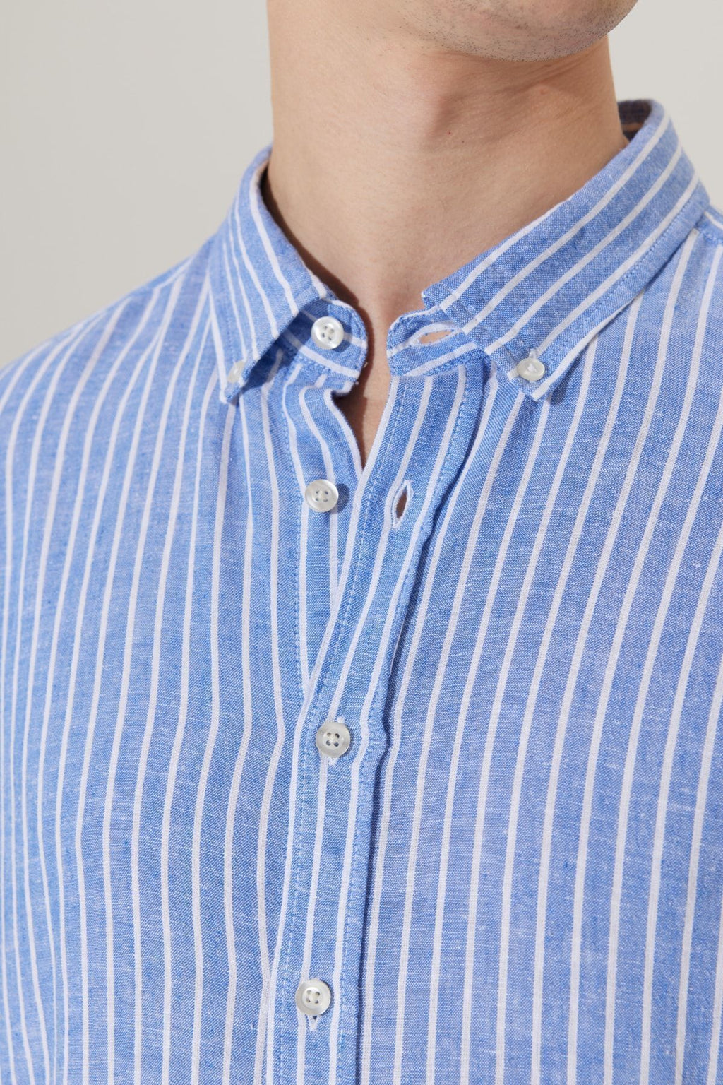 Men's white-blue linen comfort fit comfortable cutting buttoned shirts with collar striped