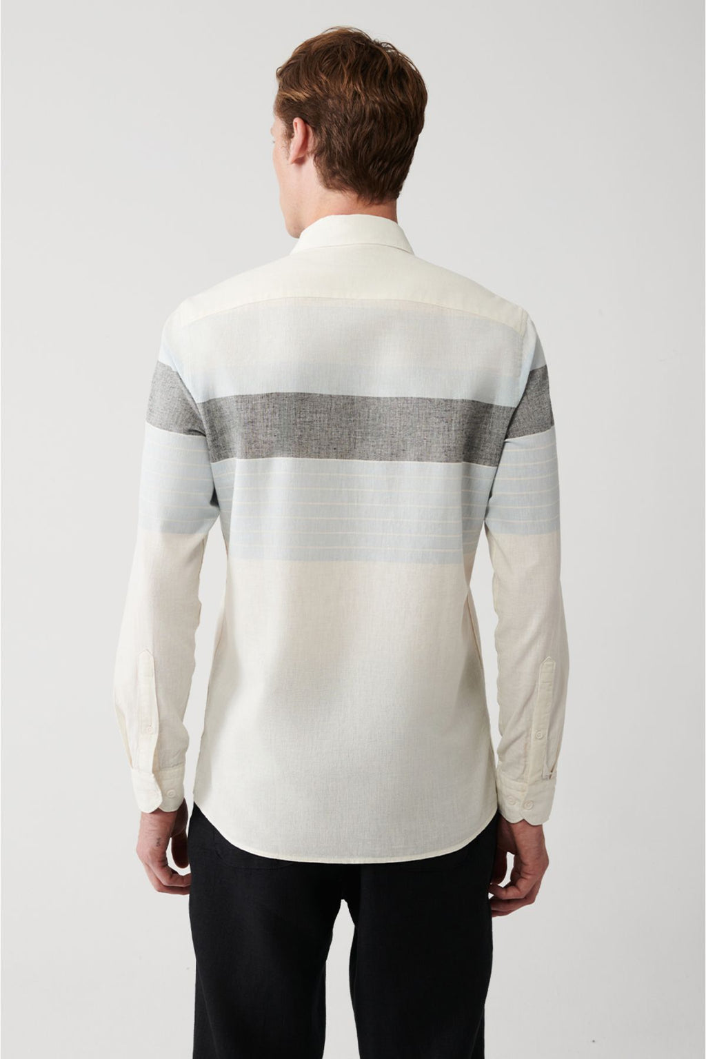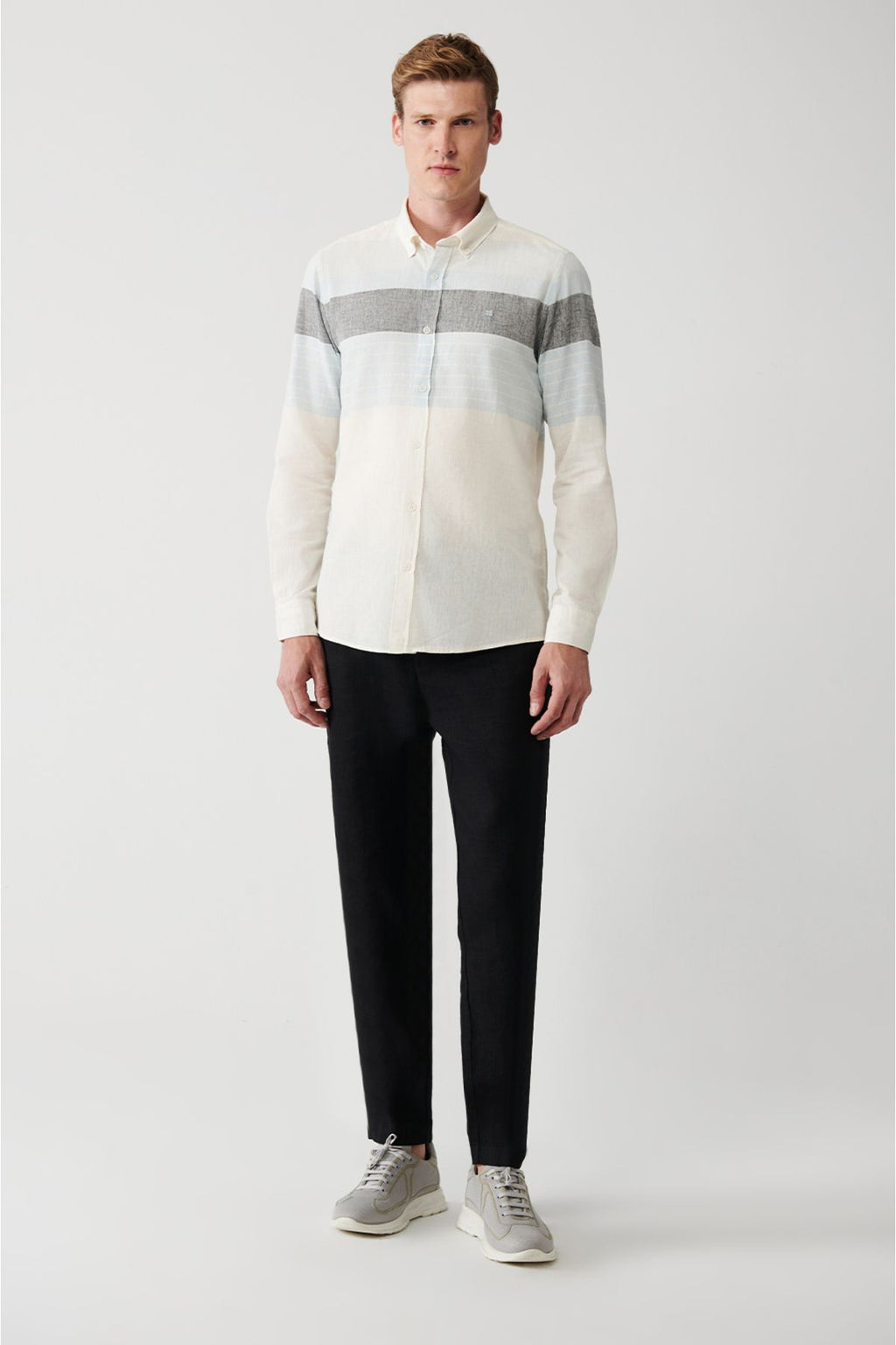 Men's white cotton linen mixed buttoned collar striped shirt A31y2267