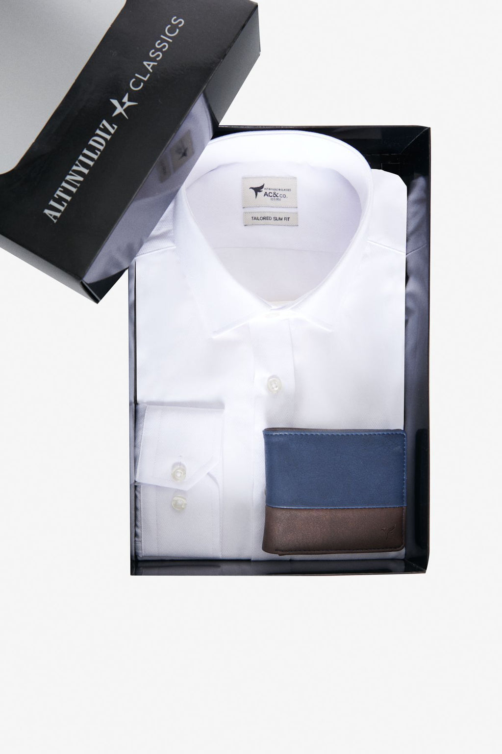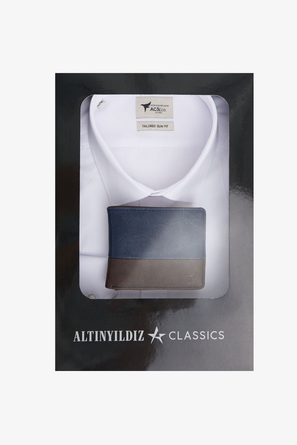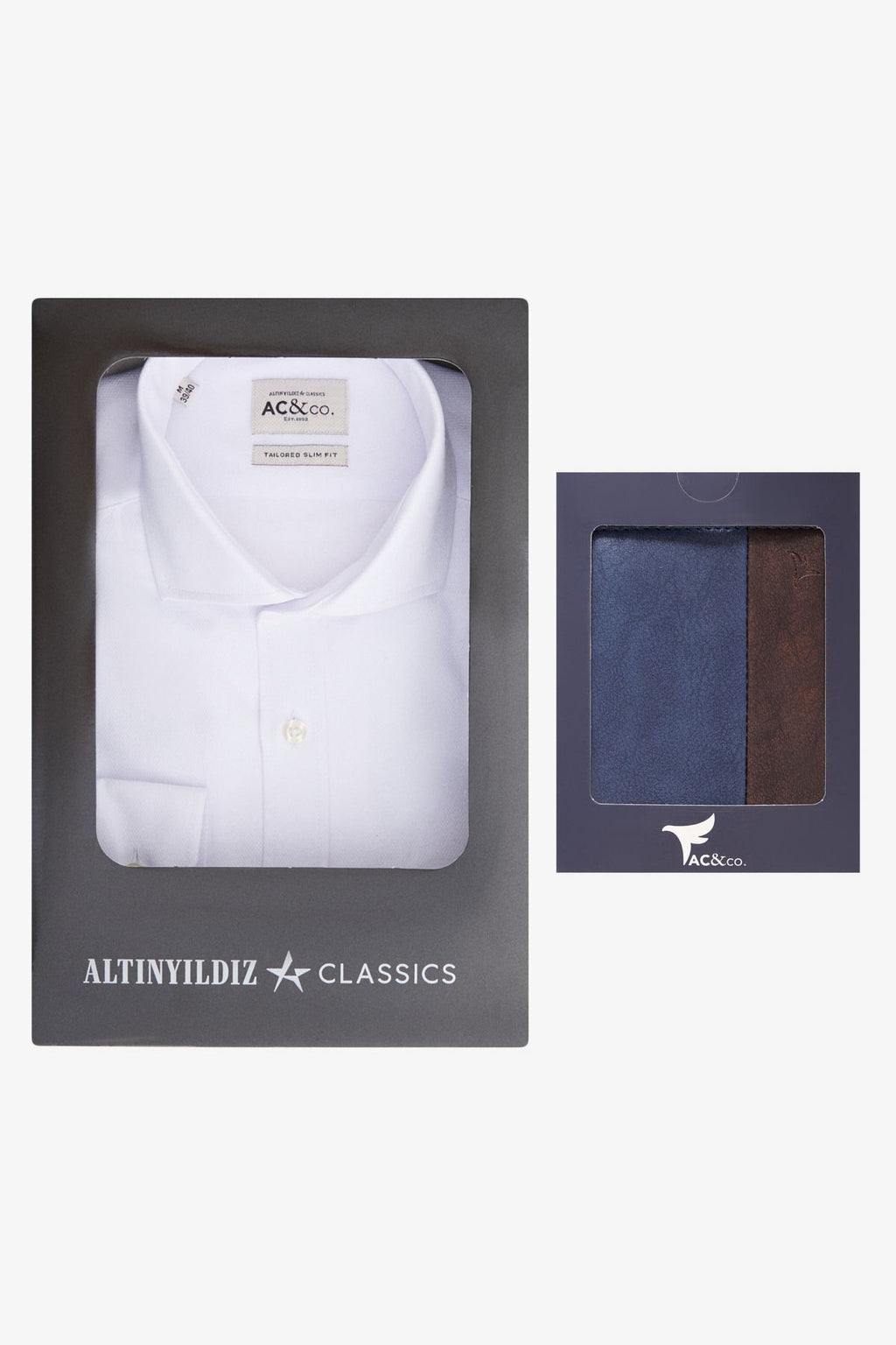Men's White-Navy Blue-Brown Special Gift Boxed Slim Fit Cotton Shirt-Wallet Set