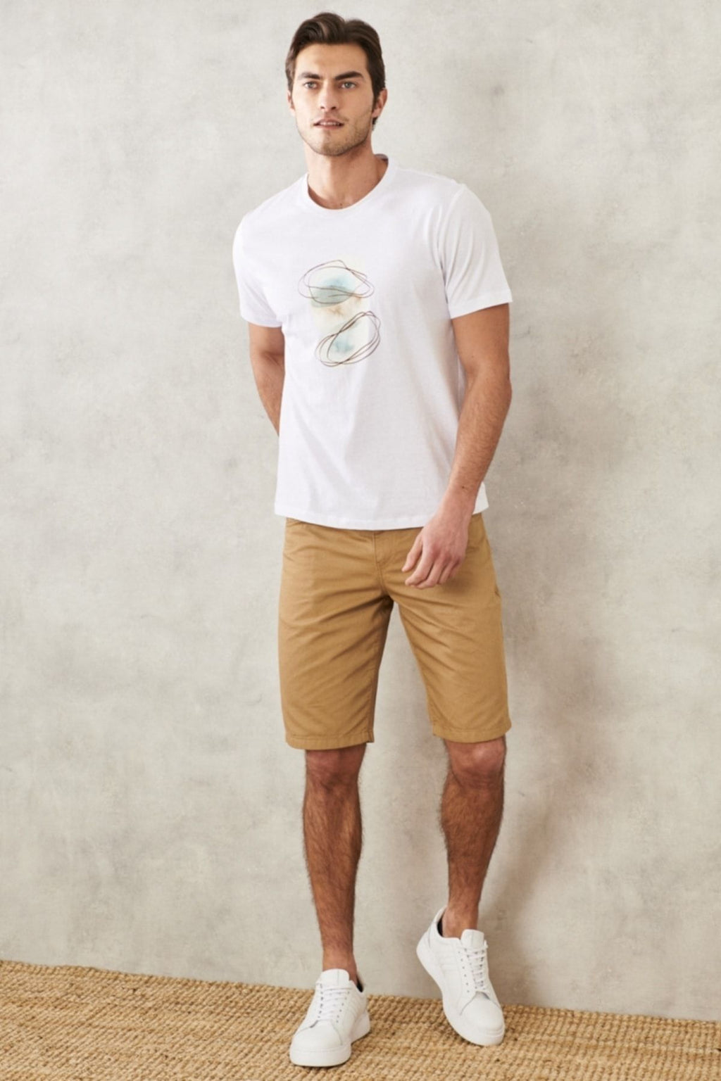 Men's white slim fit narrow cut 100 %cotton bike collar printed T -shirt