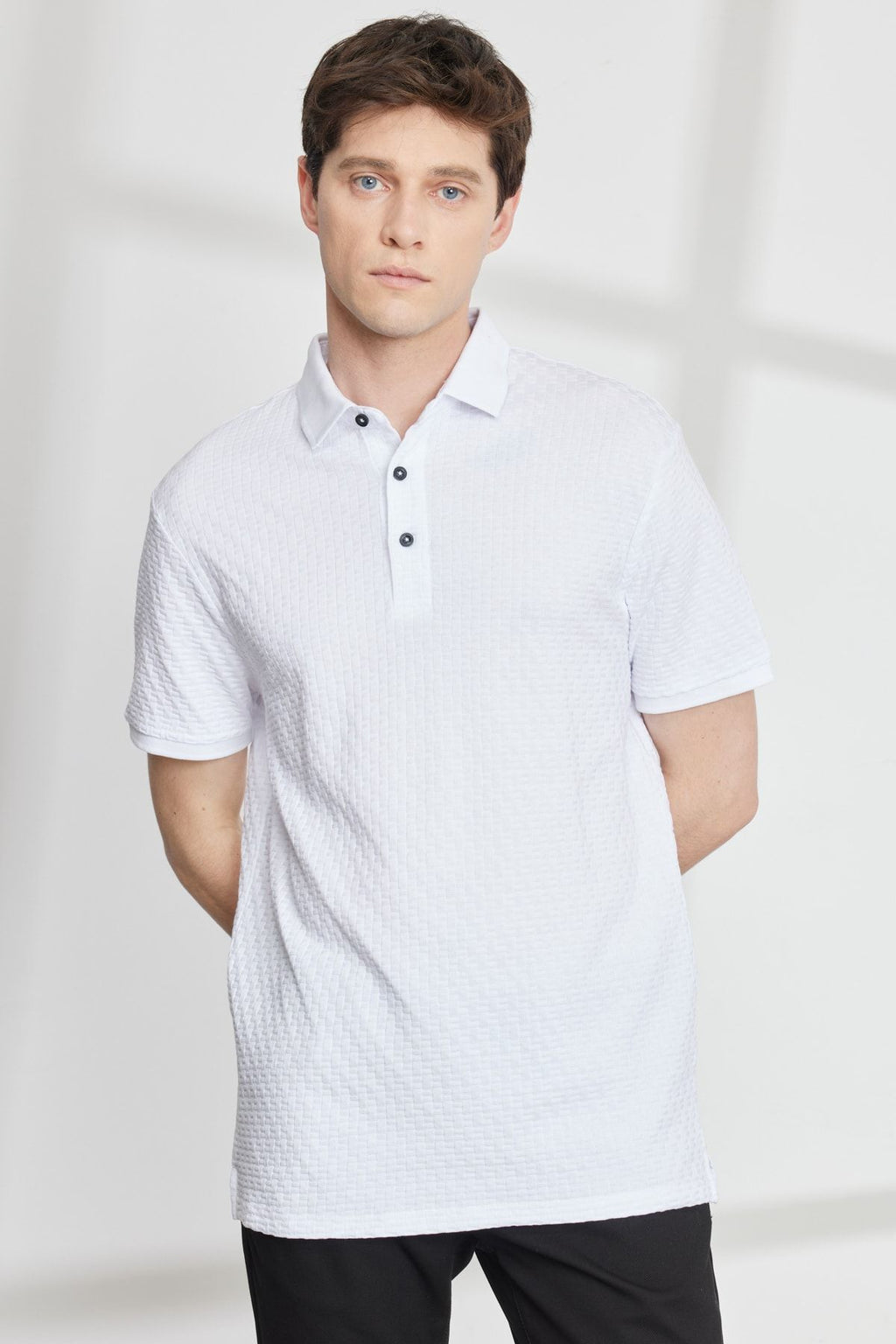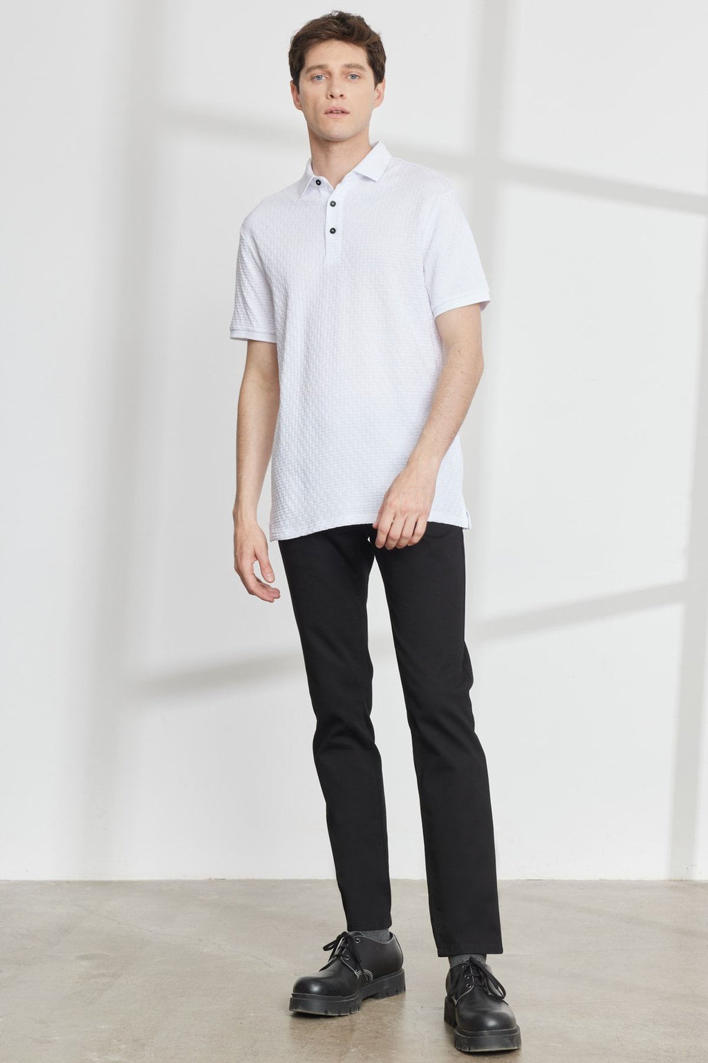 Men's white slim fit narrow cut bike bike collar jacquard short sleeve t -shirt