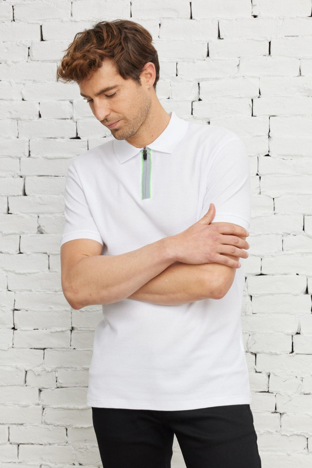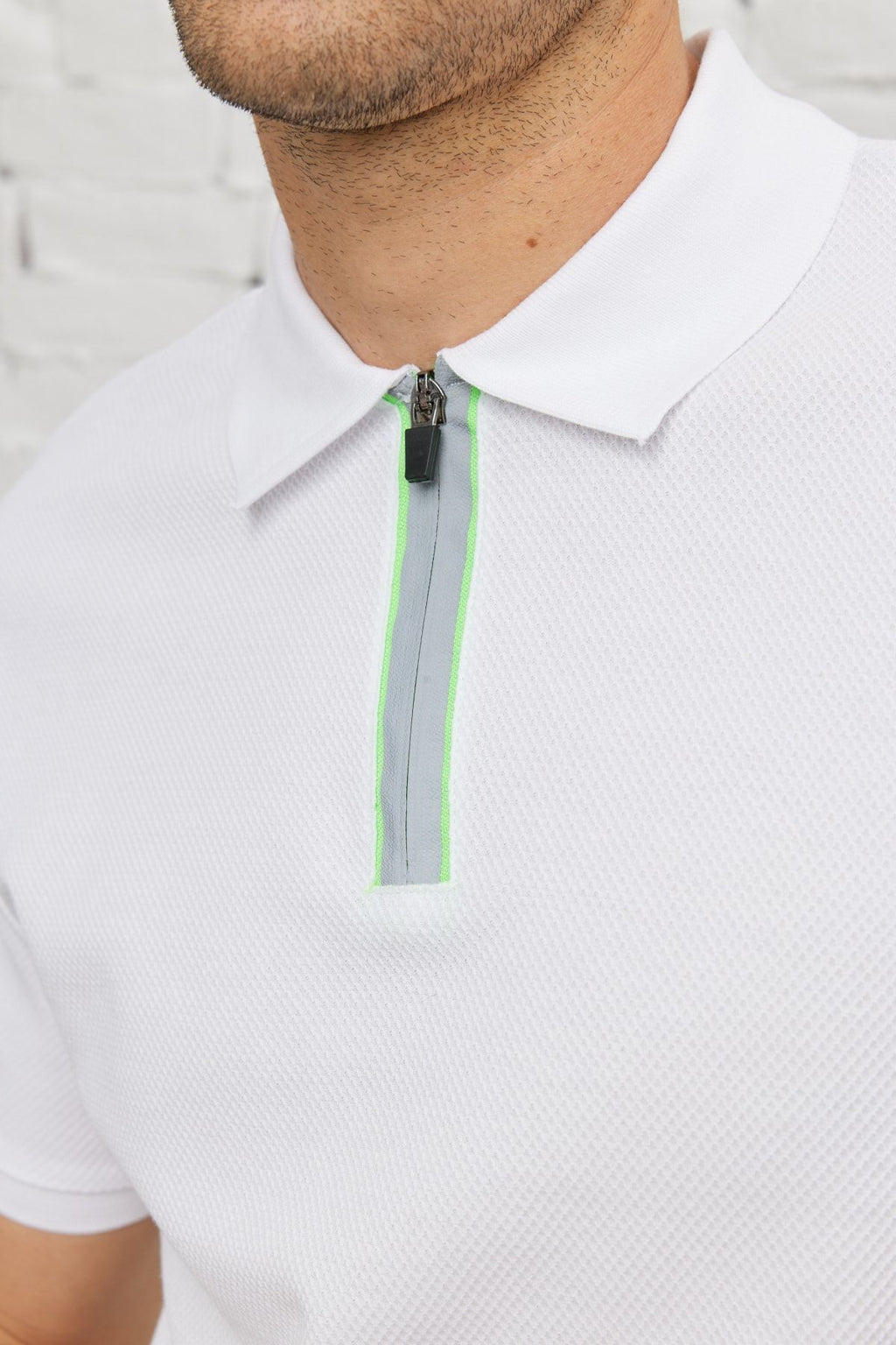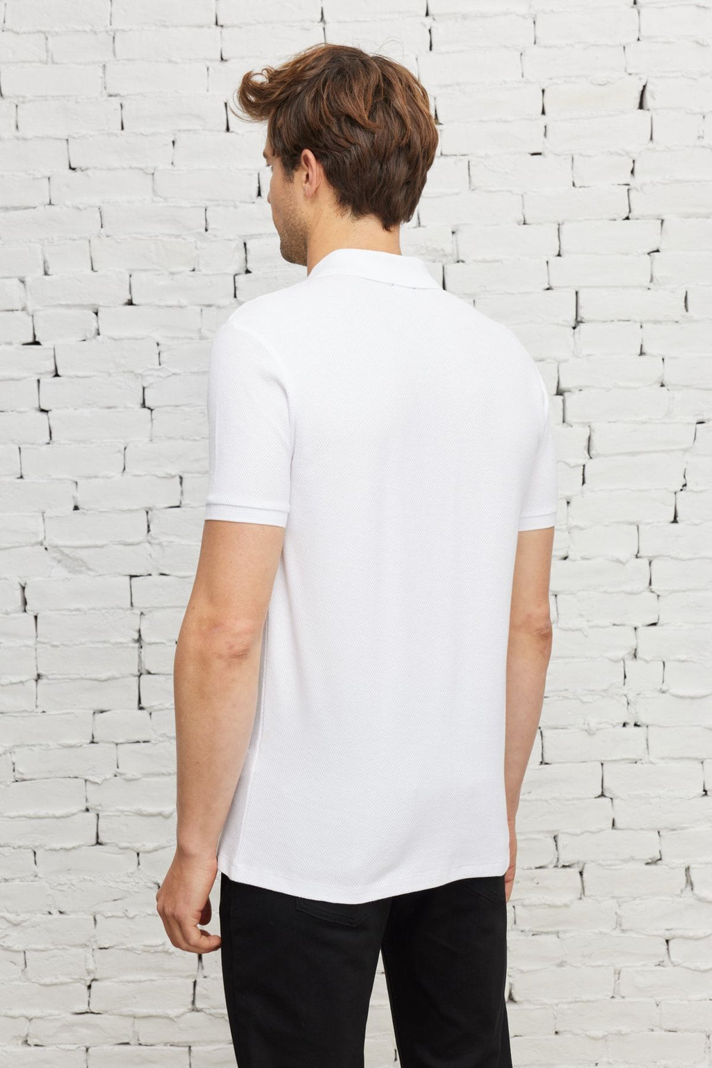 Men's white slim fit narrow cut polo collar 100 %cotton honeycomb pattern short sleeve t -shirt