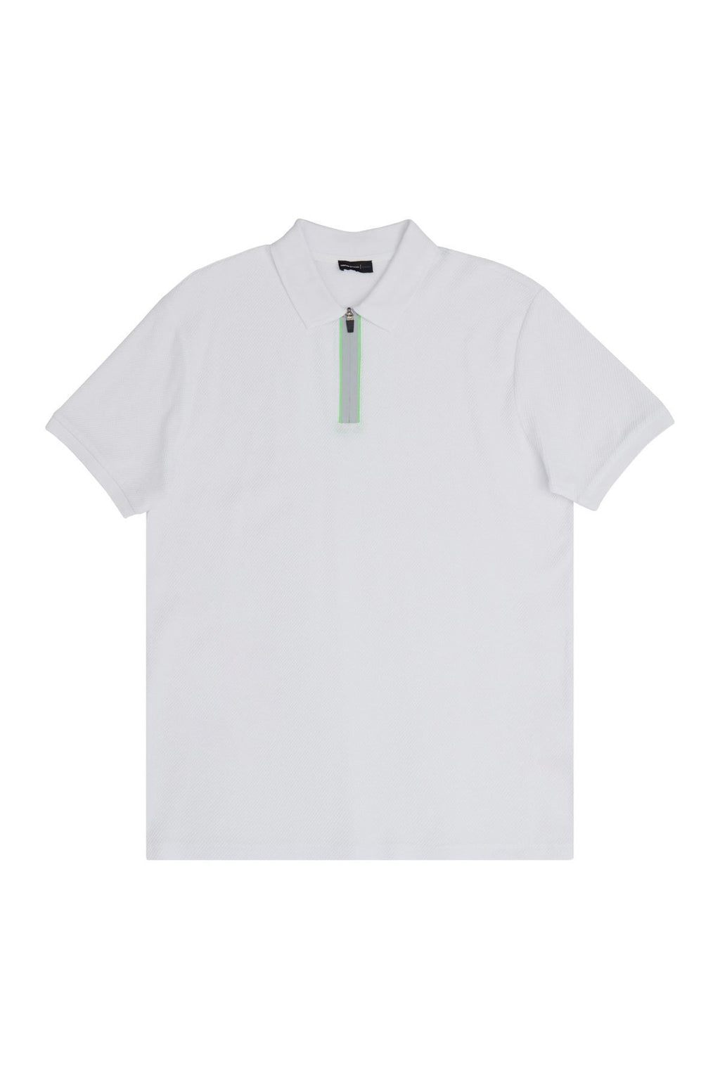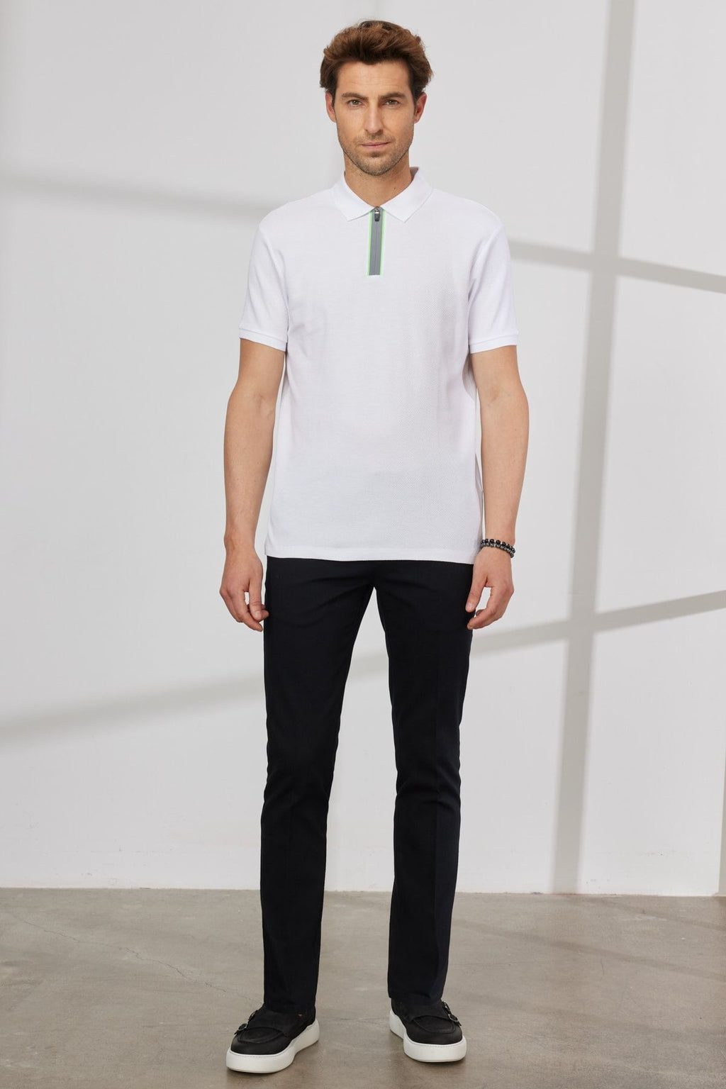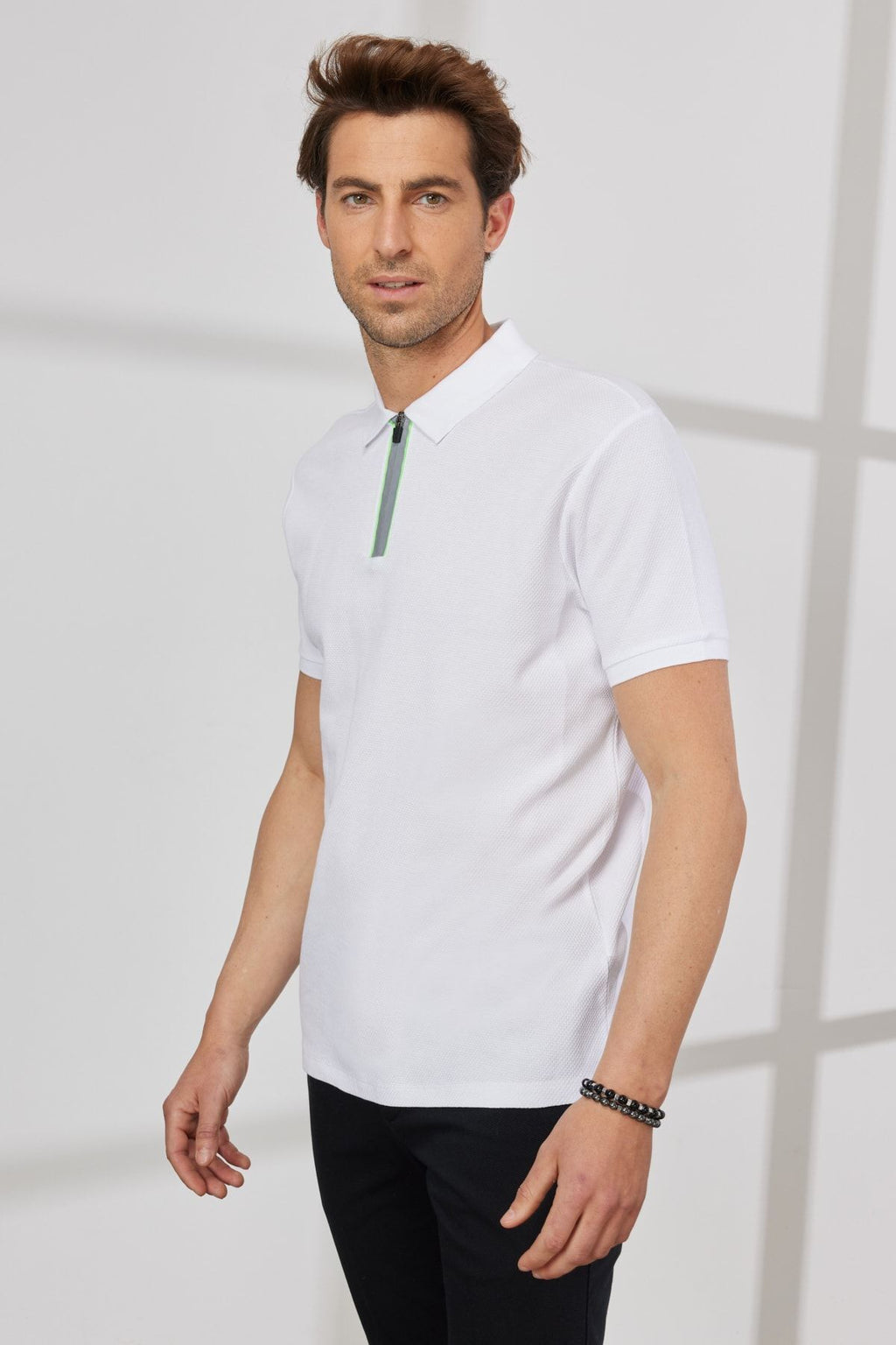 Men's white slim fit narrow cut polo collar 100 %cotton honeycomb pattern short sleeve t -shirt