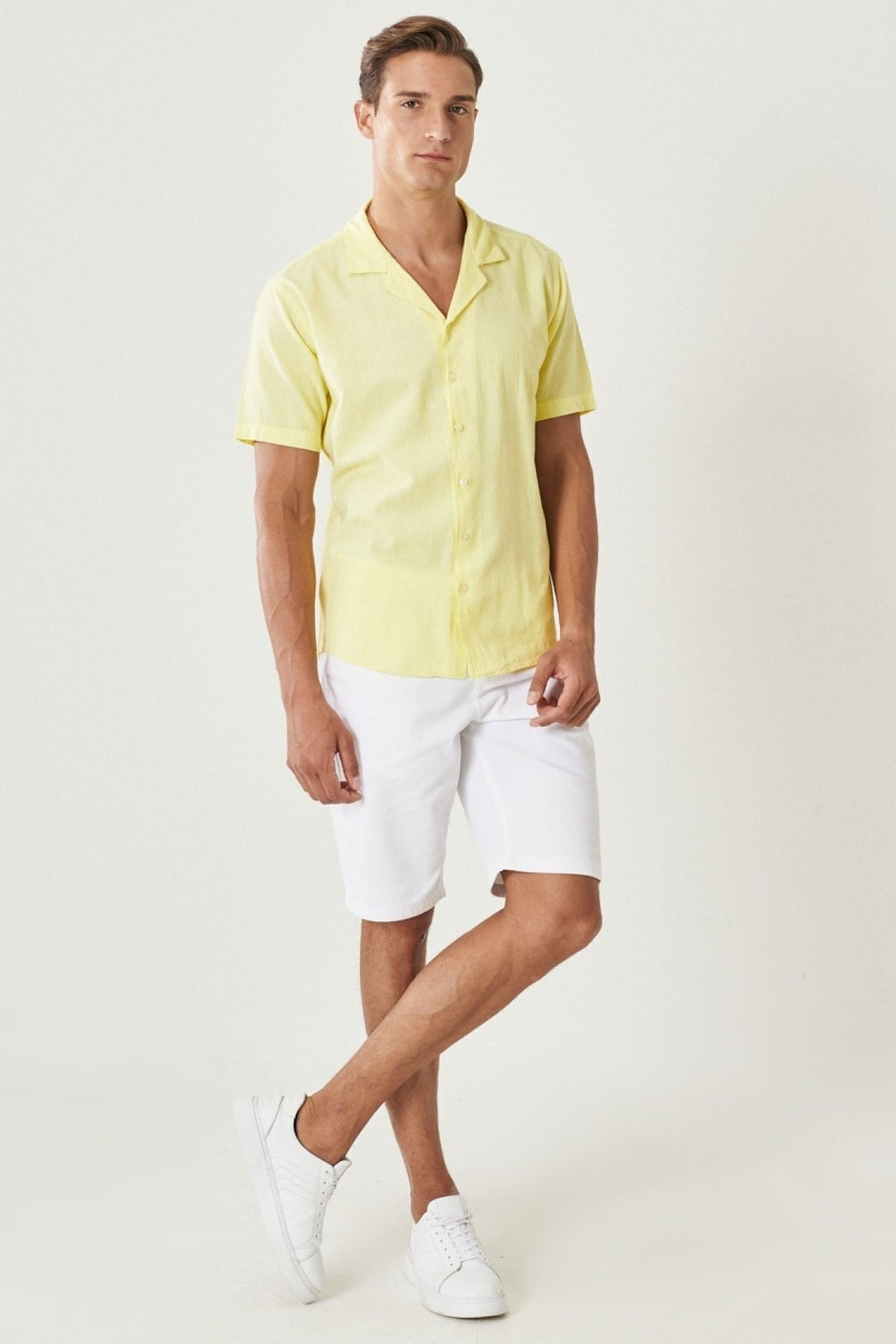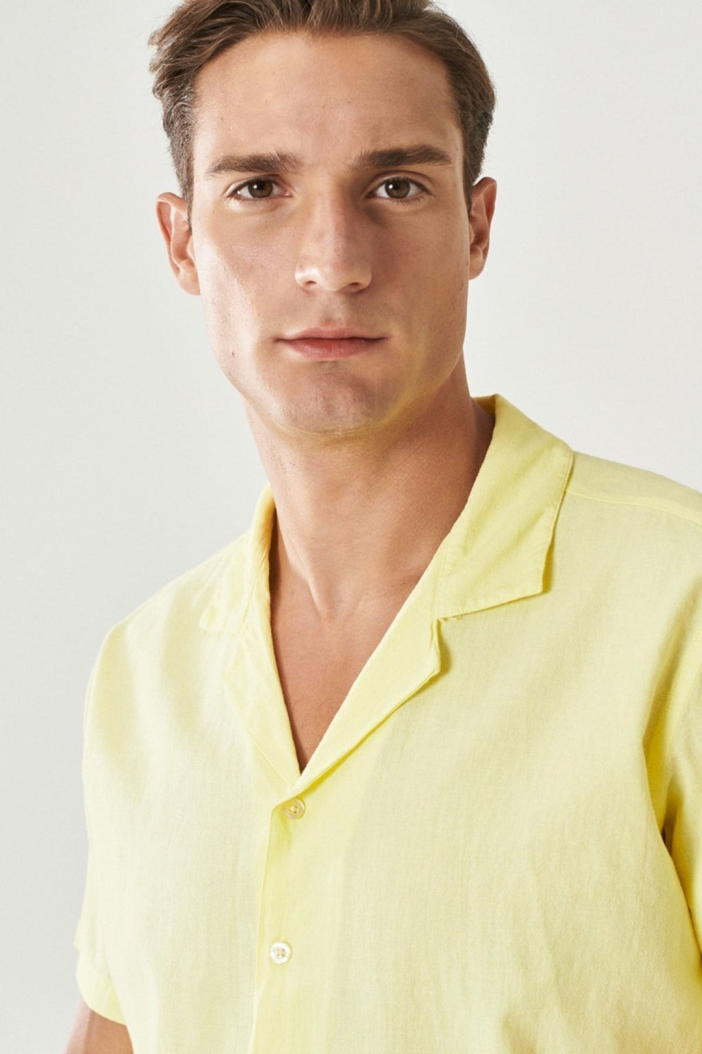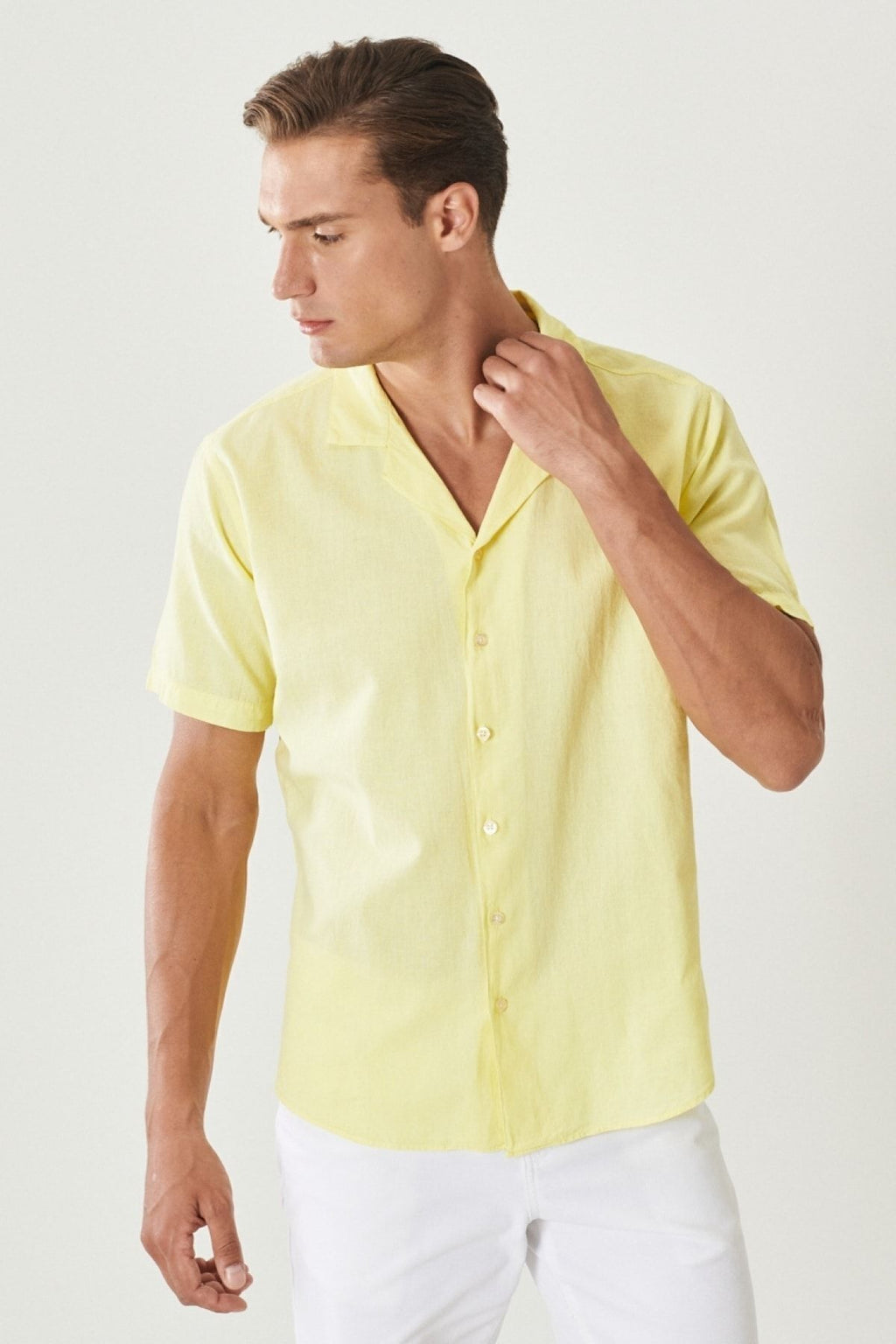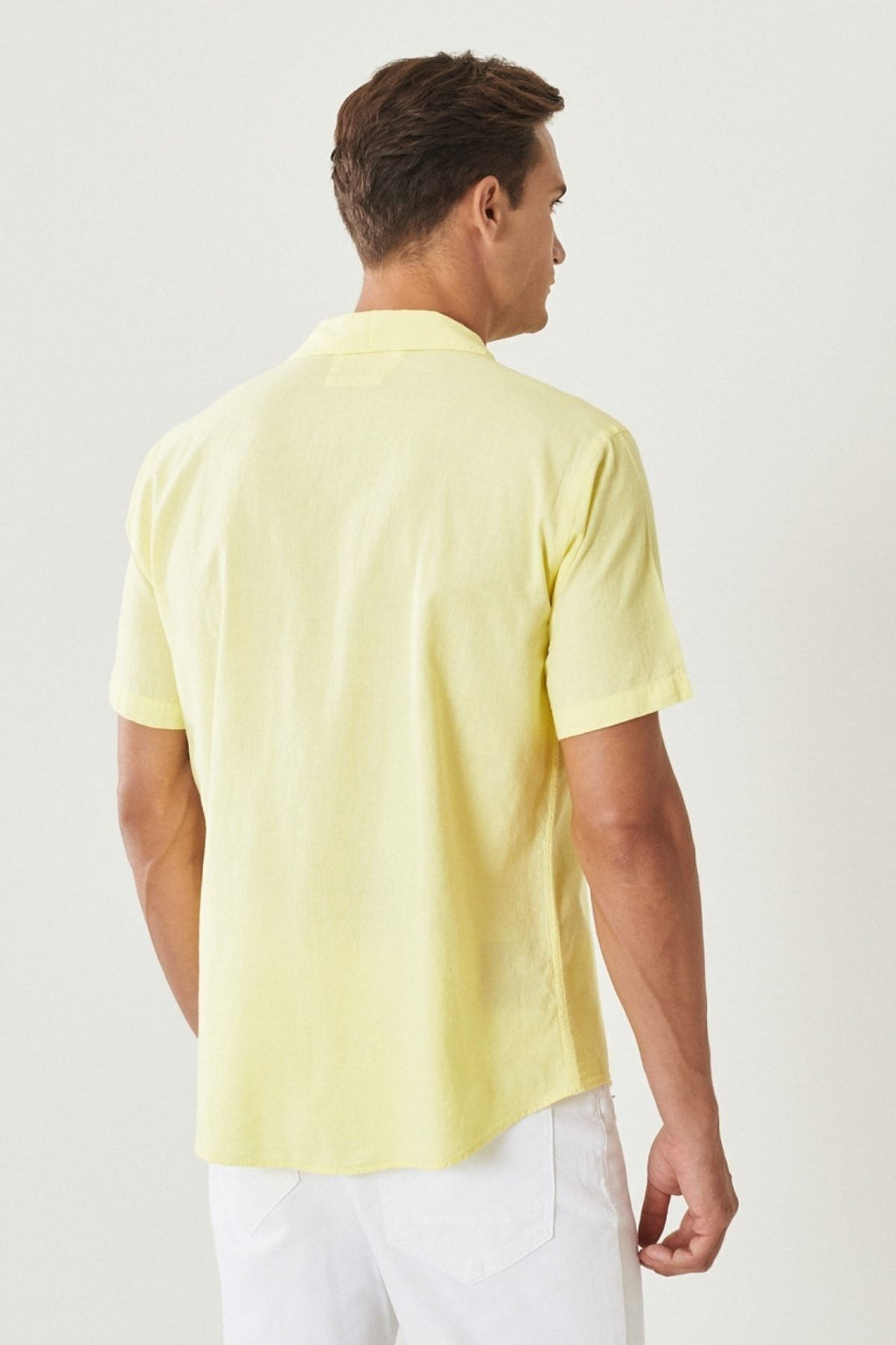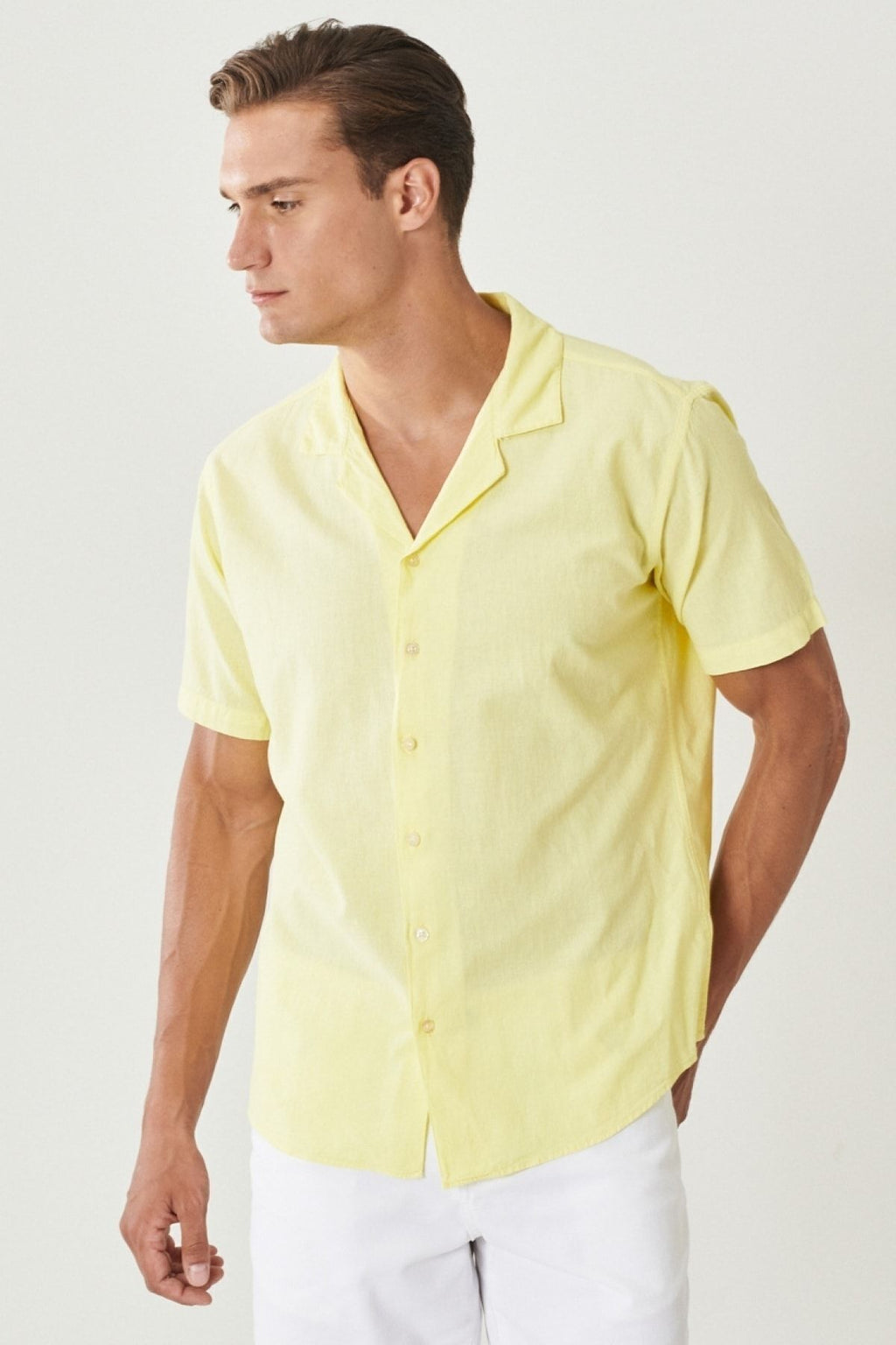 Men's yellow linen comfort fit comfortable cut mono collar short sleeve flat shirt