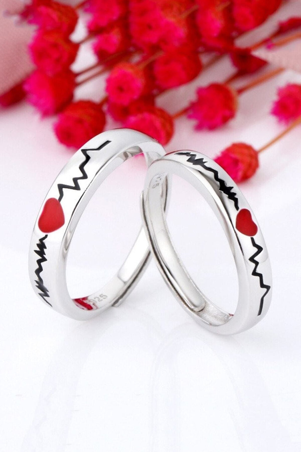 Kırmızı Kalp Ritmi Motifli Gümüş Kaplama Ayarlanabilir Çift Alyans Yüzük