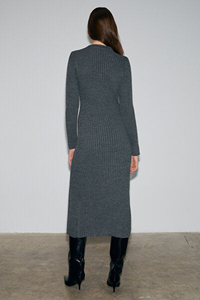 SOREYA Women's Round Neck Stripe Patterned Slit Slim Fit Knitwear Anthracite Dress