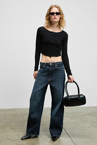 SWAY Women's Round Neck Functional Button Front Stretchy Fabric Crop Black Blouse