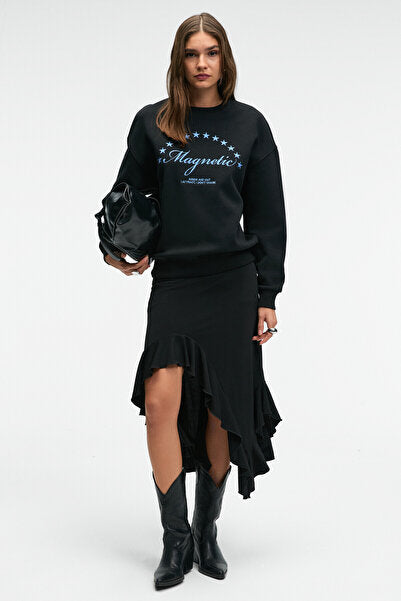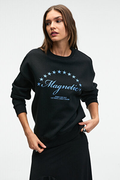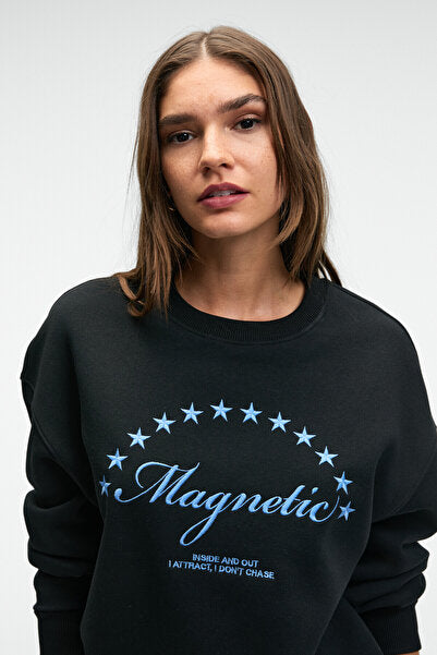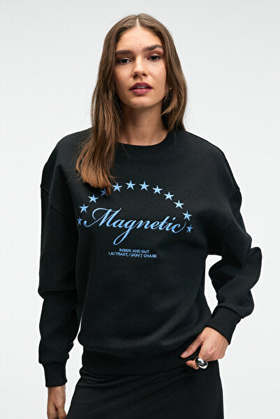 VISTARA Women's Embroidery Detailed Round Neck Regular Fit Black Sweatshirt