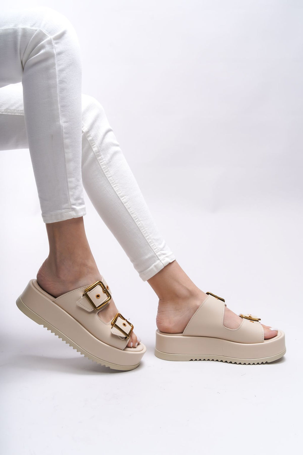 Winledha Kadın Çift Tokalı Terlik 001278 Bej Cilt