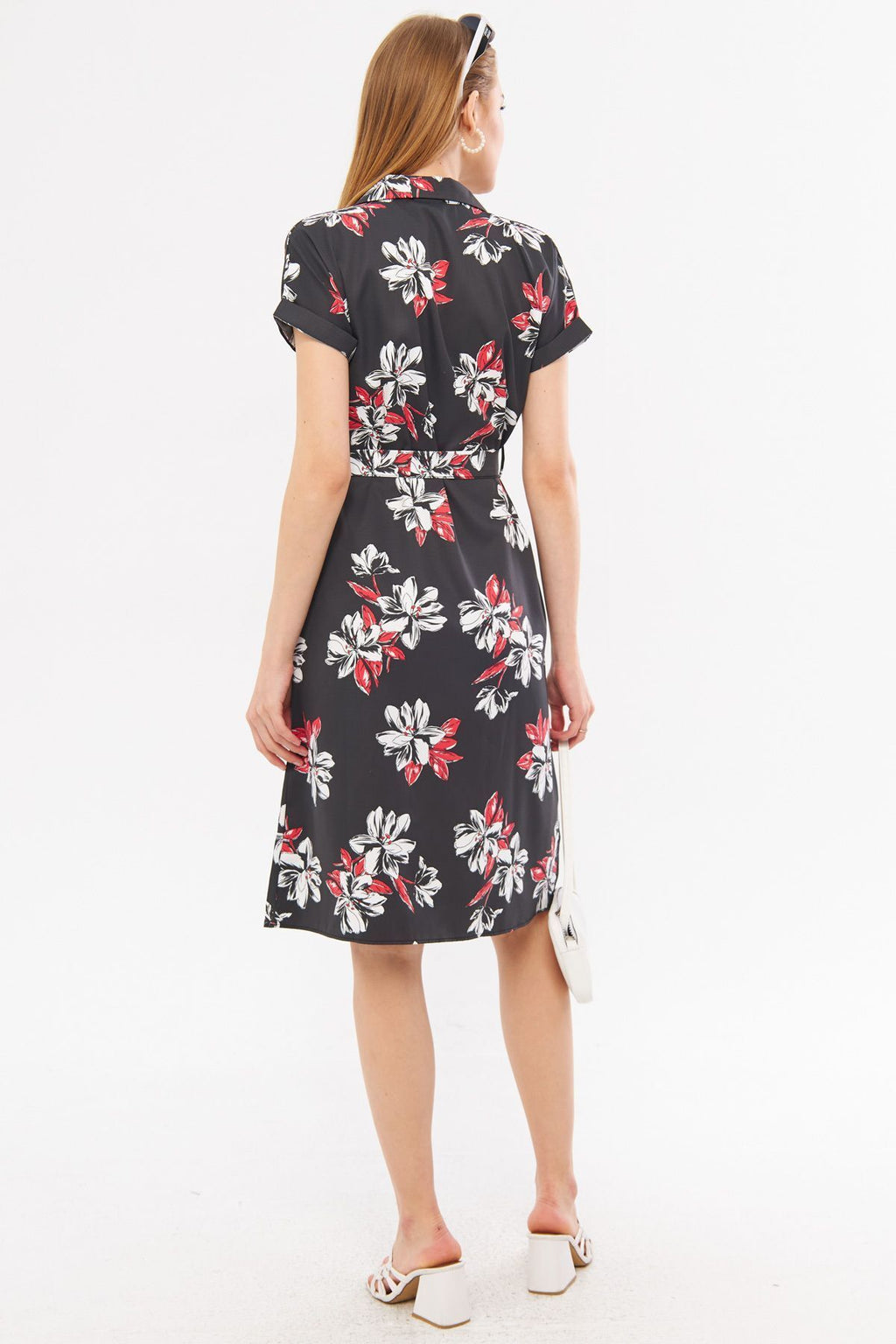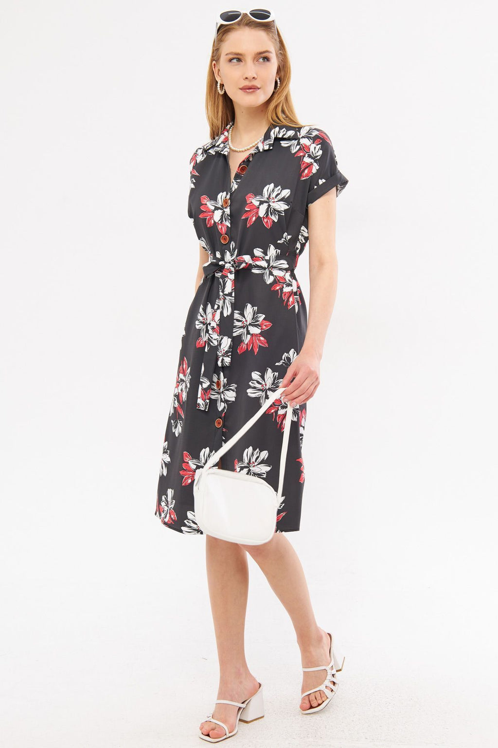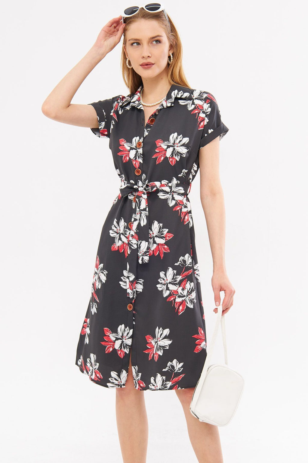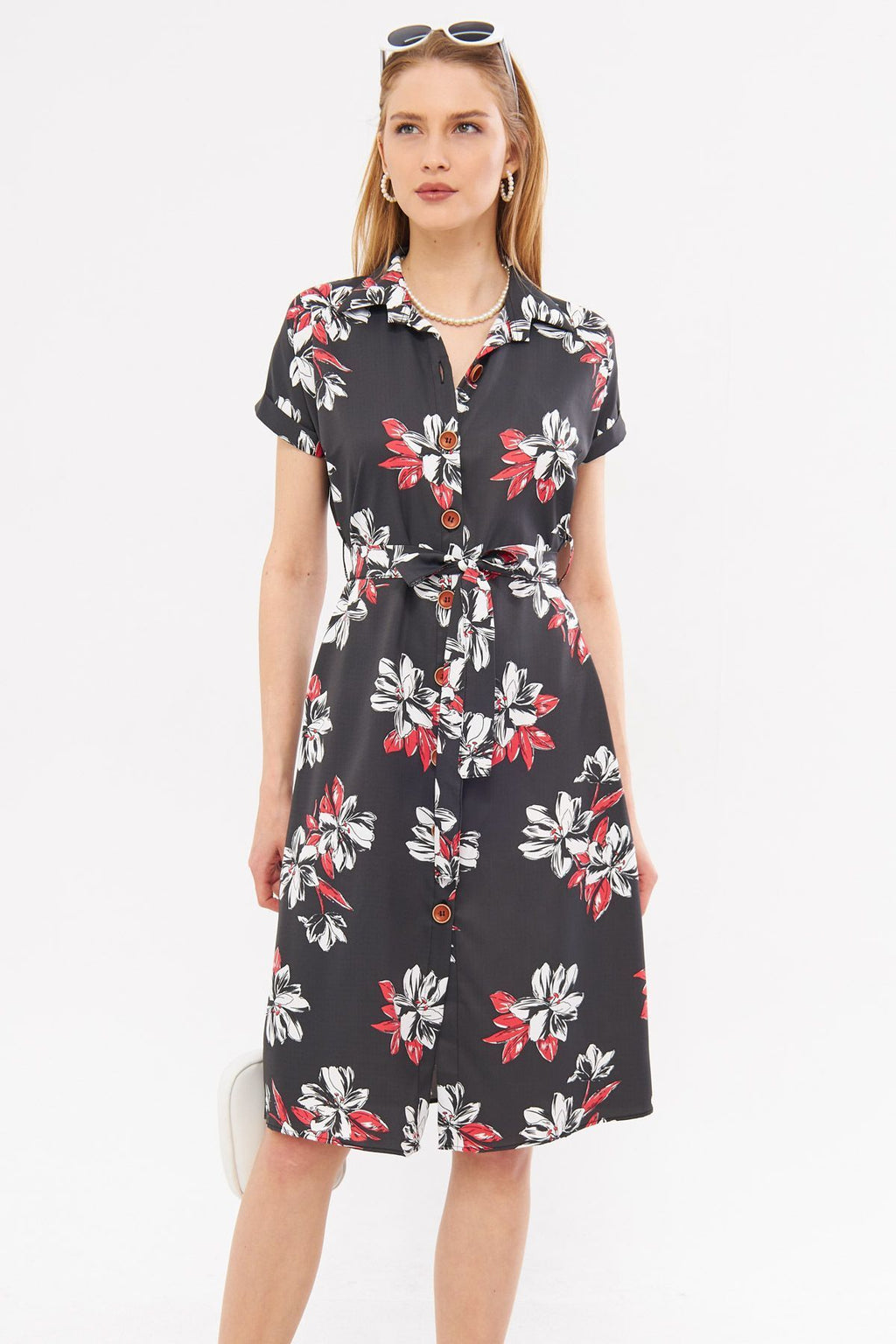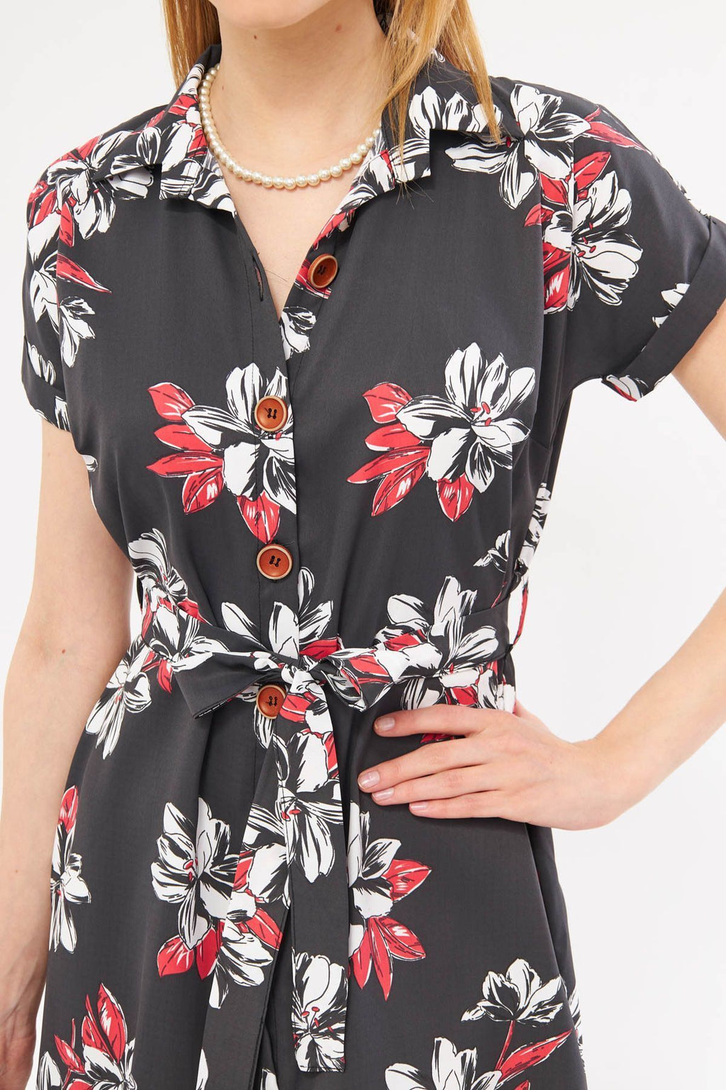 Woman anthracite Large Flower Waist Belt Short Sleeve Shirt Dress ARM-221007