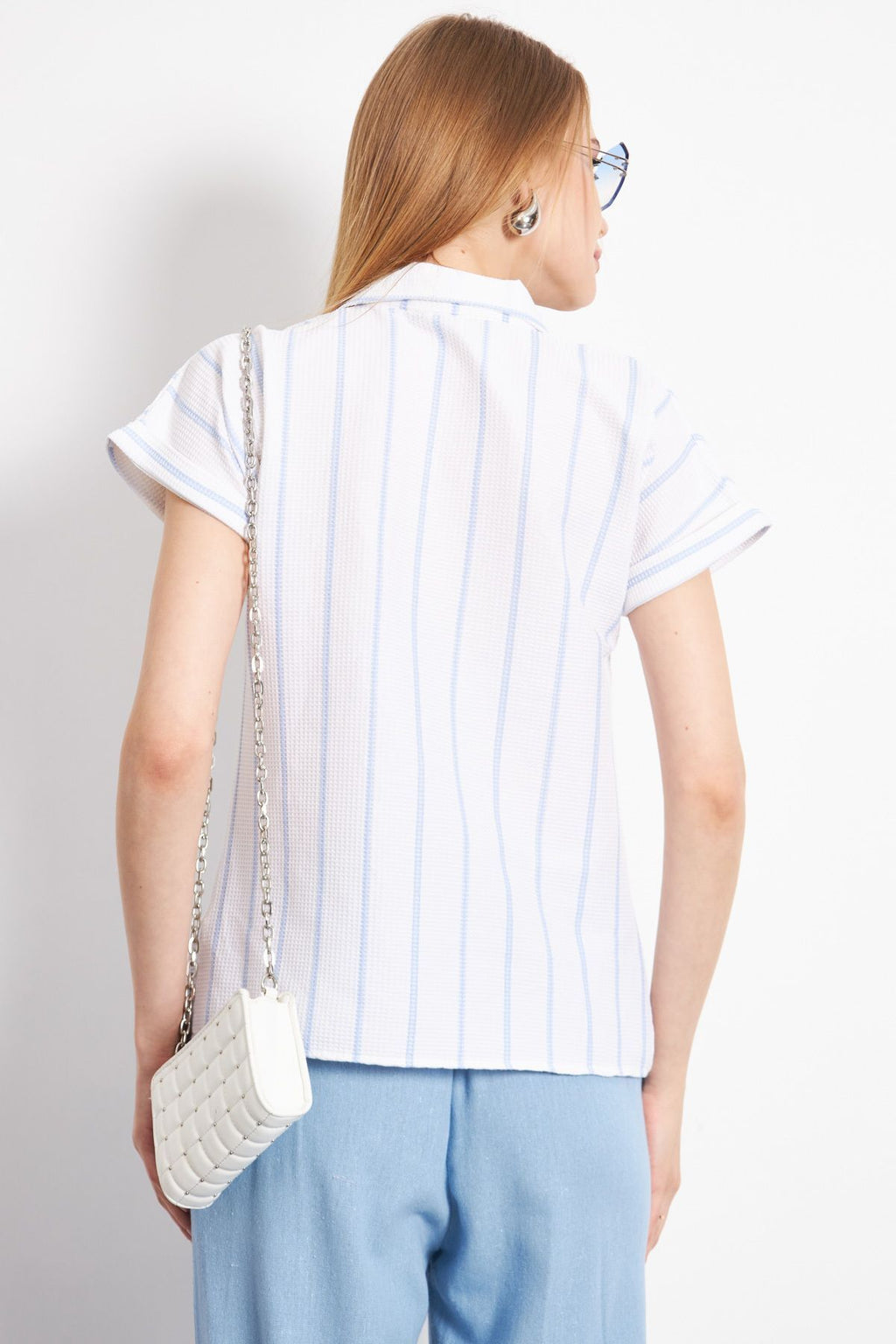 Woman Baby Blue Striped Short Sleeve Shirt ARM-24Y001067