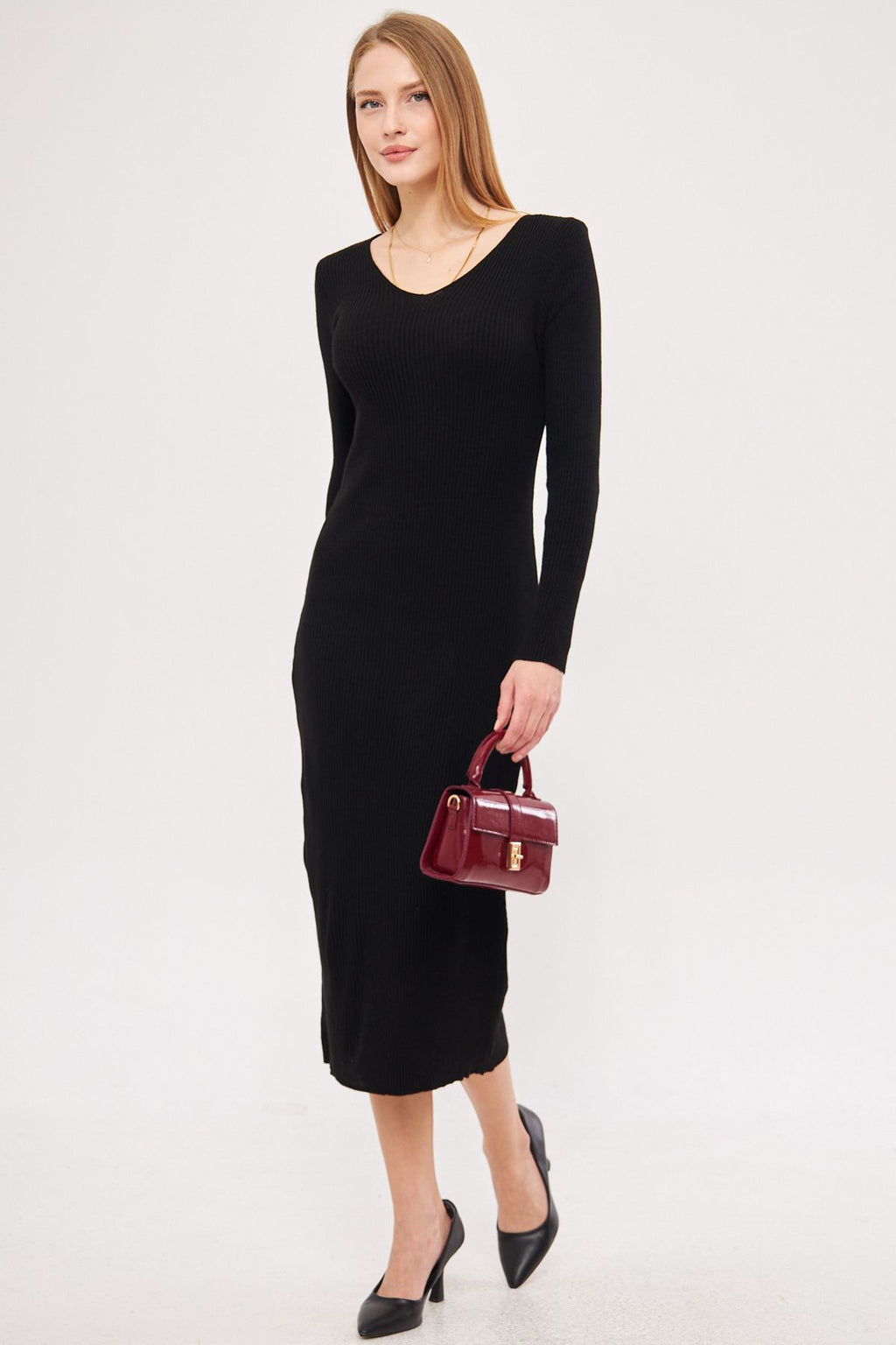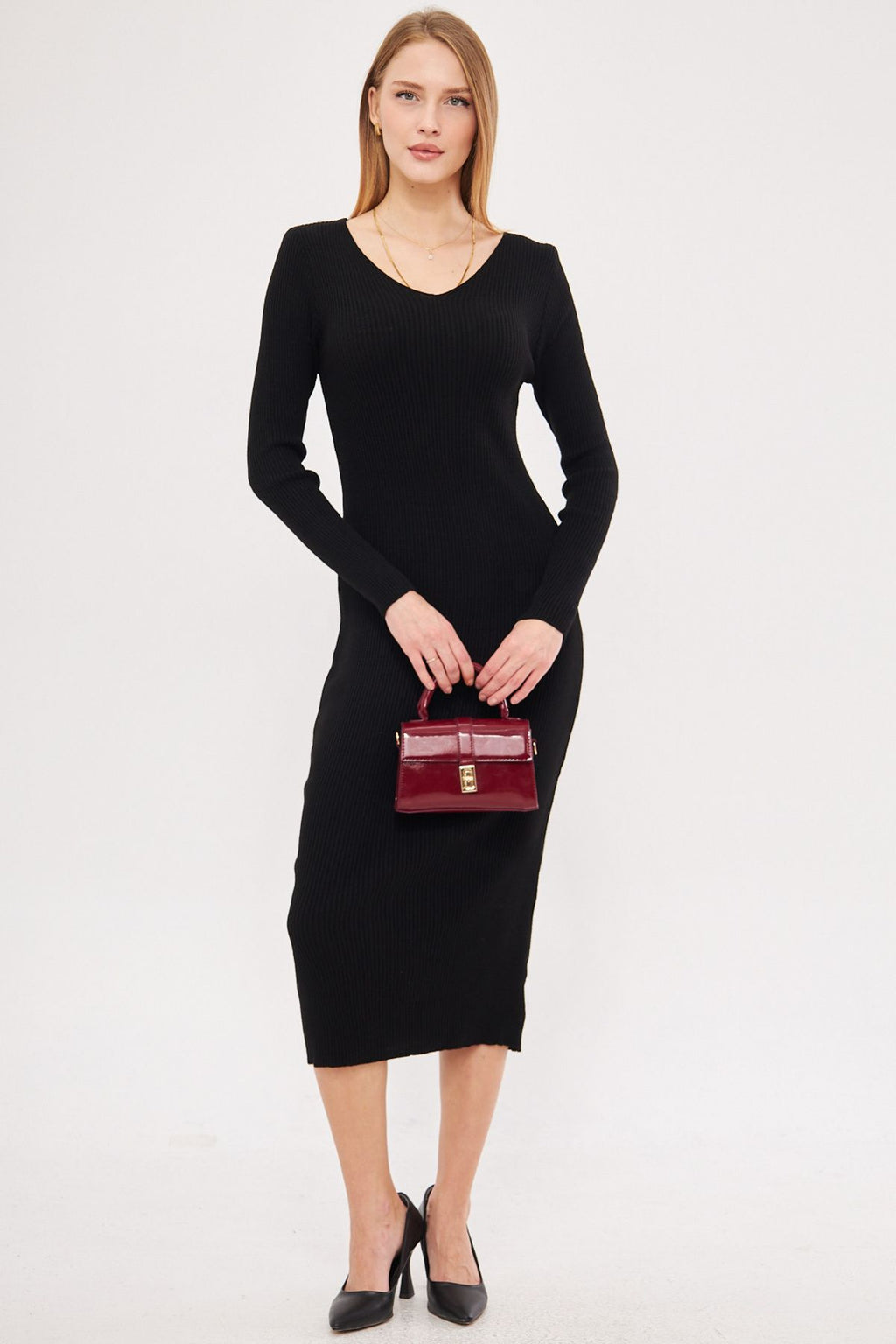 Woman Black V-Neck Long Knitwear Dress ARM-24K012012