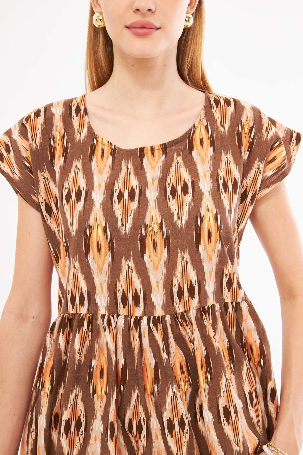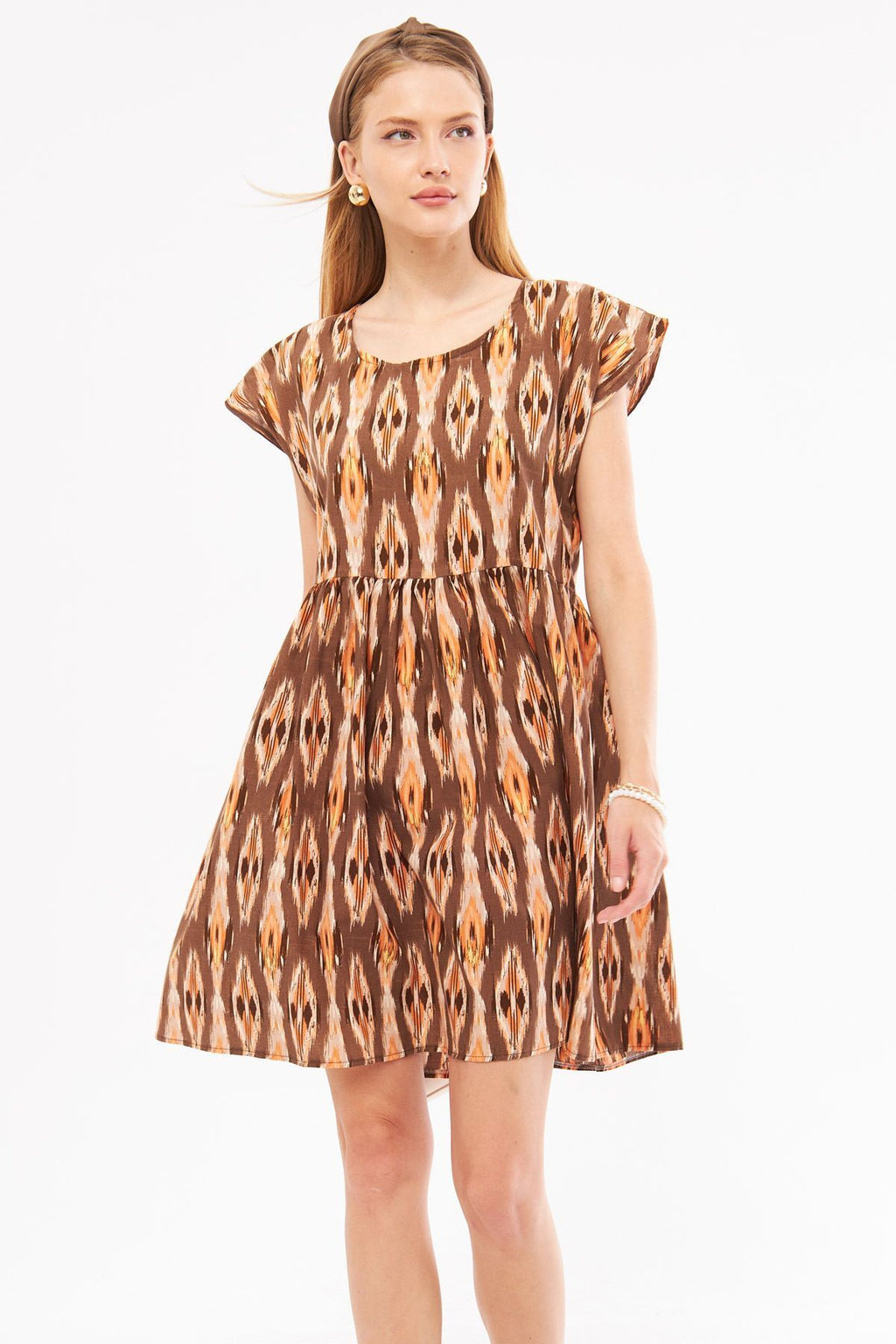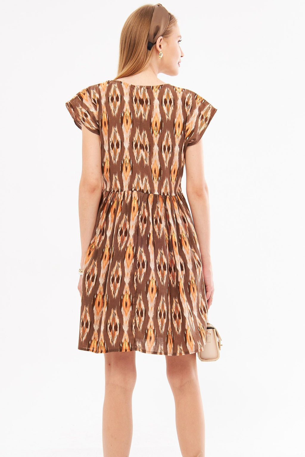Woman Coffee Ethnic Patterned Waist Waist Shirred Mini Dress ARM-24Y001082