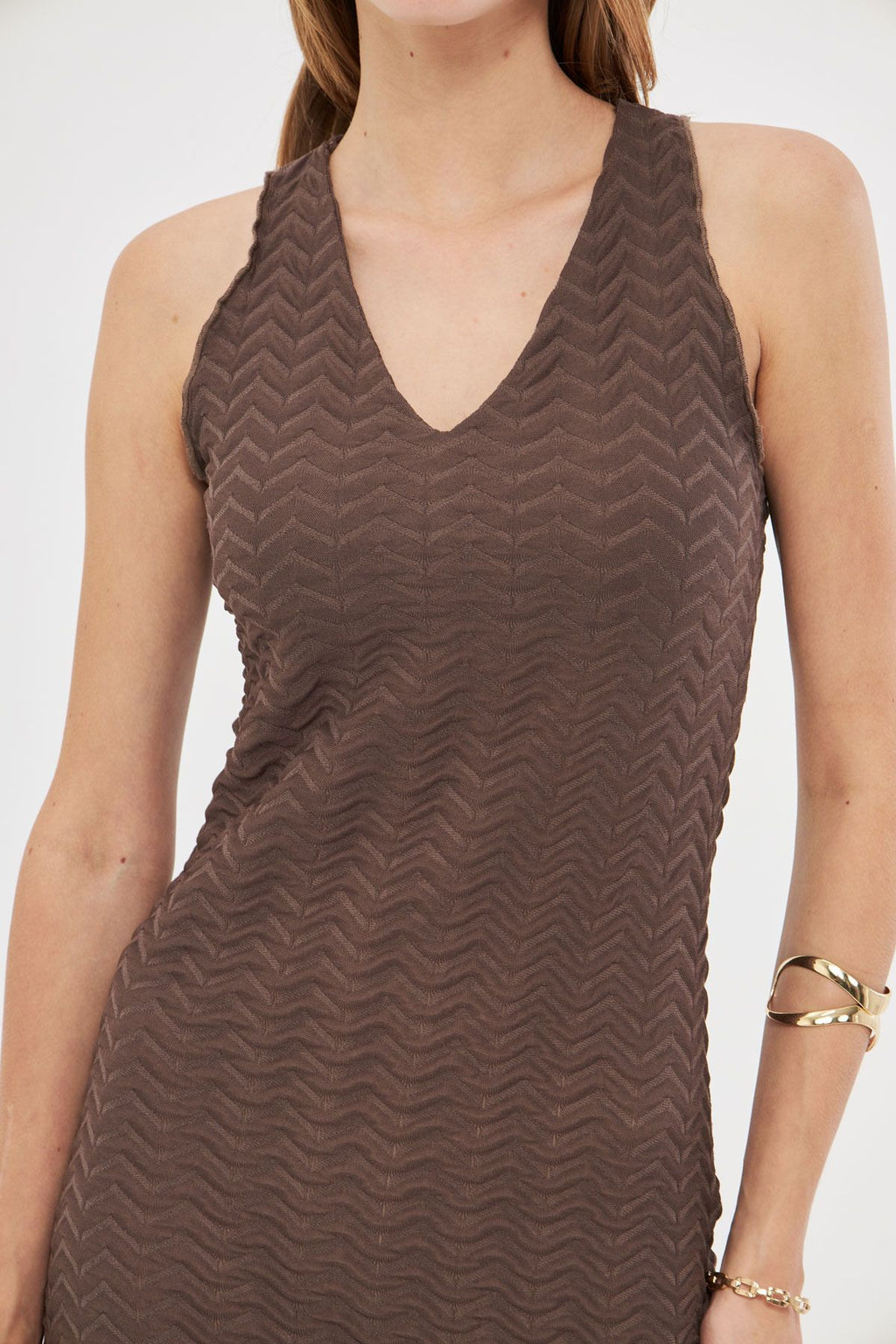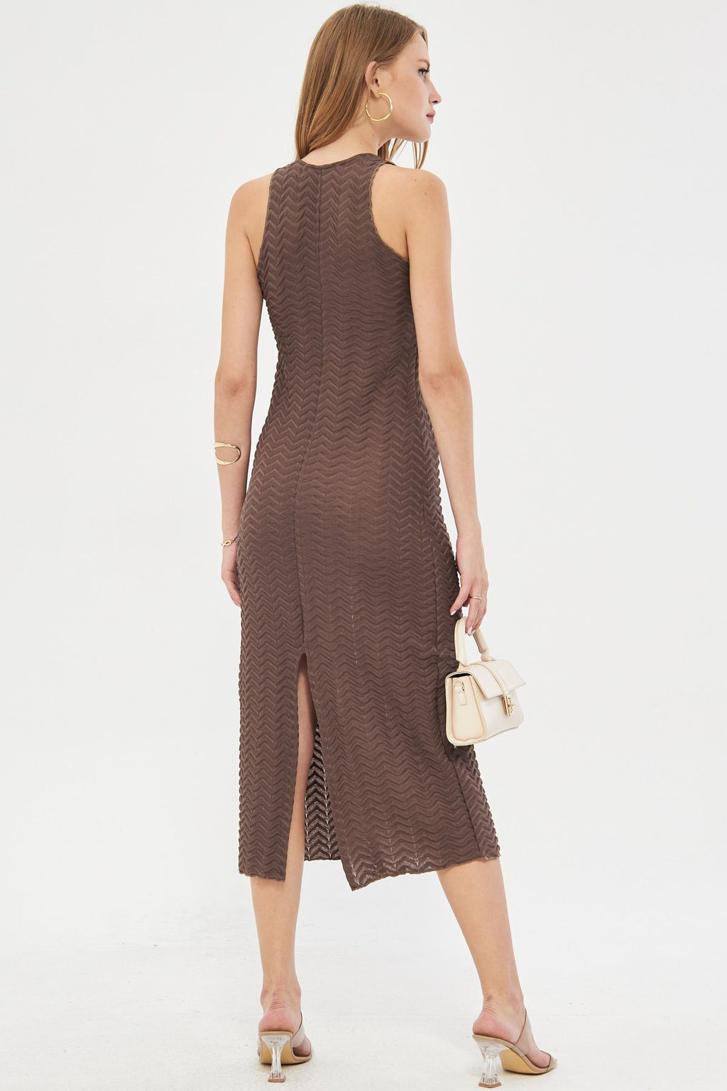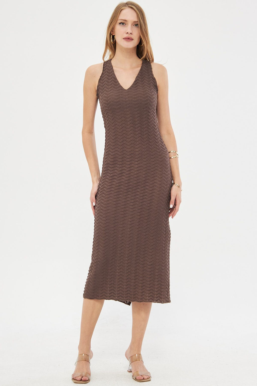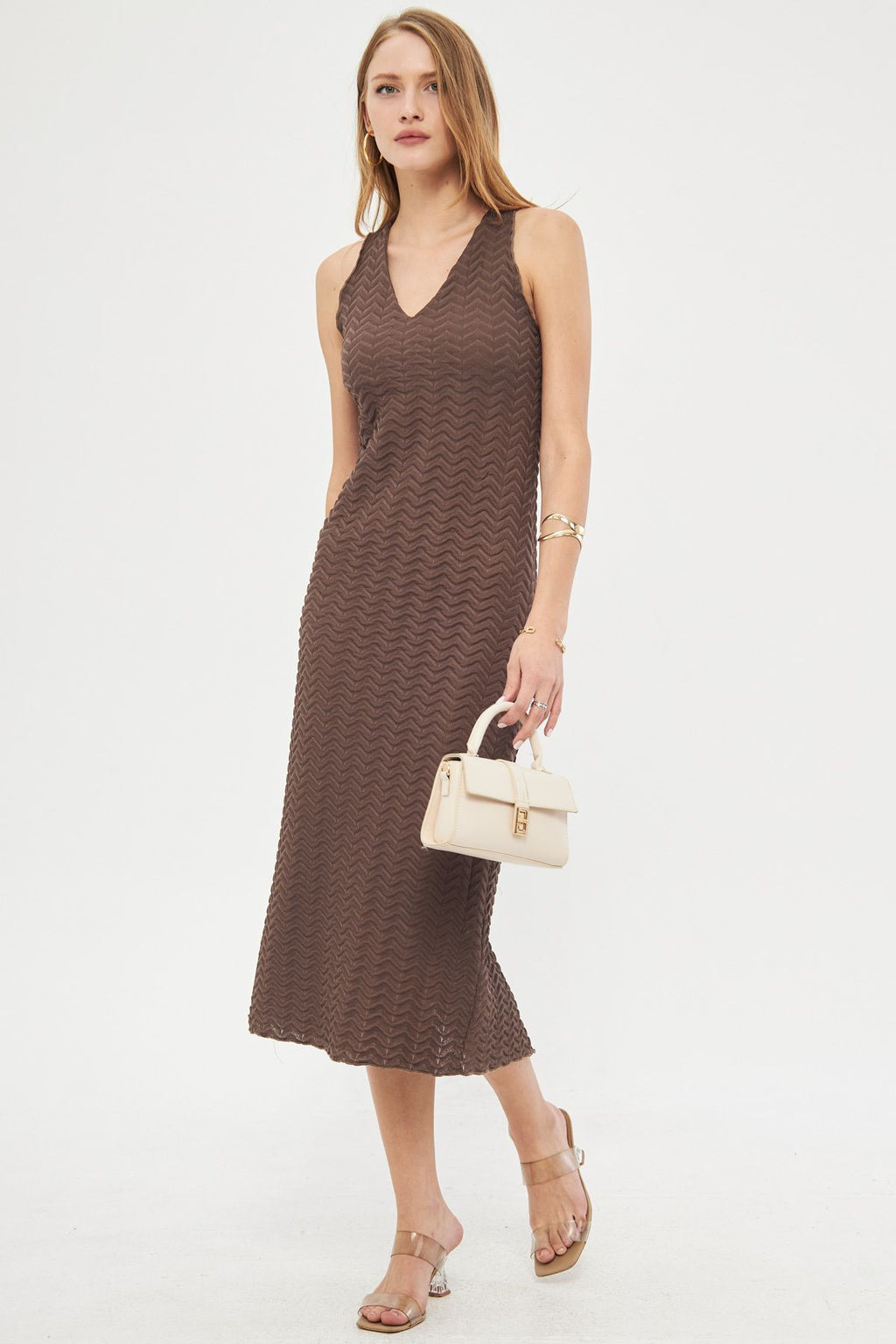 Woman Coffee V-Neck Sitting Behind Behind Slitting Patterned Midi Boy Dress ARM-24Y001102