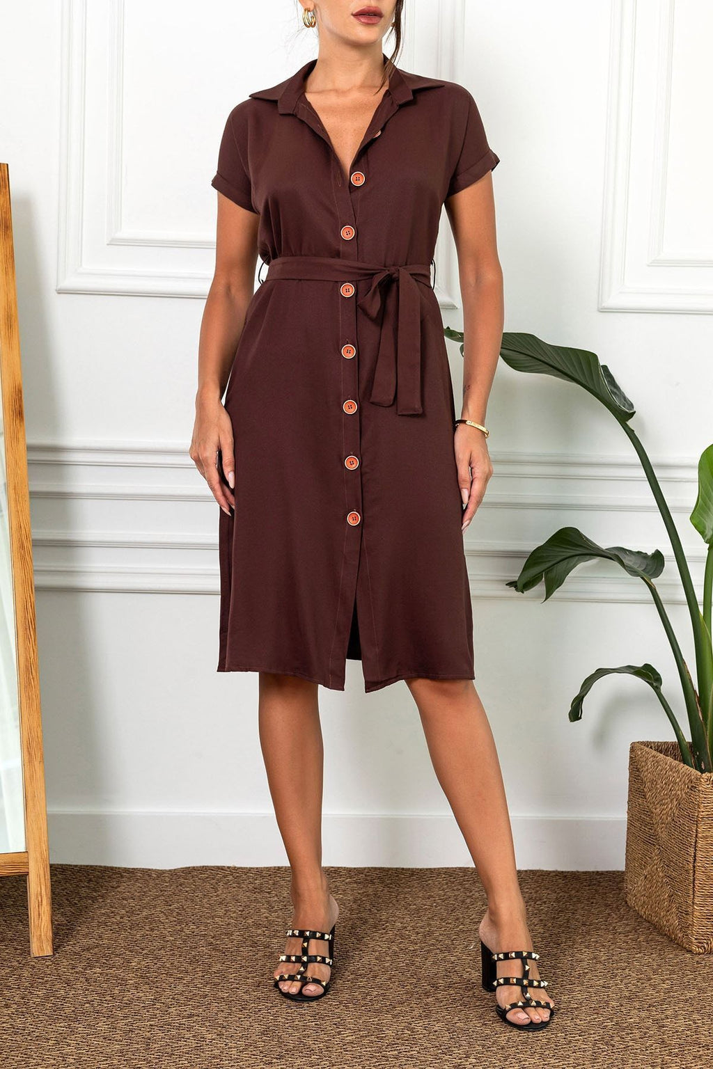 Woman Coffee Waist Belt Short Sleeve Shirt Dress ARM-19Y001068