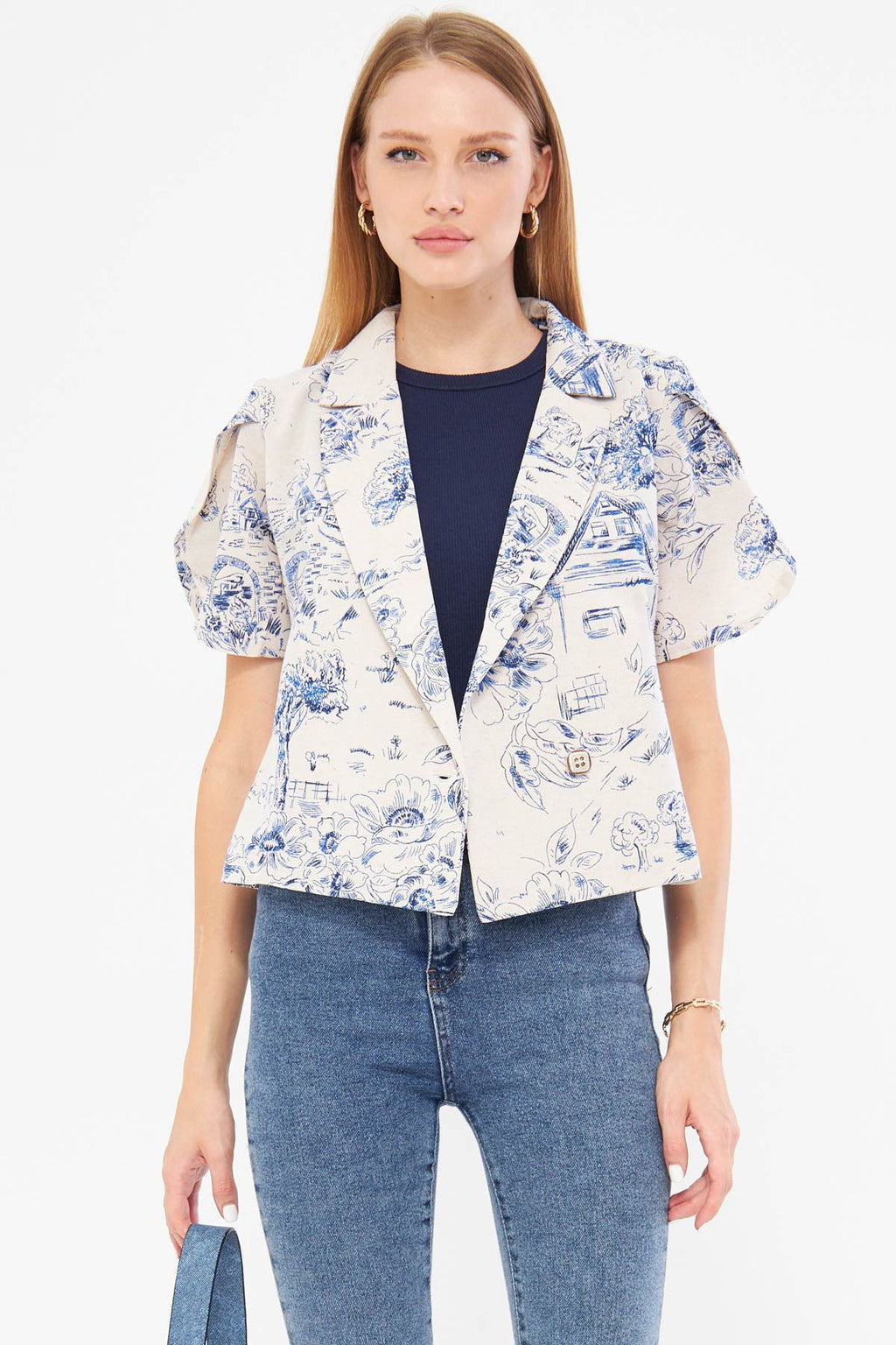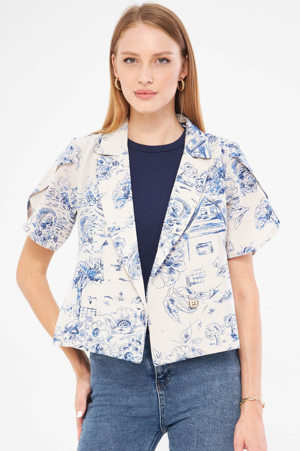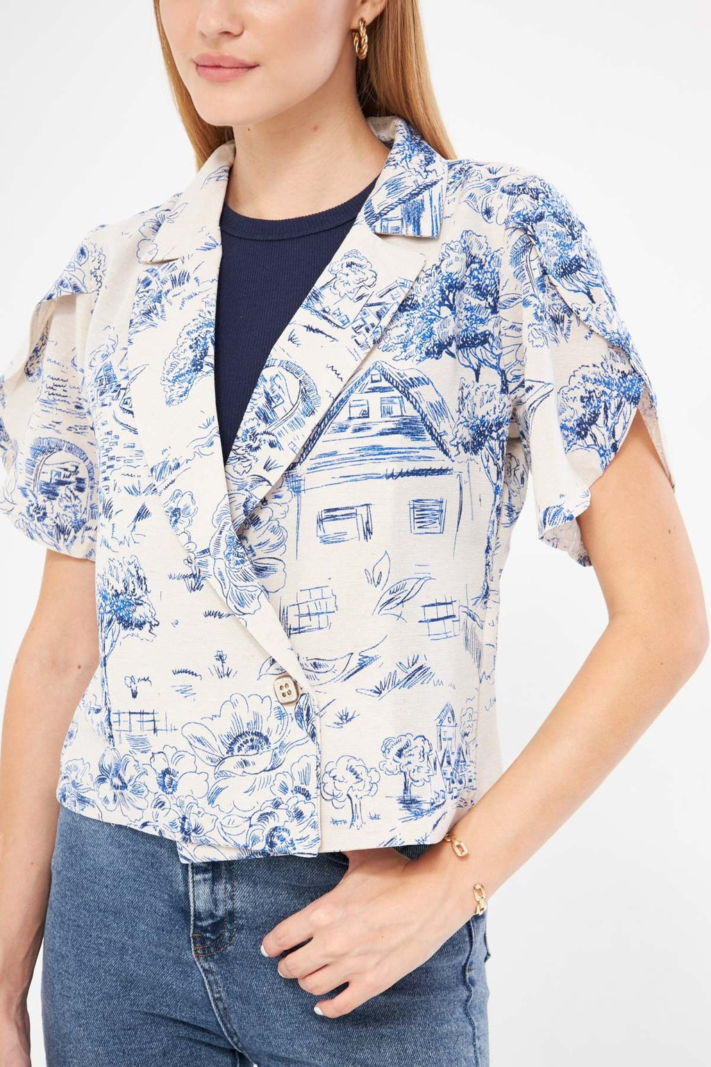 Woman Dark Blue Linen Looking Patterned Band Slit Crop Short Sleeve Jacket ARM-24Y001095