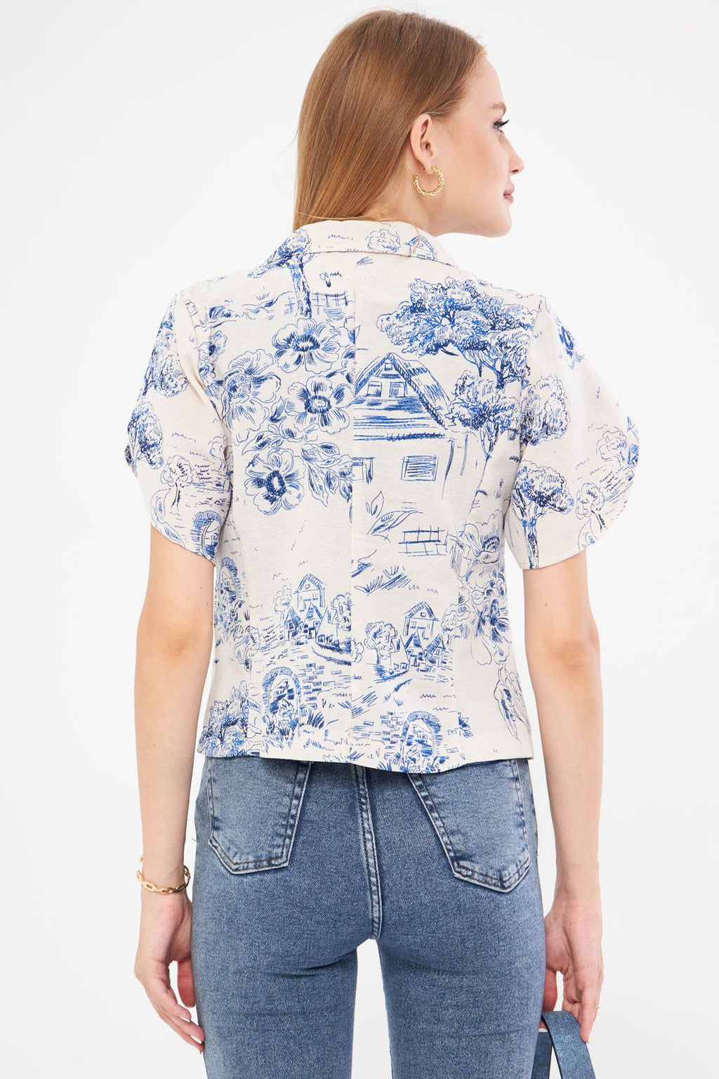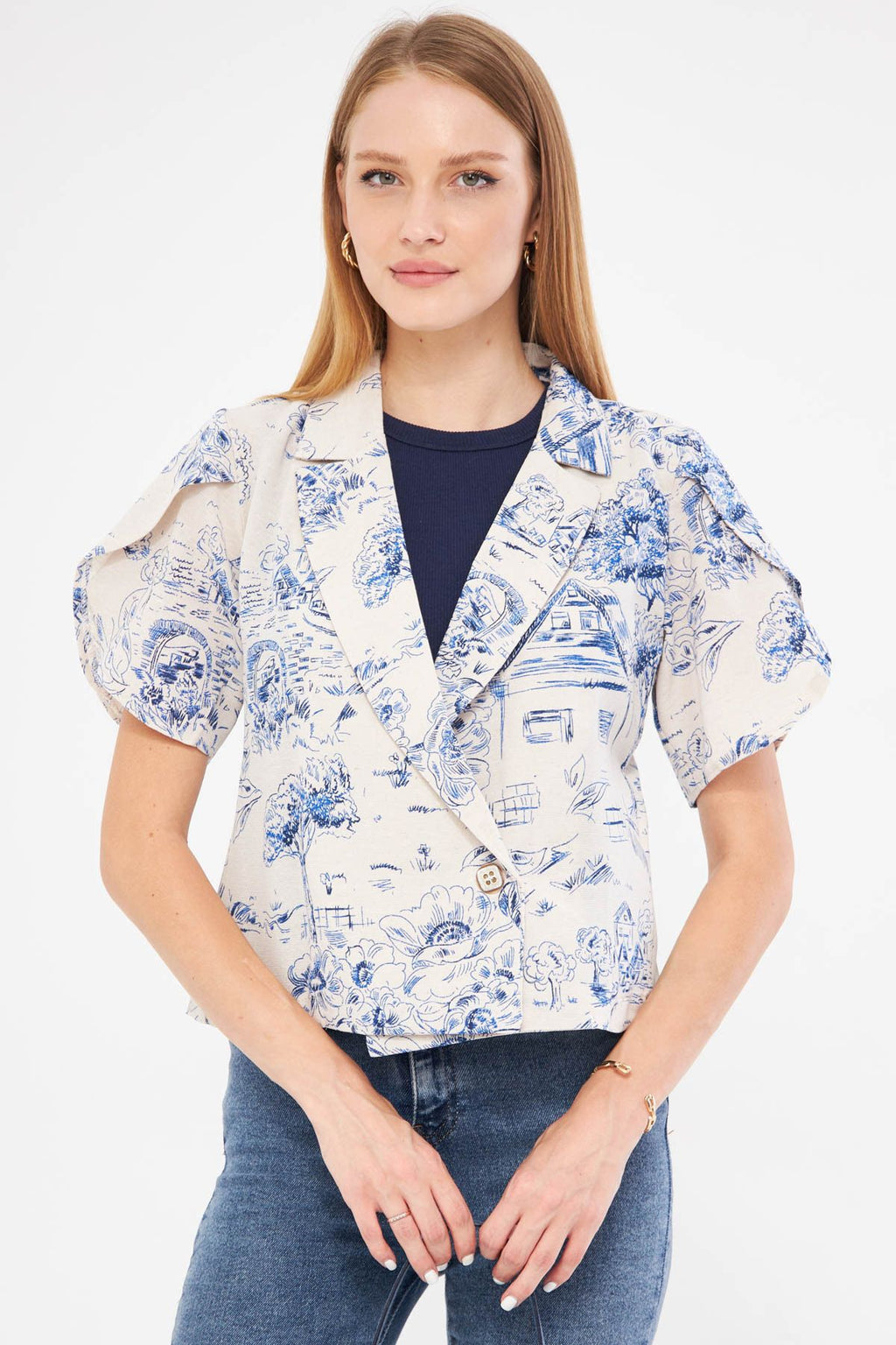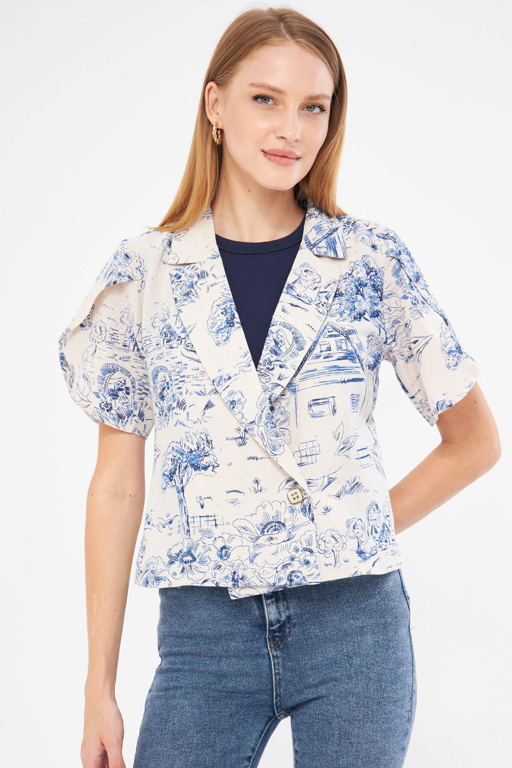 Woman Dark Blue Linen Looking Patterned Band Slit Crop Short Sleeve Jacket ARM-24Y001095