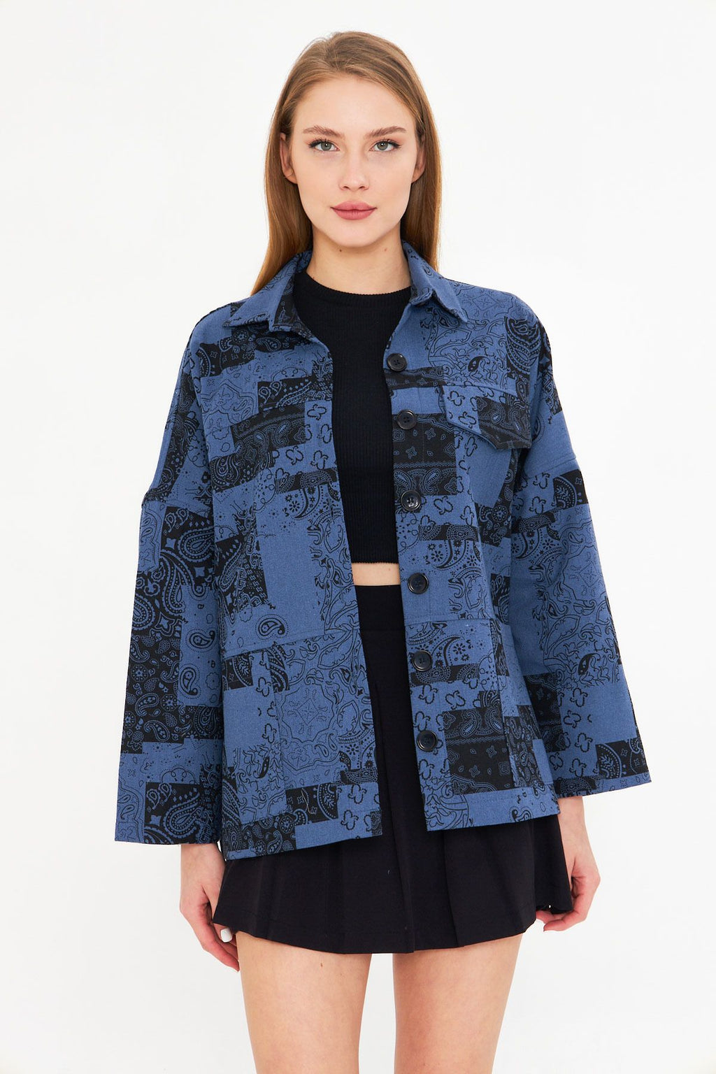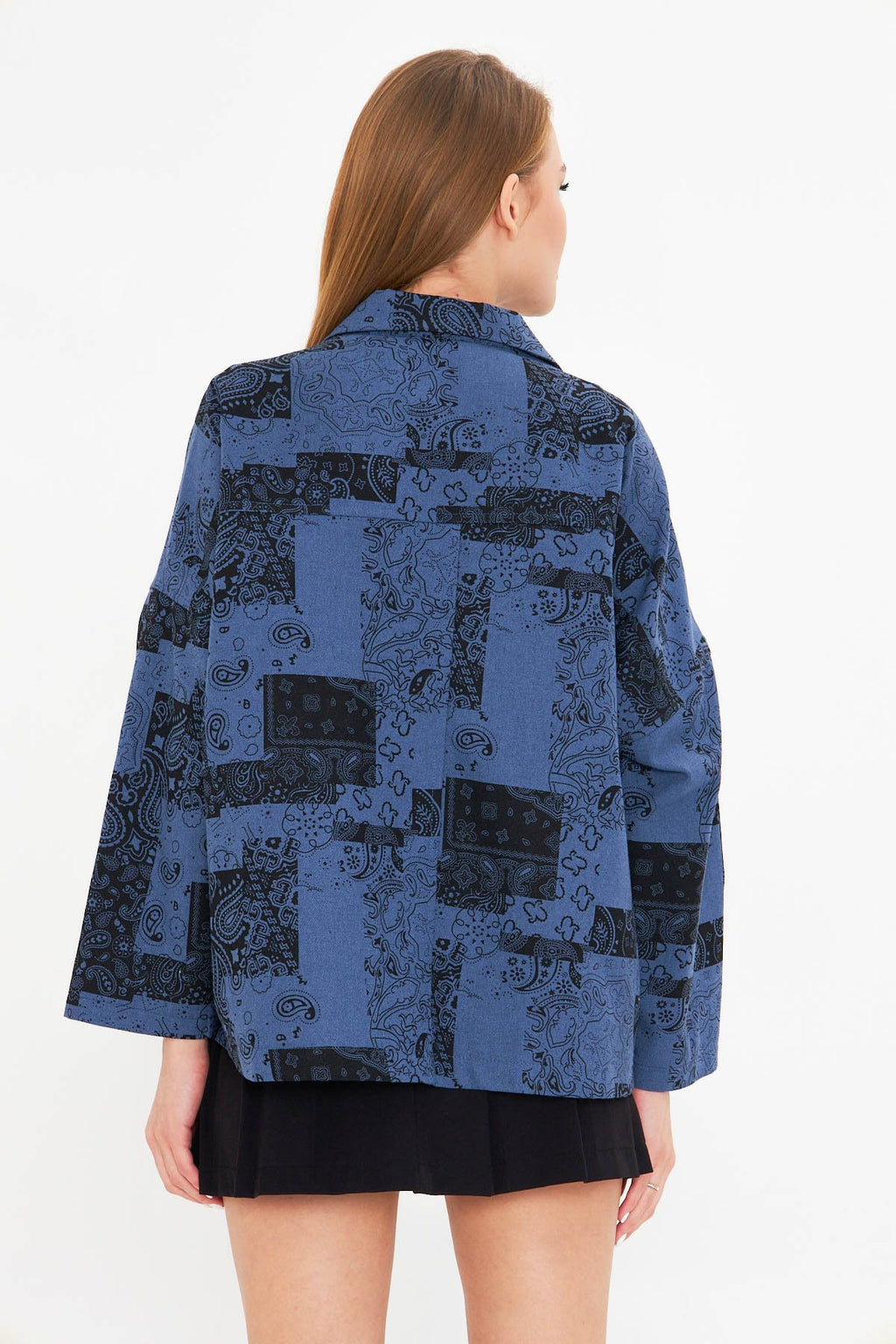 Woman Dark Blue Patterned Pocket Detail Shirt Jacket ARM-25K001071
