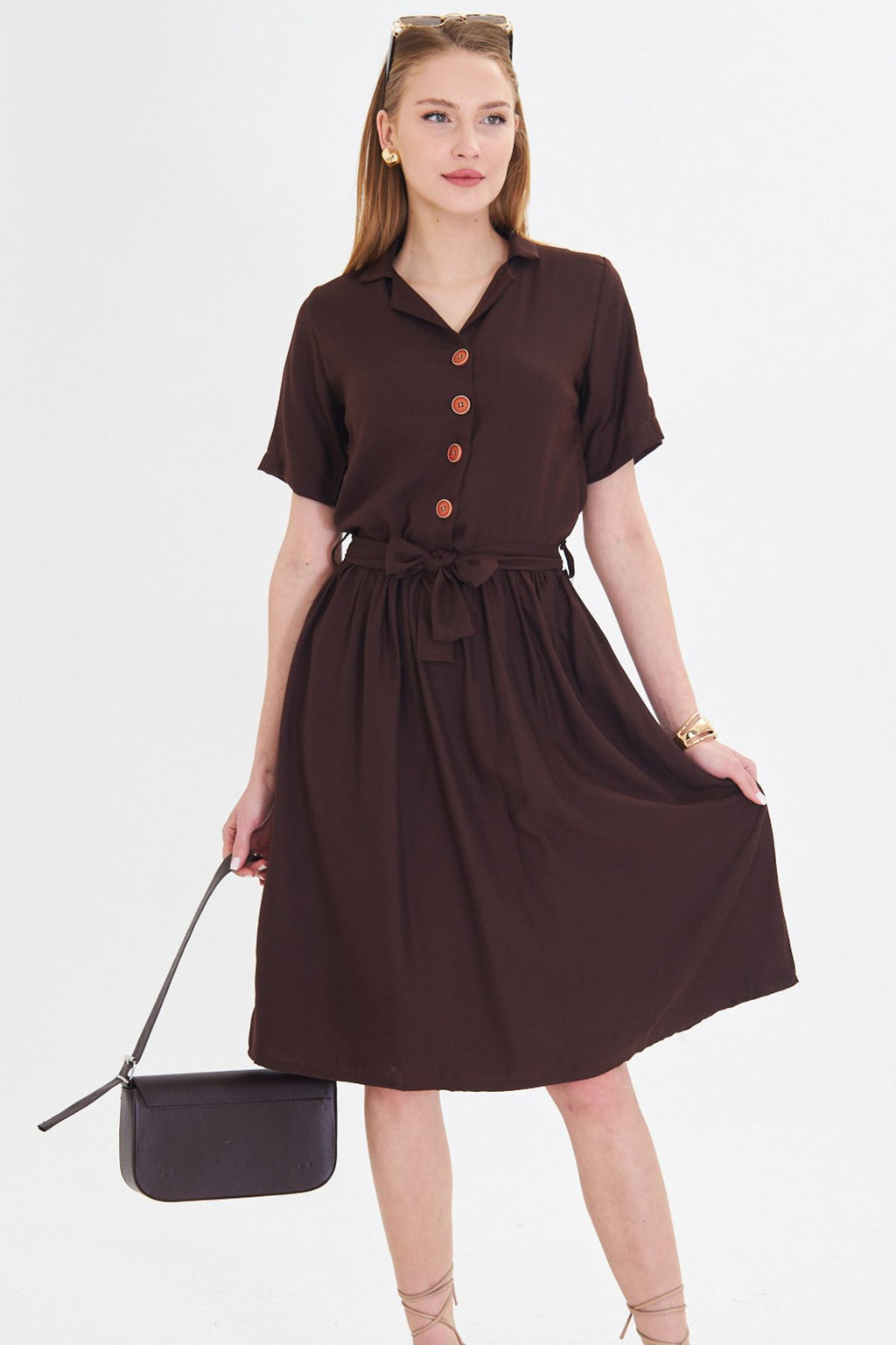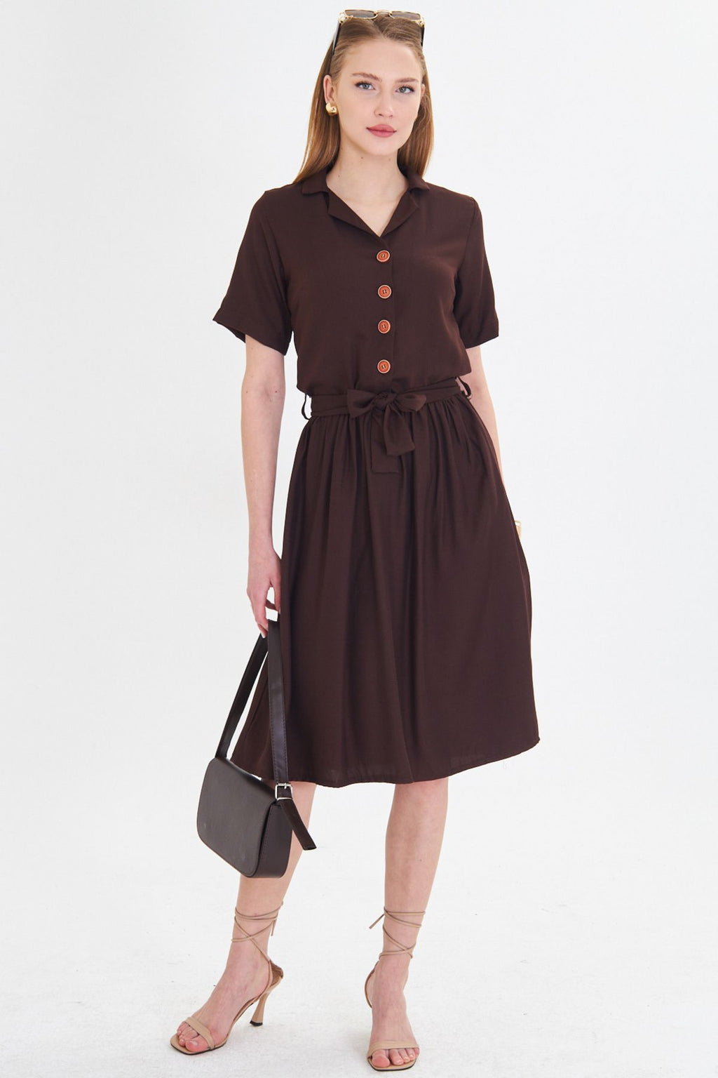 Woman Dark Brown front buttoned waist shirred belt midi size dress ARM-24Y001068