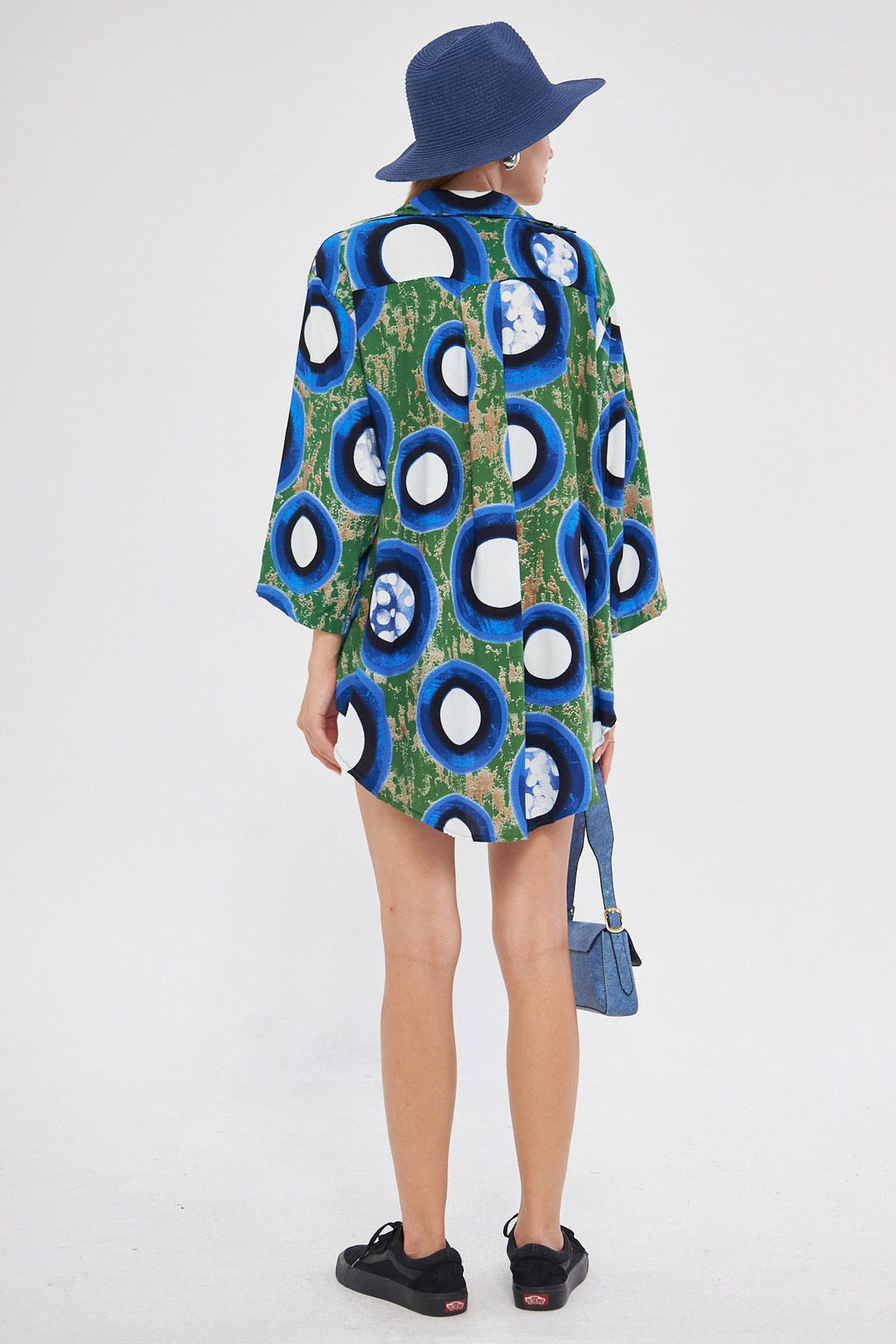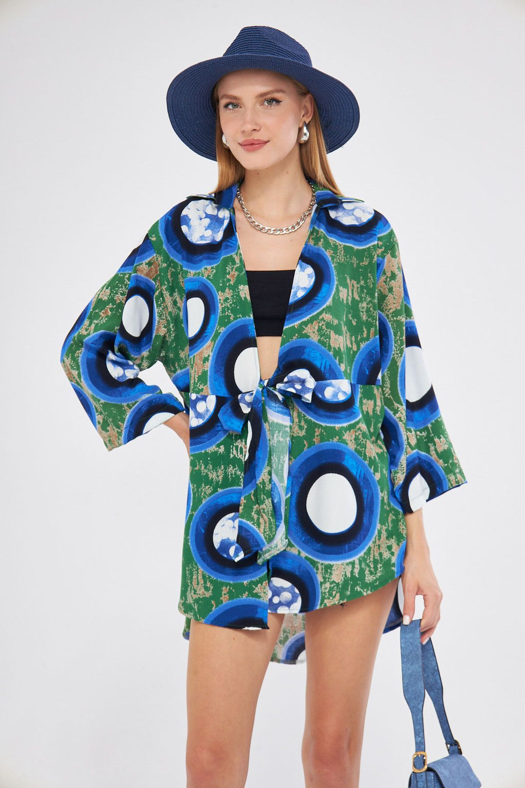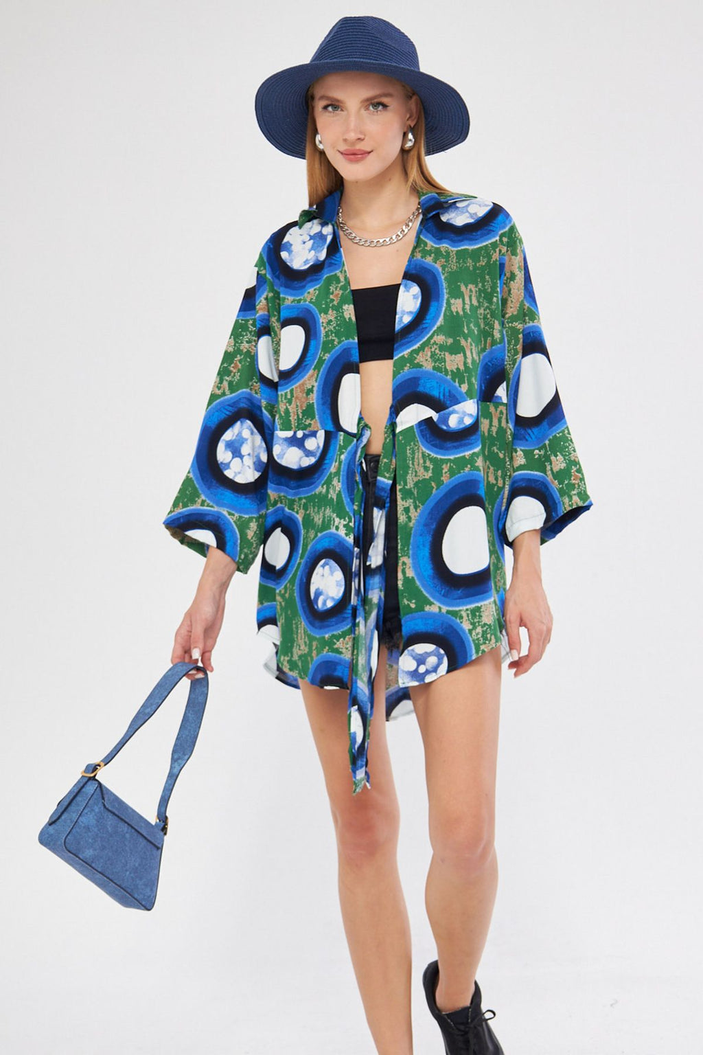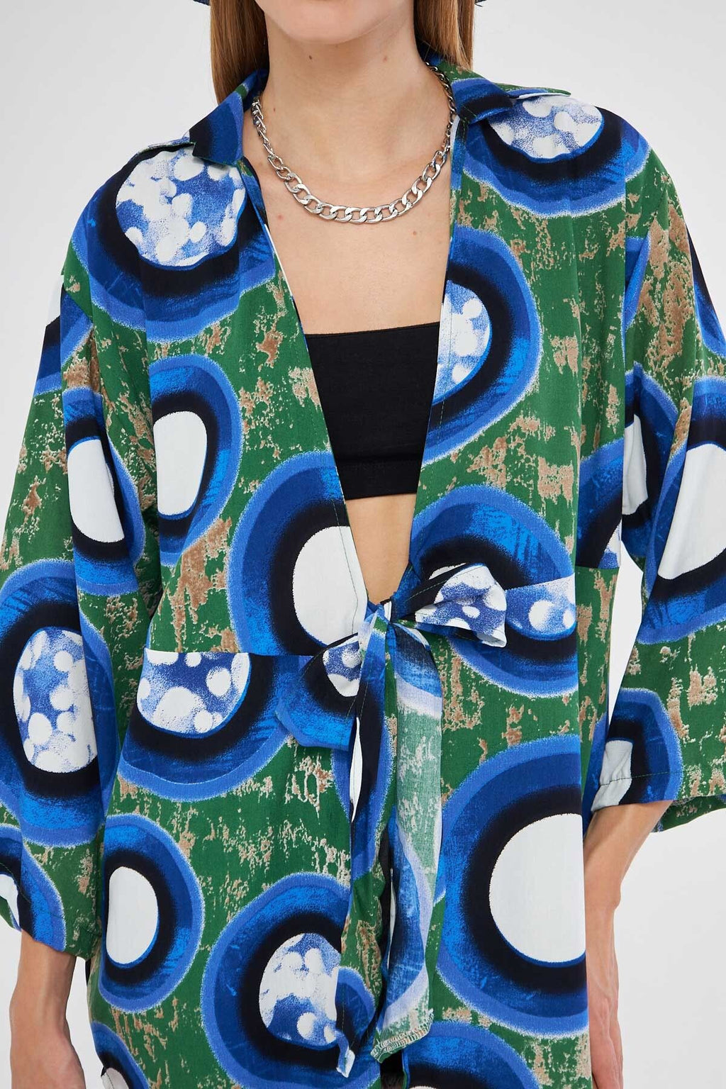 Woman Dark Green Patterned front-binding kimono shirt ARM-24Y001080