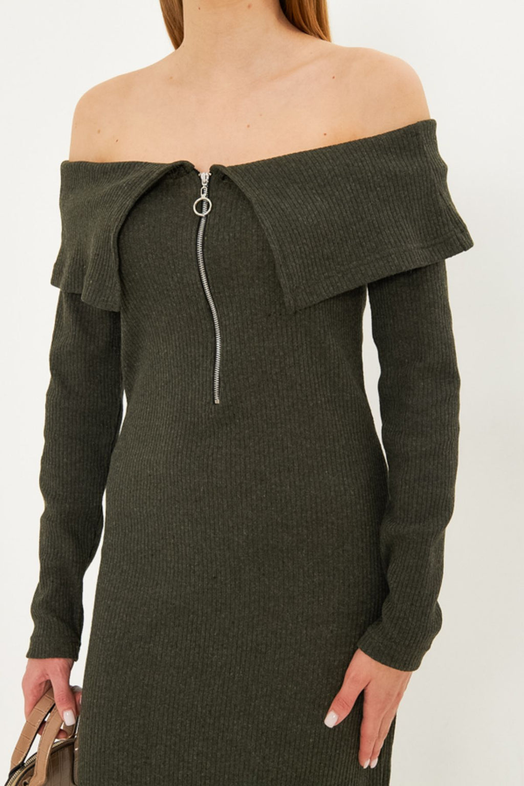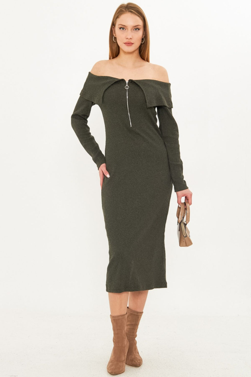 Woman Khaki low shoulder front zipper slit midi triko dress ARM-25K001089
