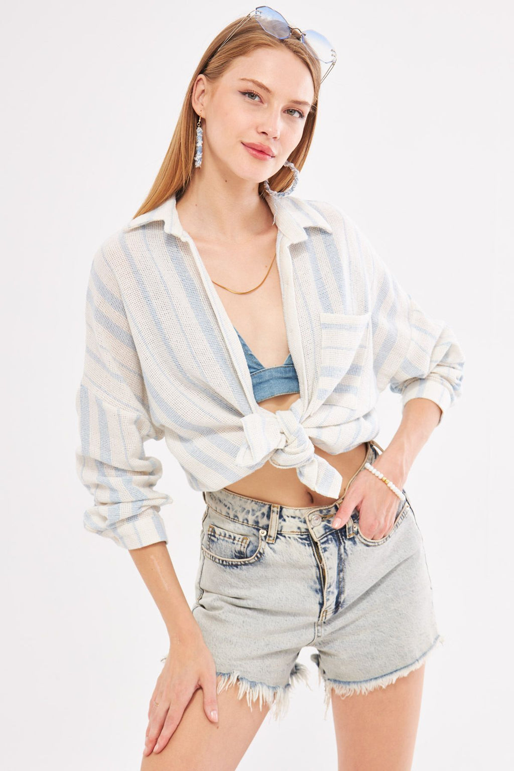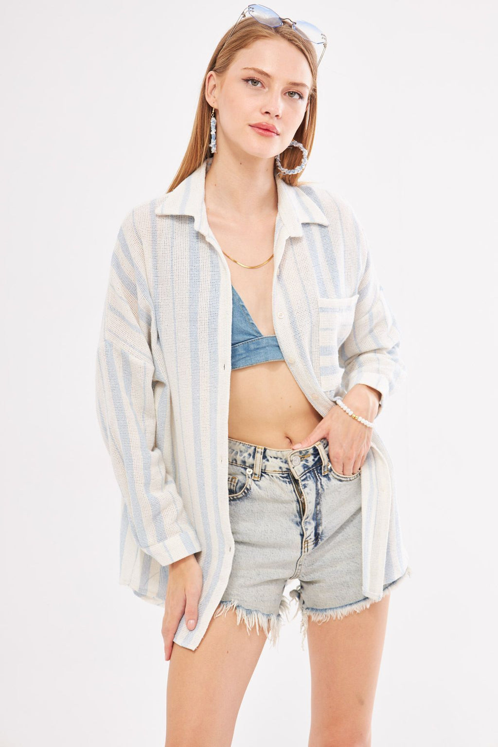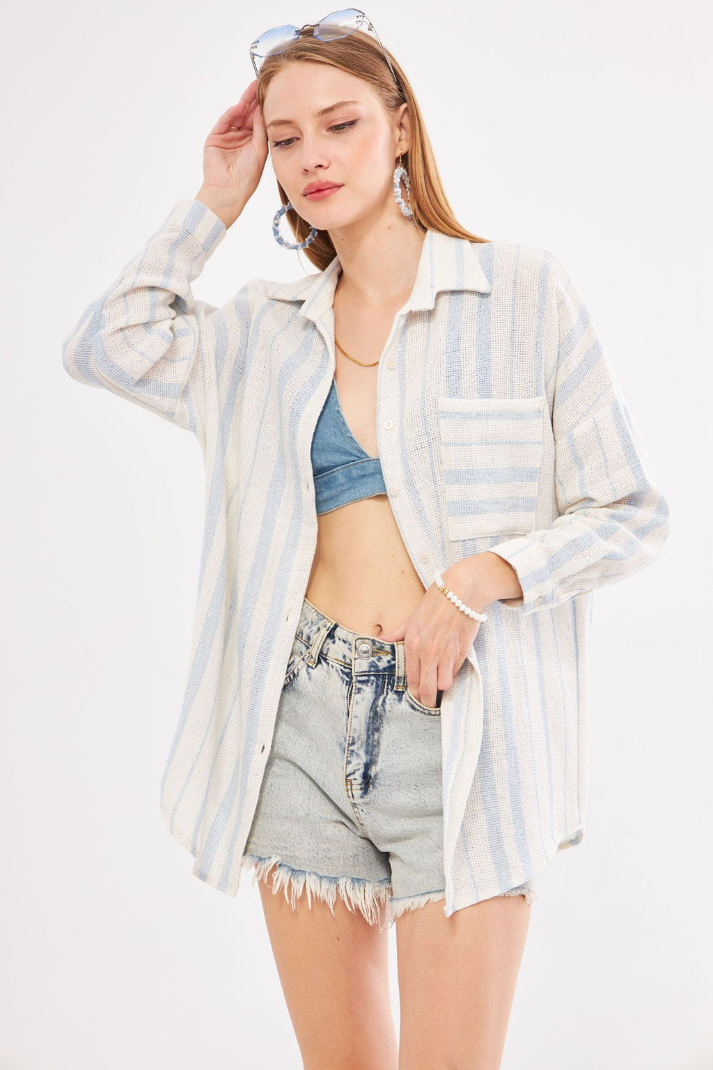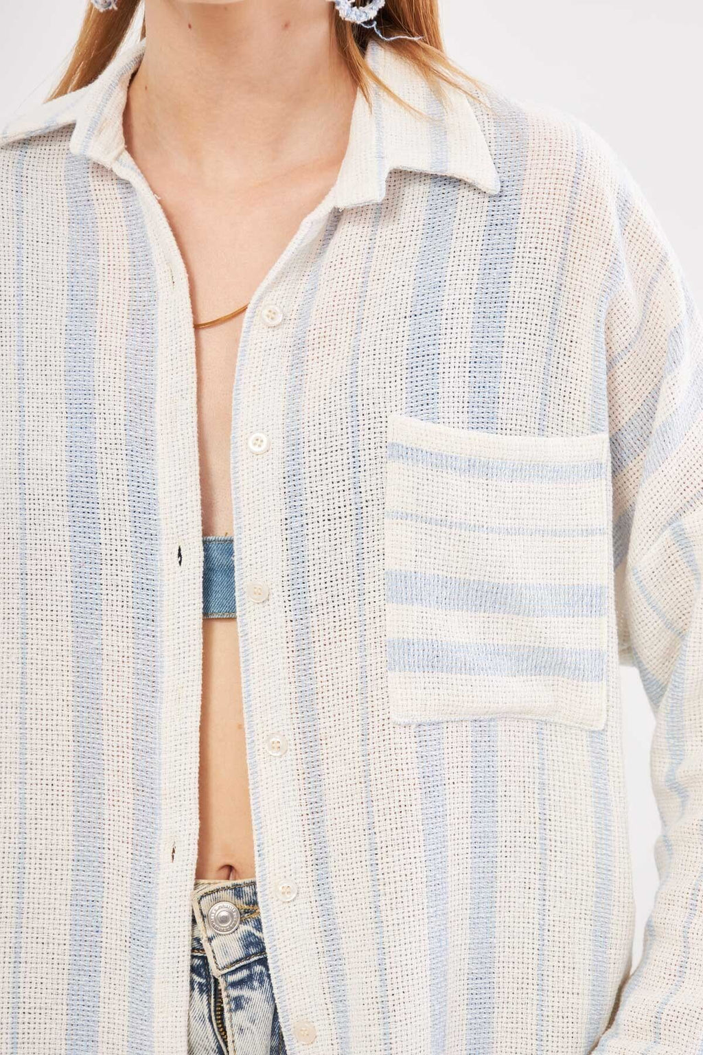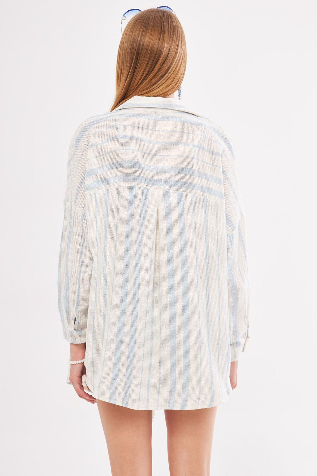 Woman Light Blue Long Sleeve Pocket detailed back Pleeled striped Oversiz shirt ARM-24Y001053