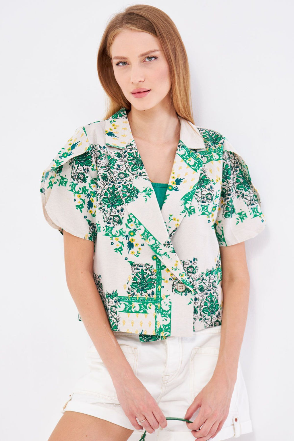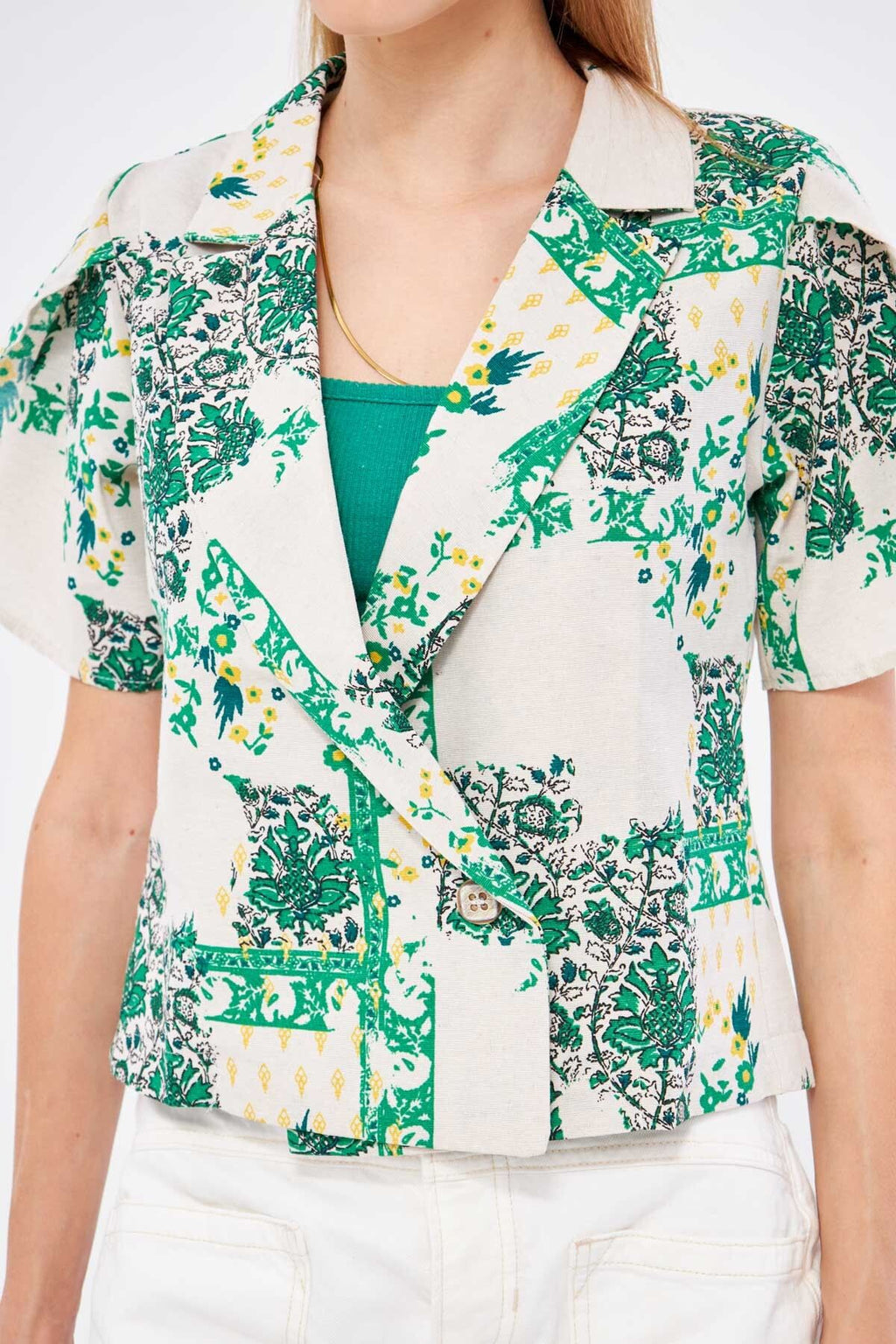 Woman Light Green Linen-Looking Patterned Band Slit Crop Short Sleeve Jacket ARM-24Y001095