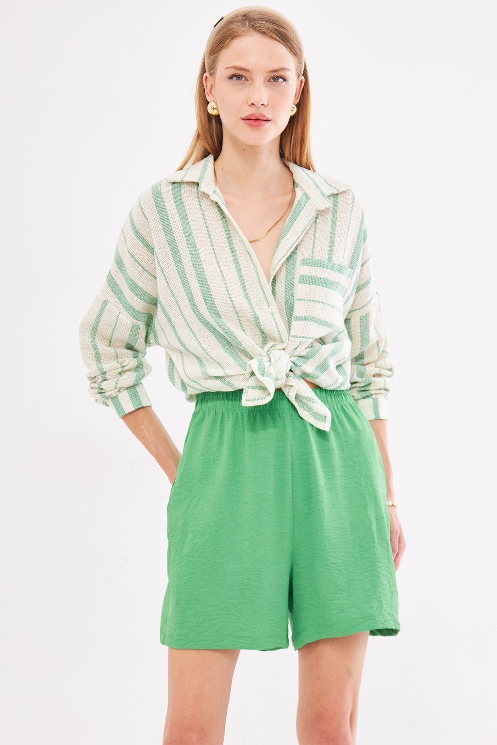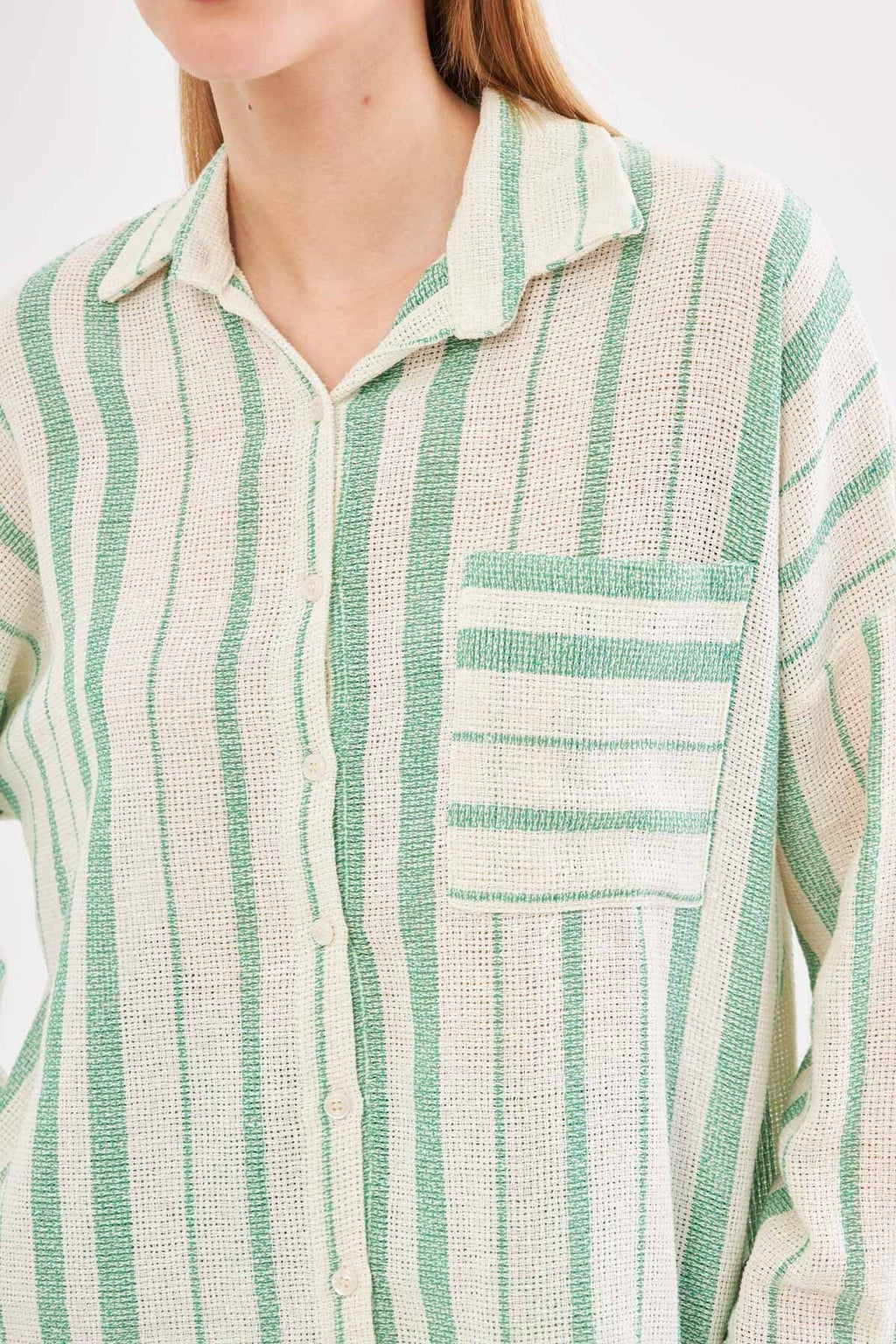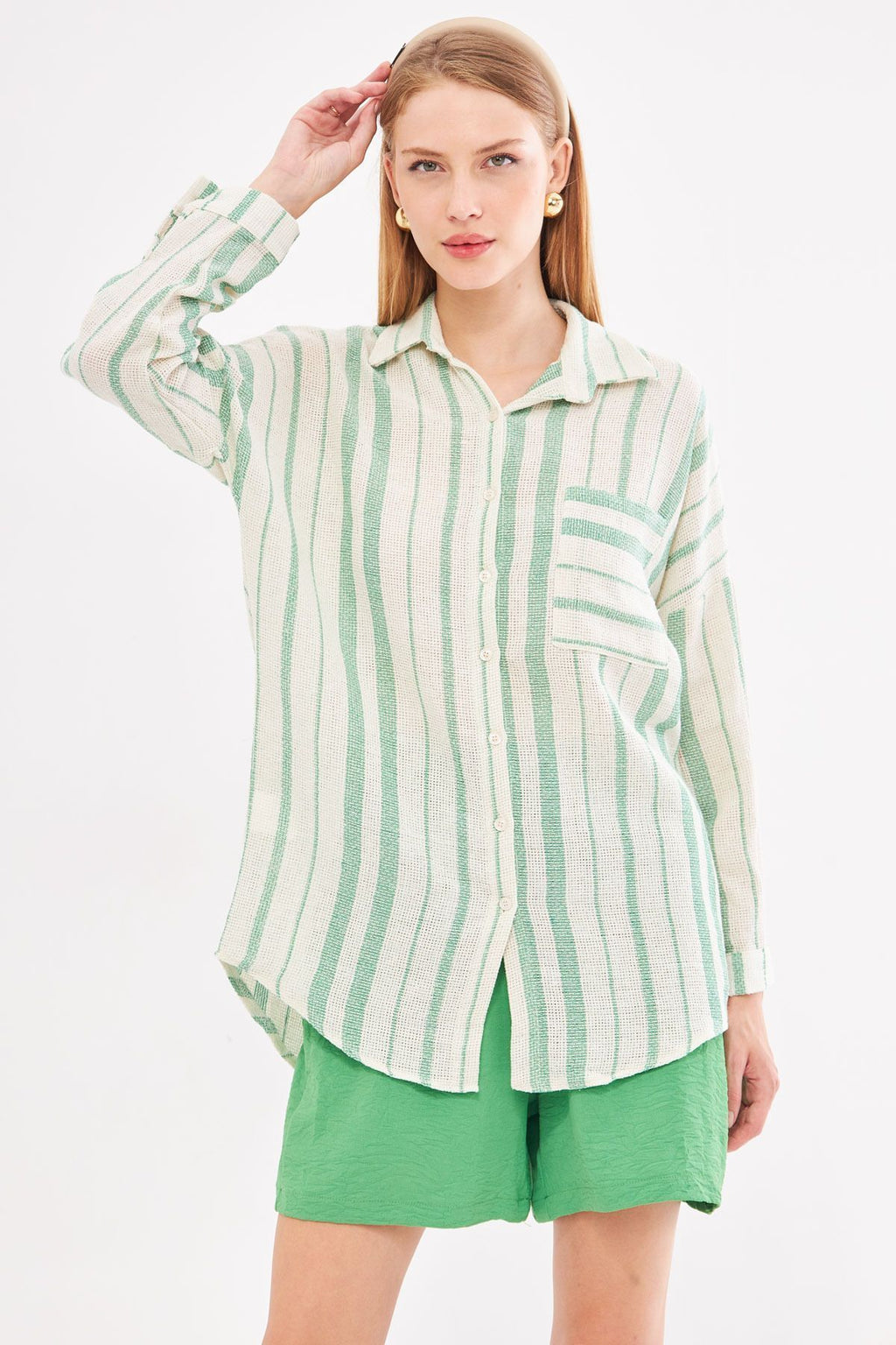 Woman Light Green Long Sleeve Pocket detailed back Pleeled striped Oversize shirt ARM-24Y001053