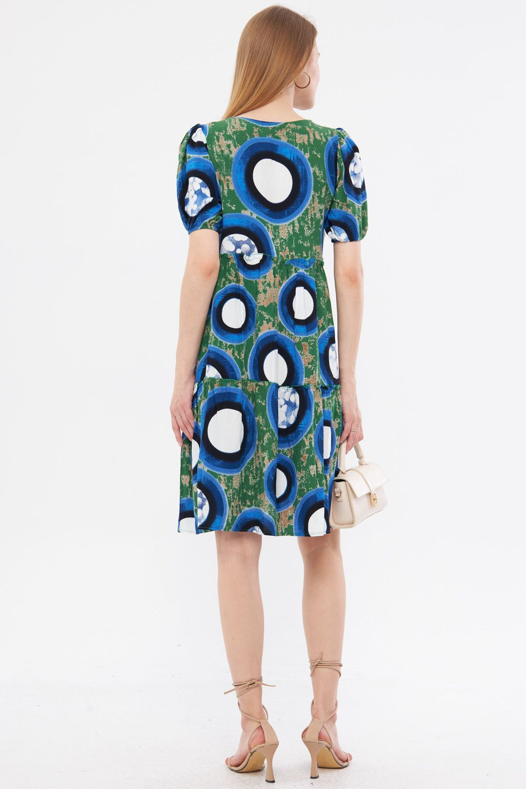 Woman Light Green V-Neck Short Arm Patterned Ruffle Dress ARM-24Y001014