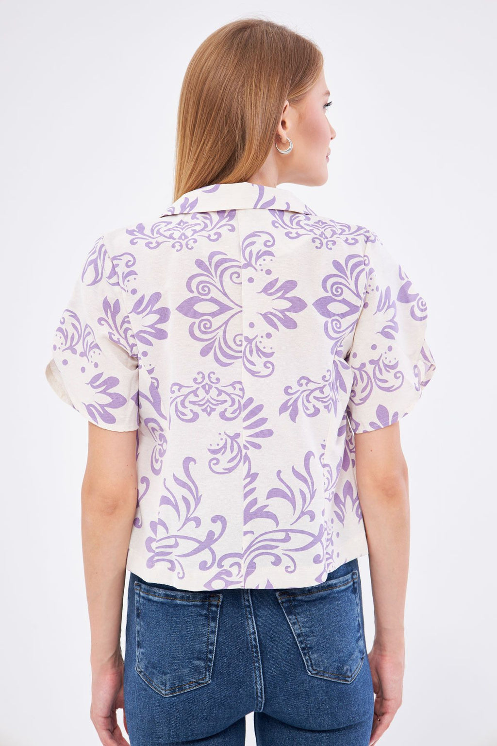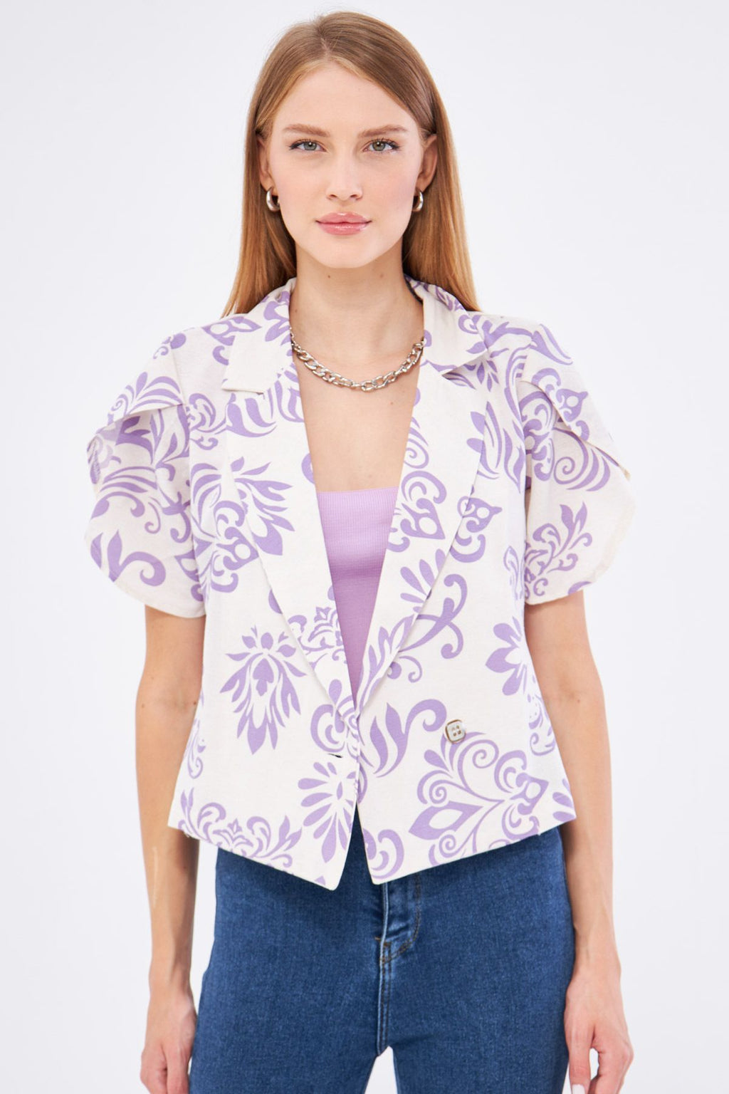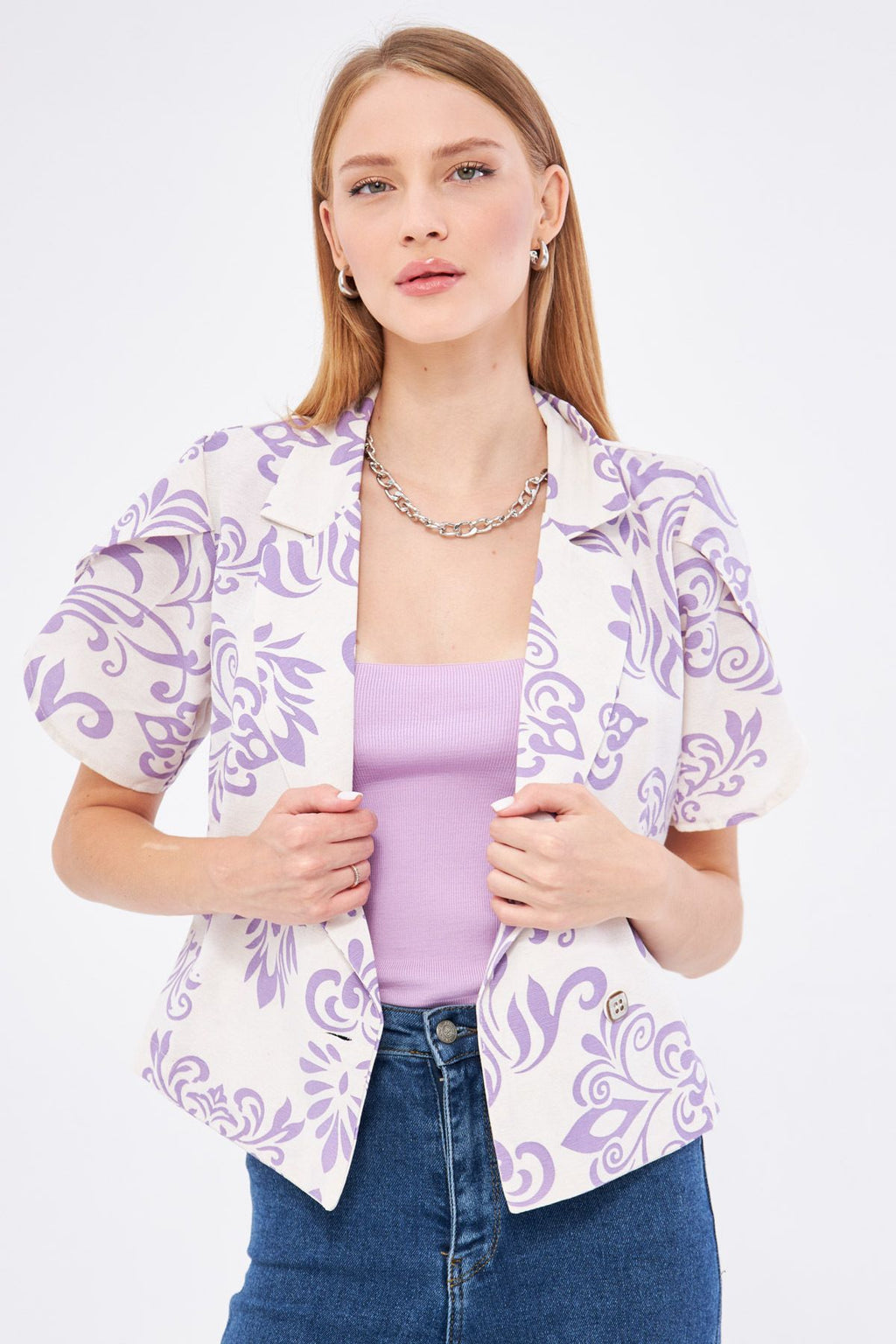 Woman Lilac Flax Looking Patterned Band Slit Crop Short Sleeve Jacket ARM-24Y001095