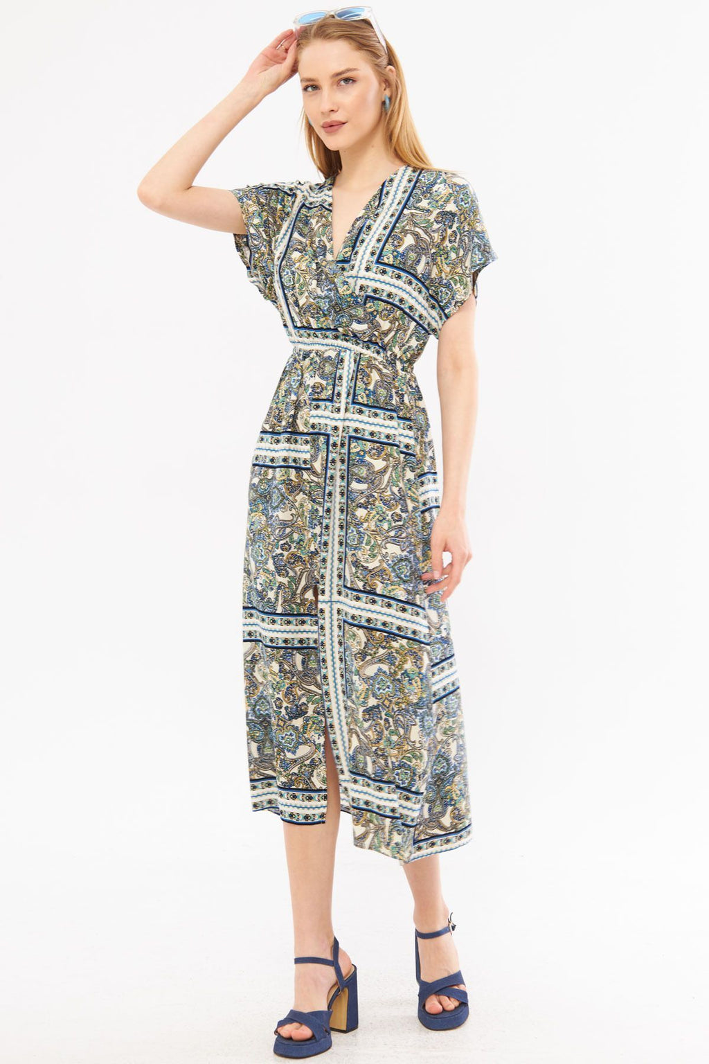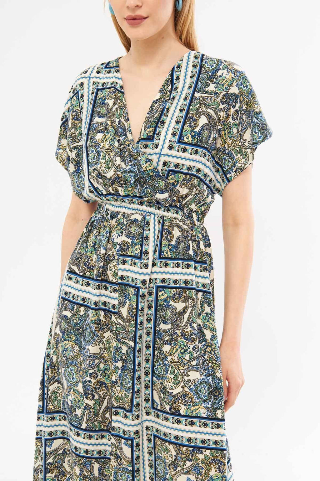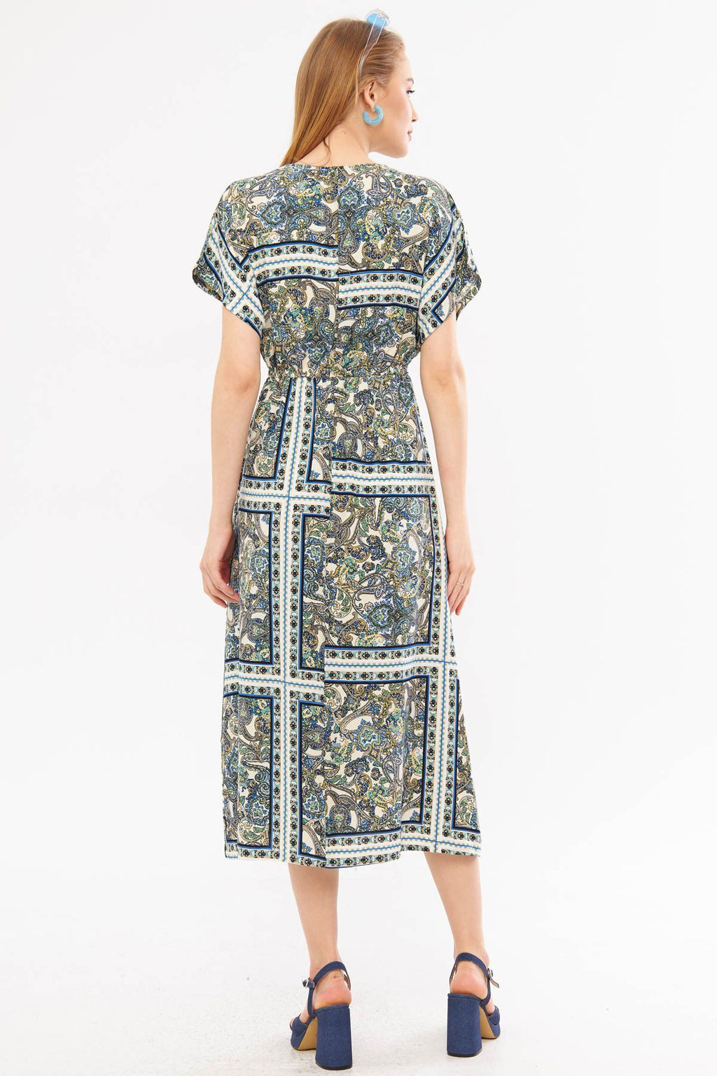 Woman Navy Blue Cruve Yaka Bat Waist Arm Wa Long Dress with a Tuberculosis Arm-24Y001059