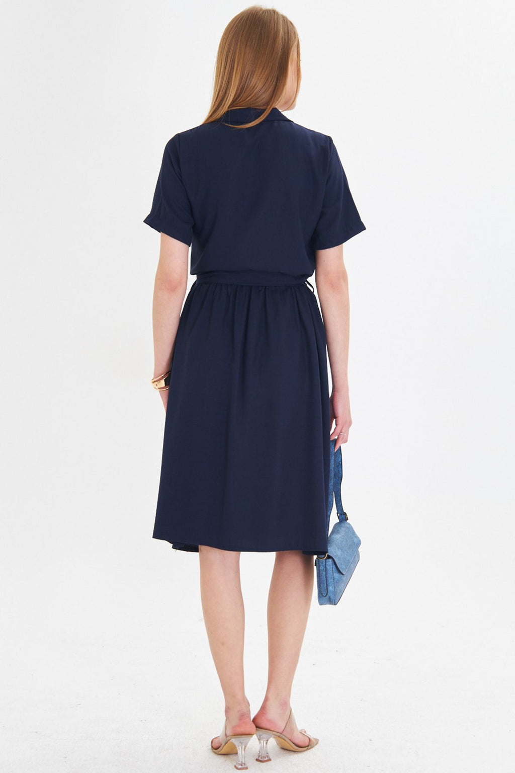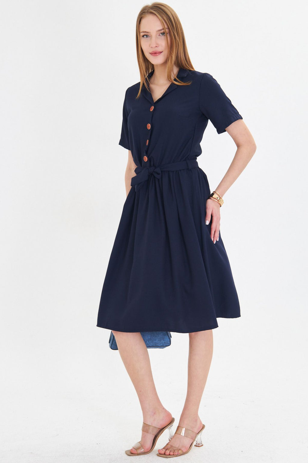 Woman Navy blue front buttoned waist shirred belt midi size dress ARM-24Y001068