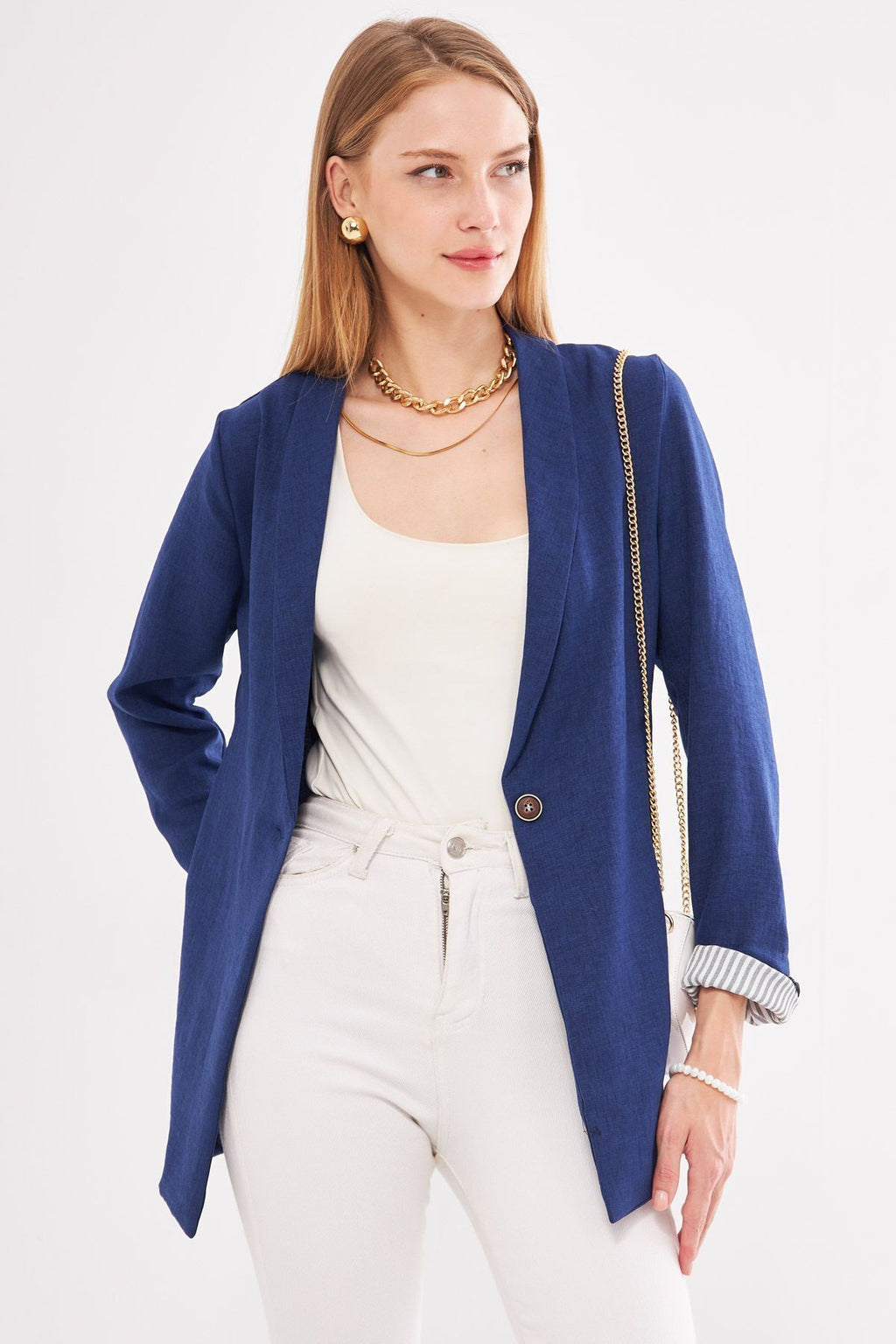 Woman Navy blue sleeve in intravenous striped single button jacket ARM-22K001122