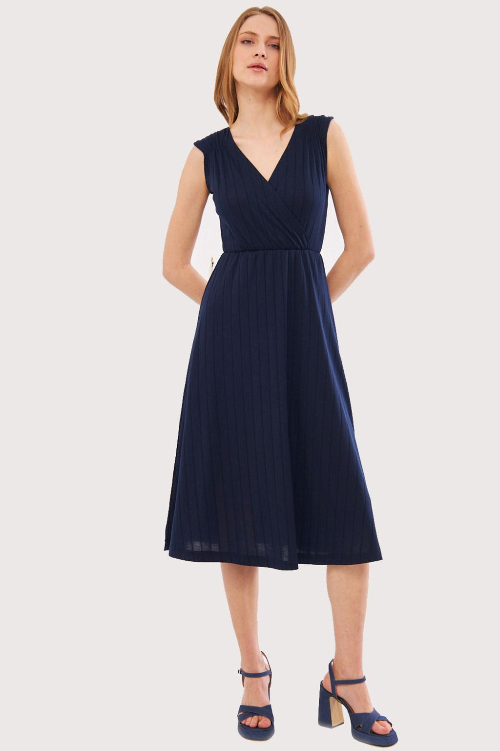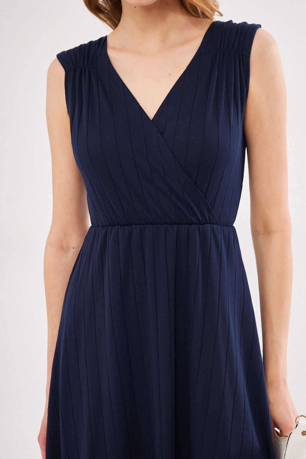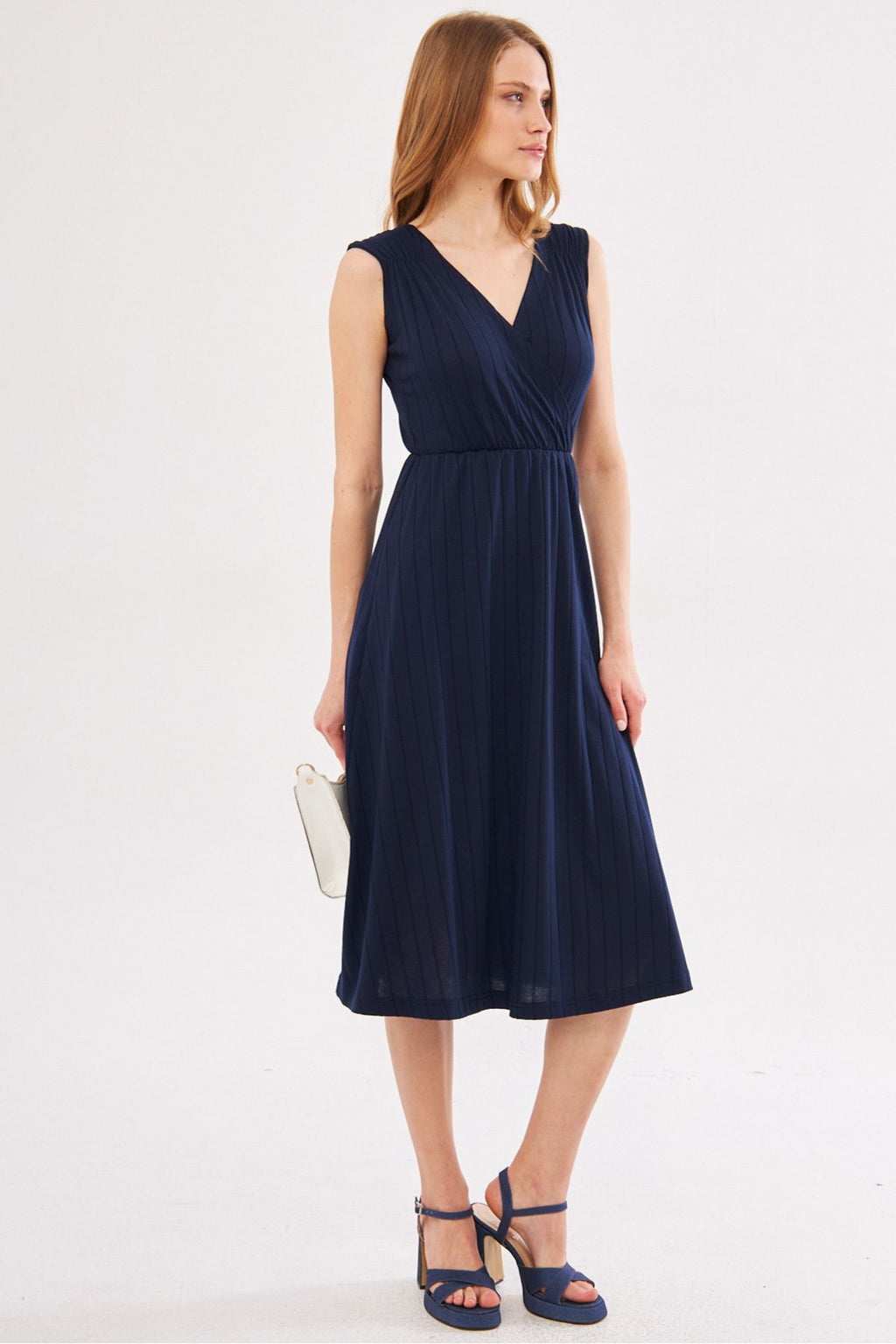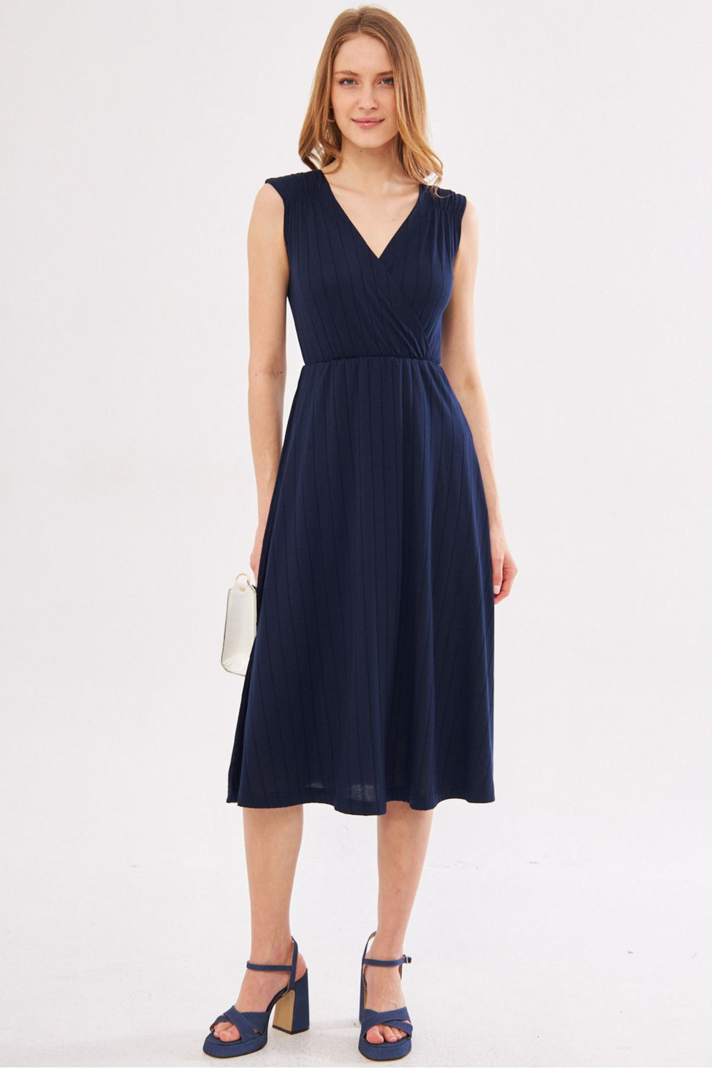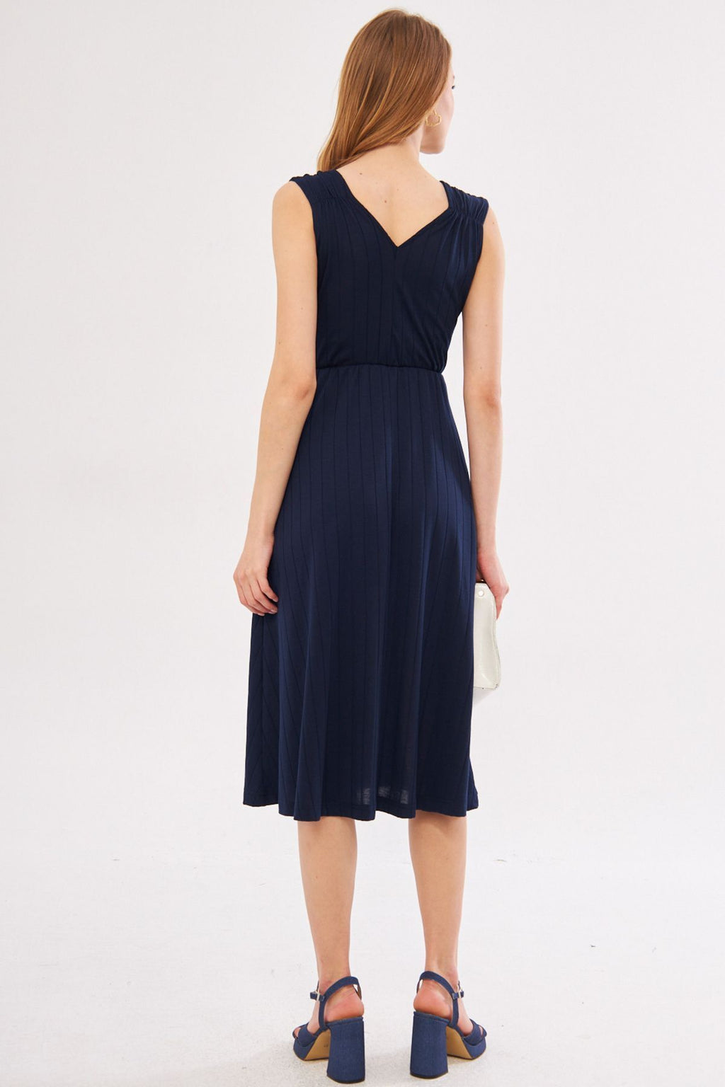 Woman Navy blue waist and shoulder tire skirt cruve collar midi size dress ARM-24Y001017