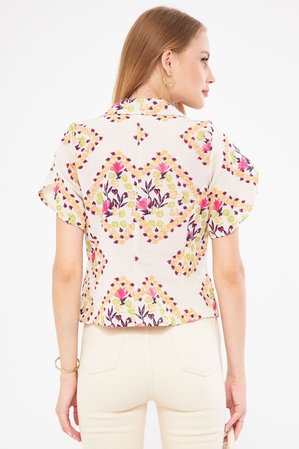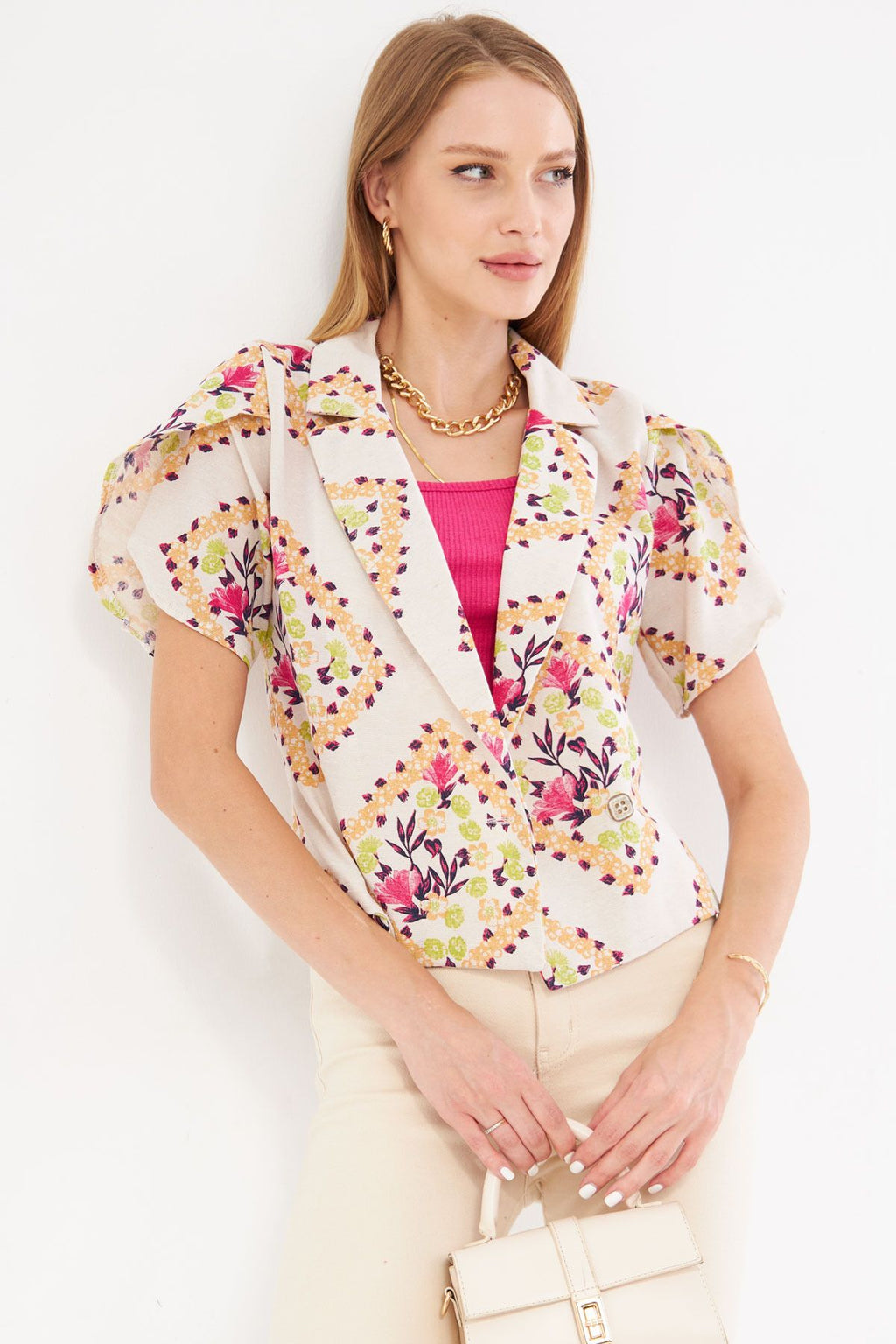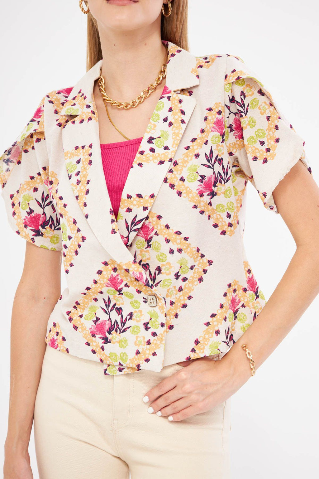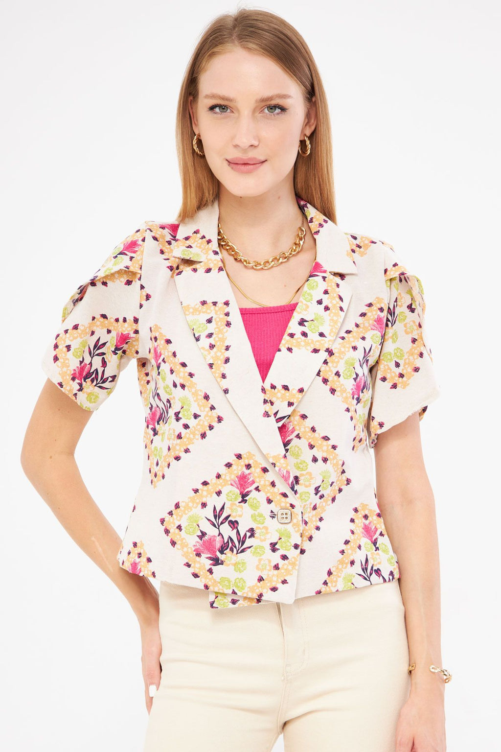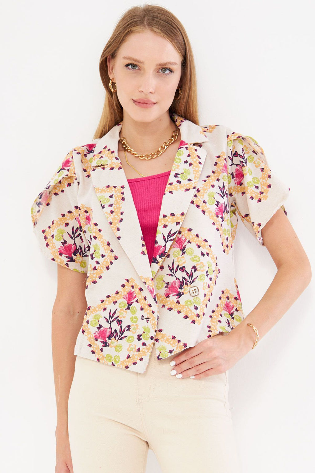 Woman Open Fuchsia Linen-Looking Patterned Lever Slit Crop Short Sleeve Jacket ARM-24Y001095