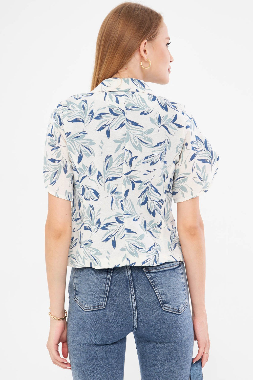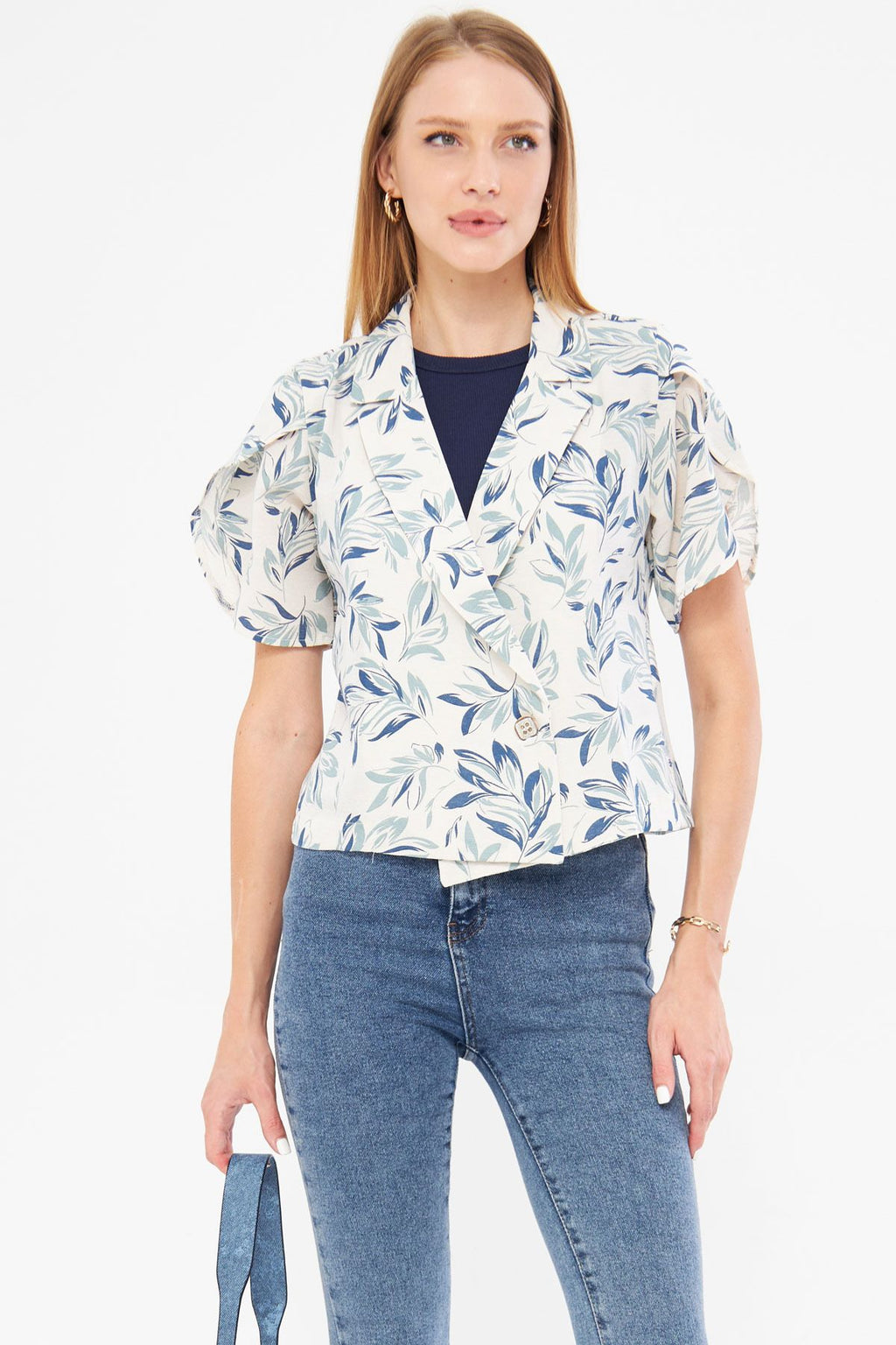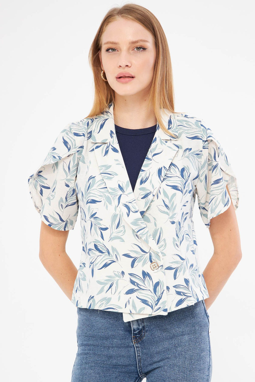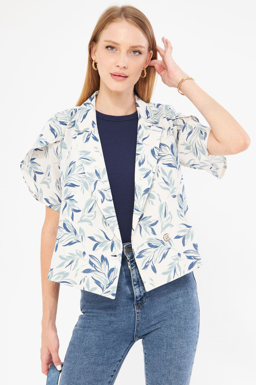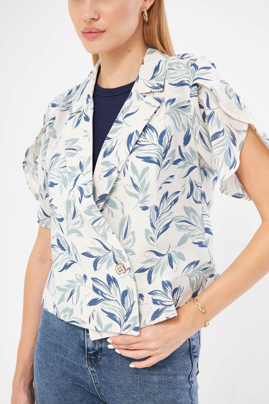Woman Open Mint Linen-Looking Patterned Band Slit Crop Short Sleeve Jacket ARM-24Y001095
