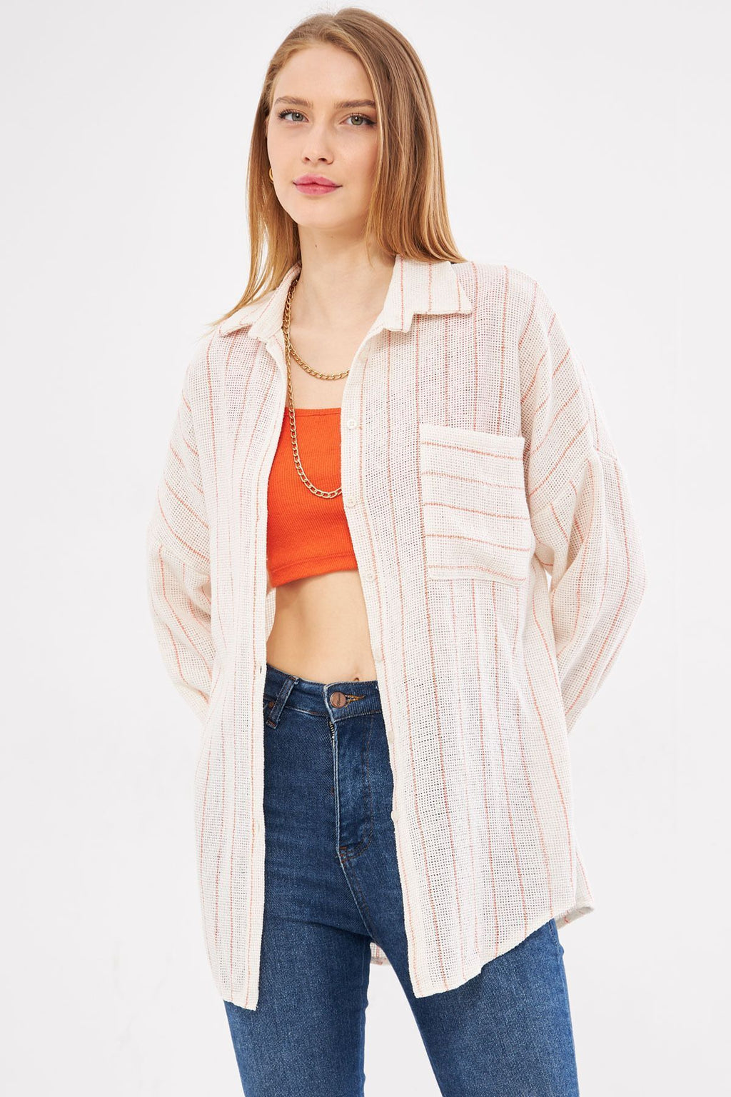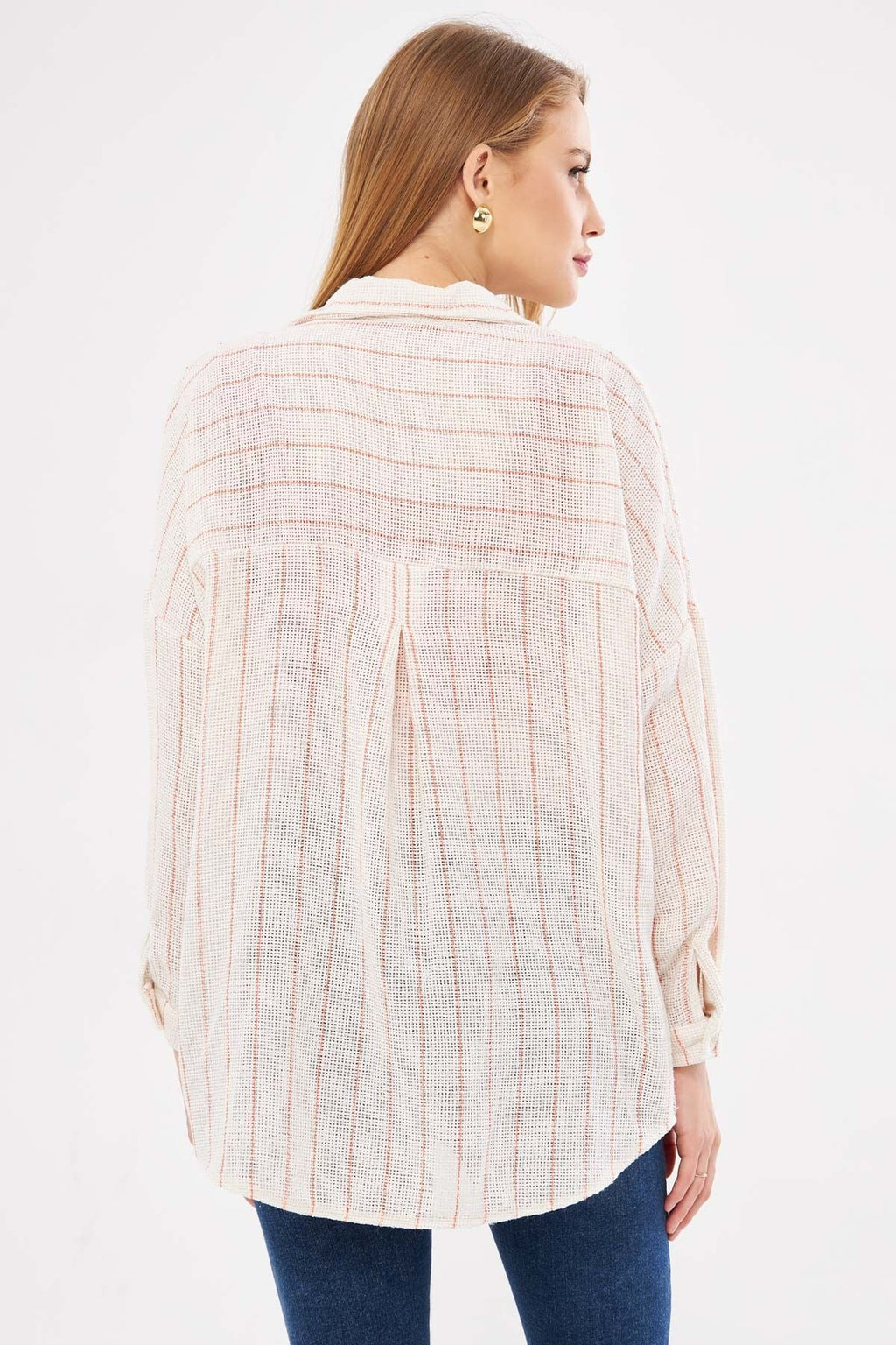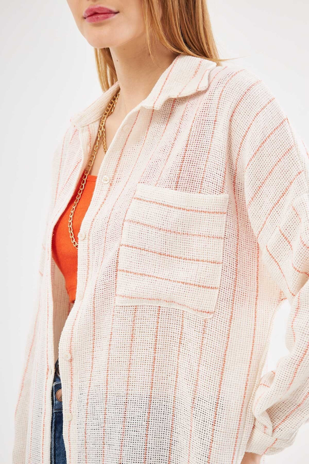 Woman Open Orange Long Sleeve Pocket Detailed Sistle Pleated Striped Oversize Shirt ARM-24Y001053
