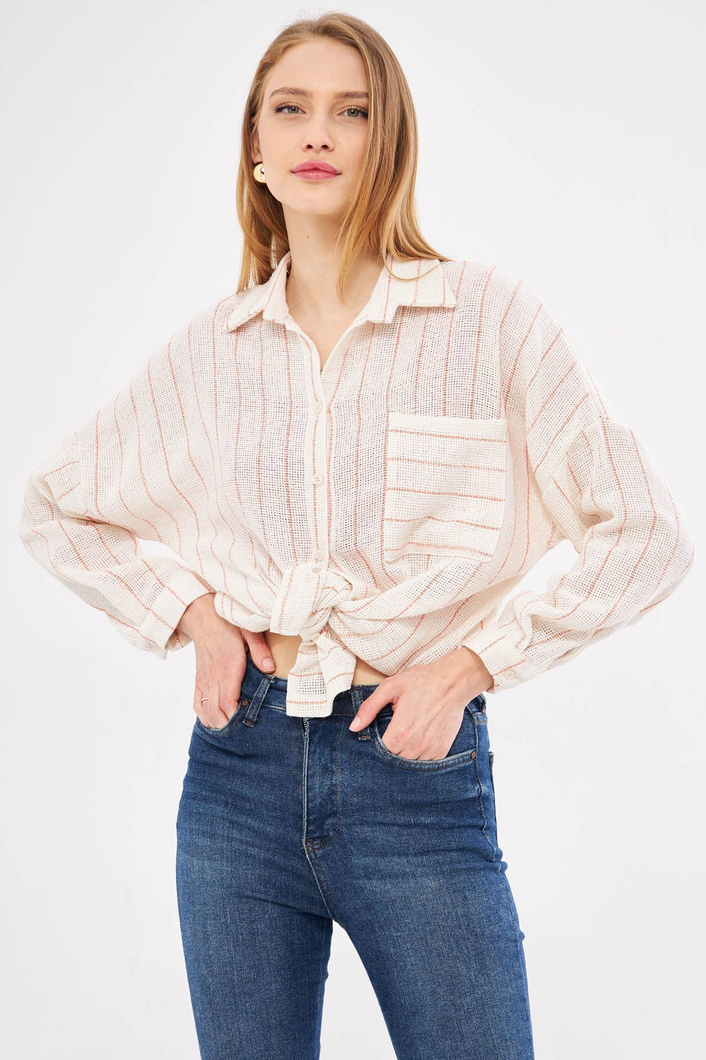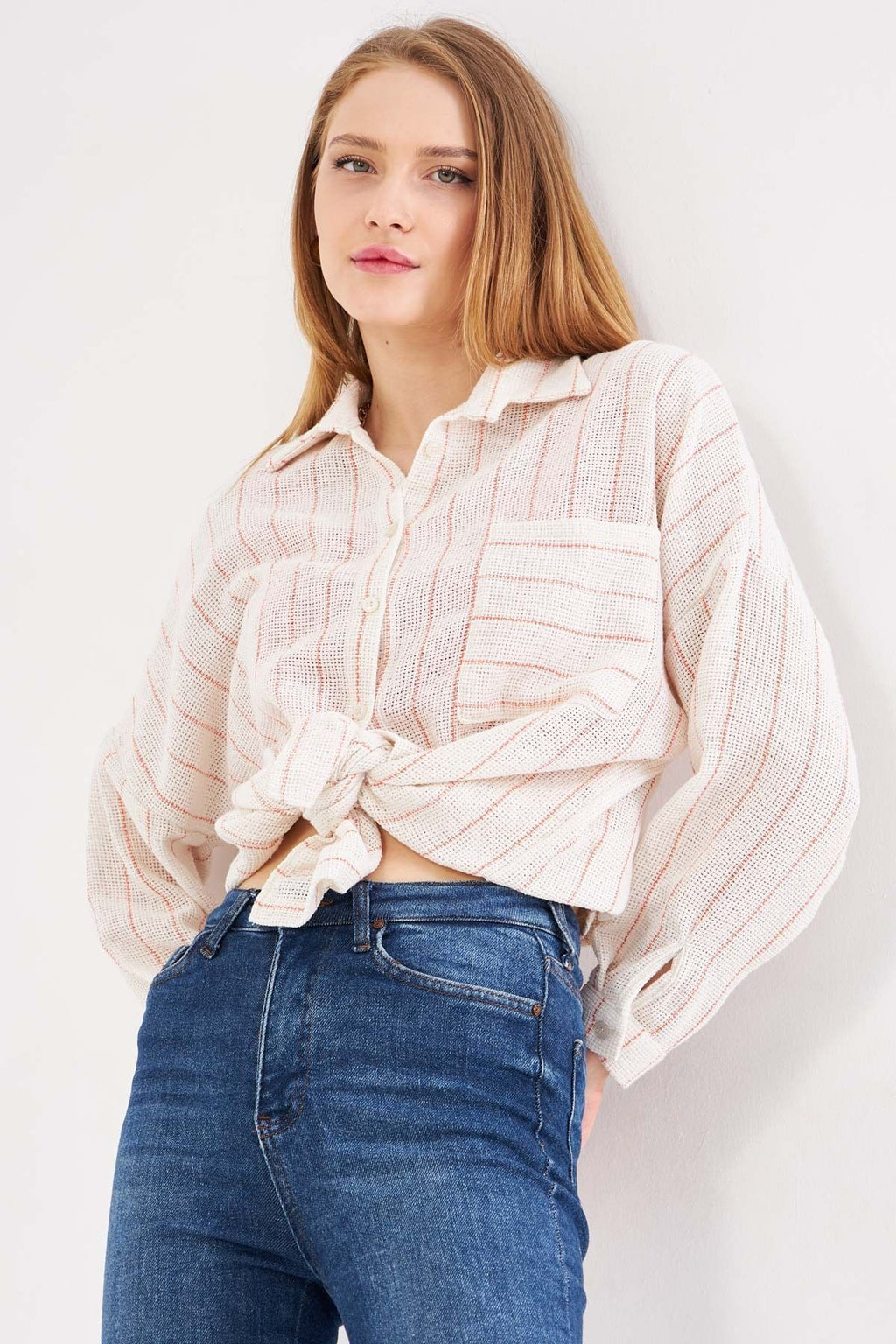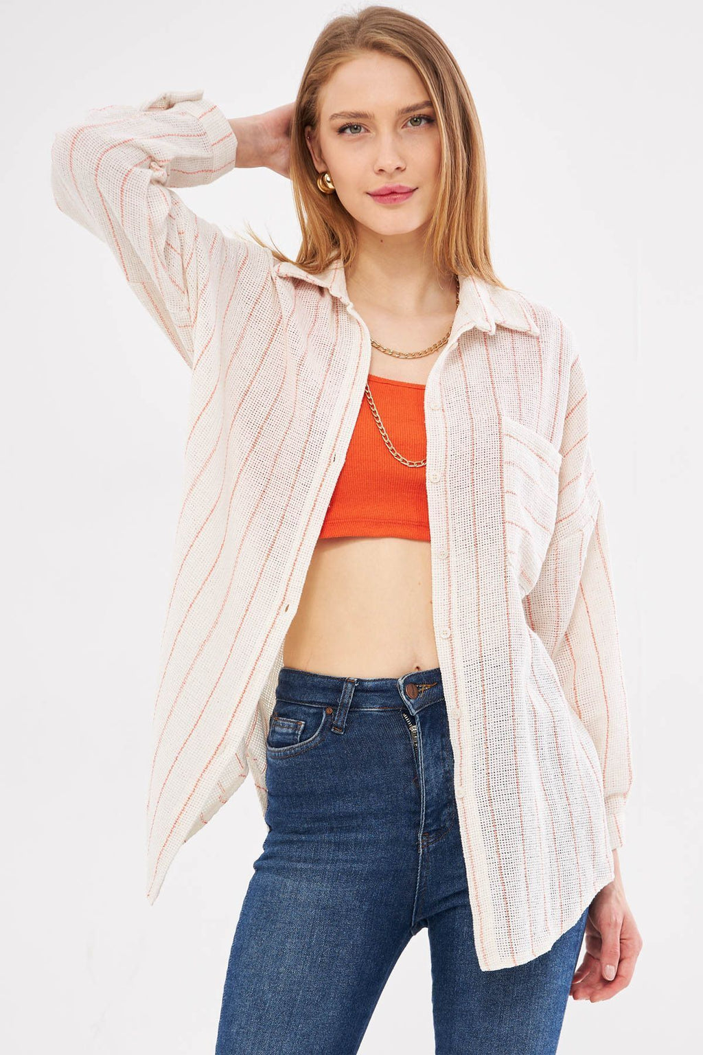 Woman Open Orange Long Sleeve Pocket Detailed Sistle Pleated Striped Oversize Shirt ARM-24Y001053