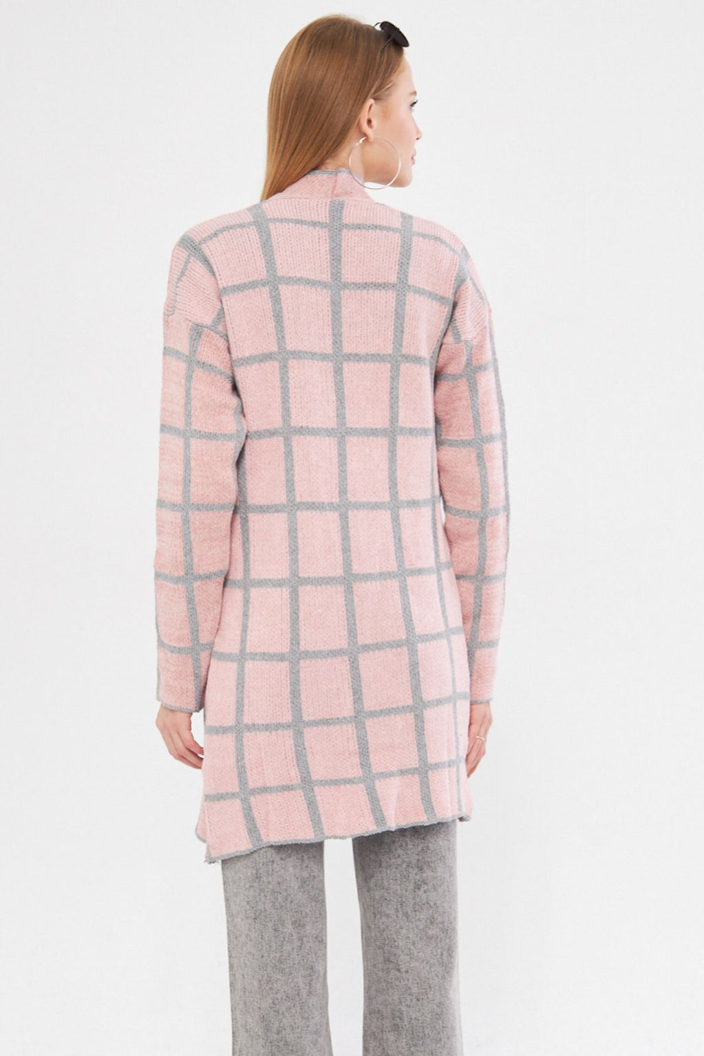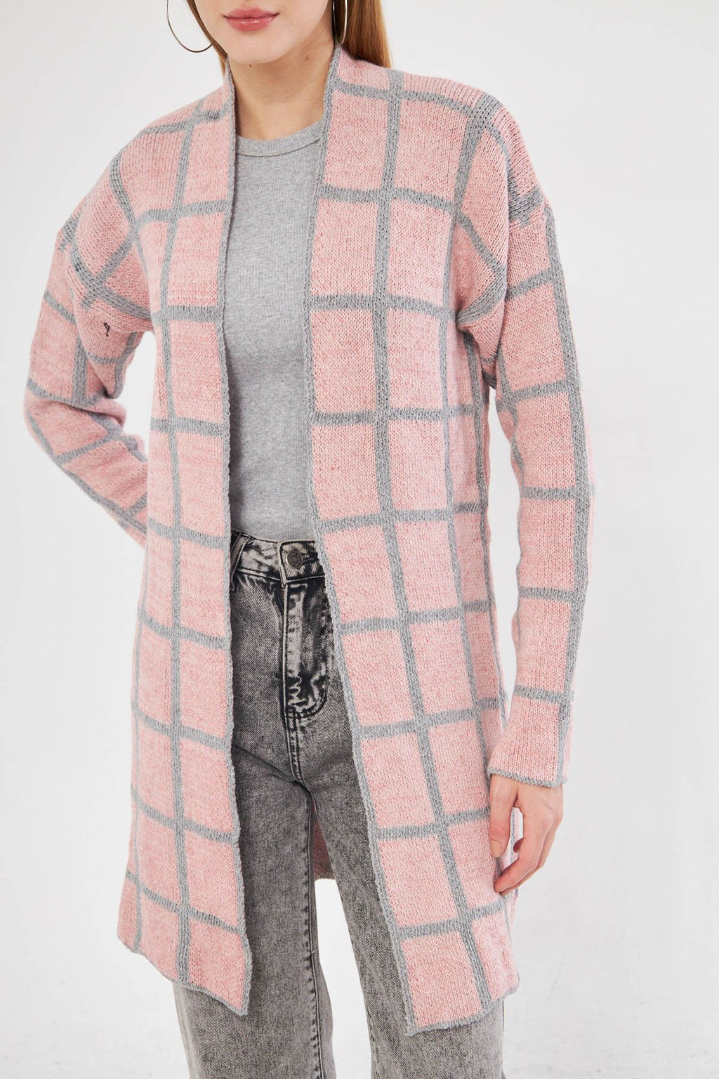 Woman Pink Square Patterned Long Knitwear Cardigan ARM-25K012007