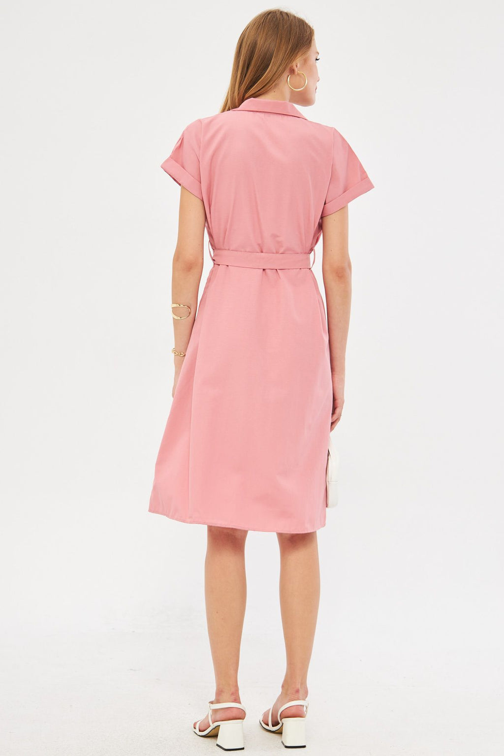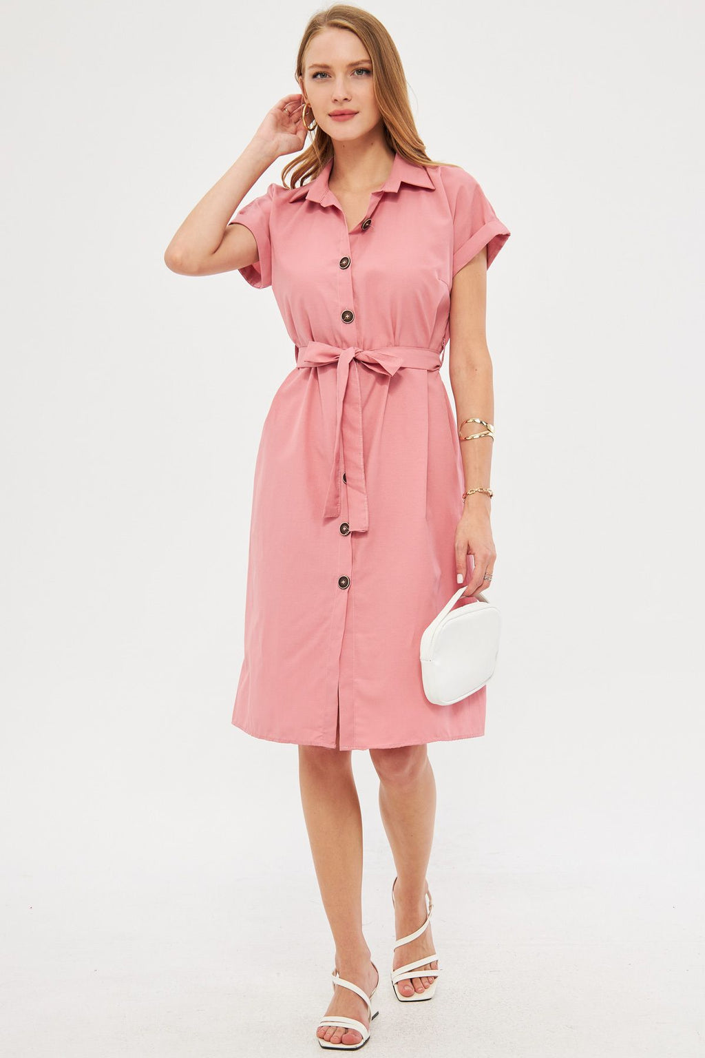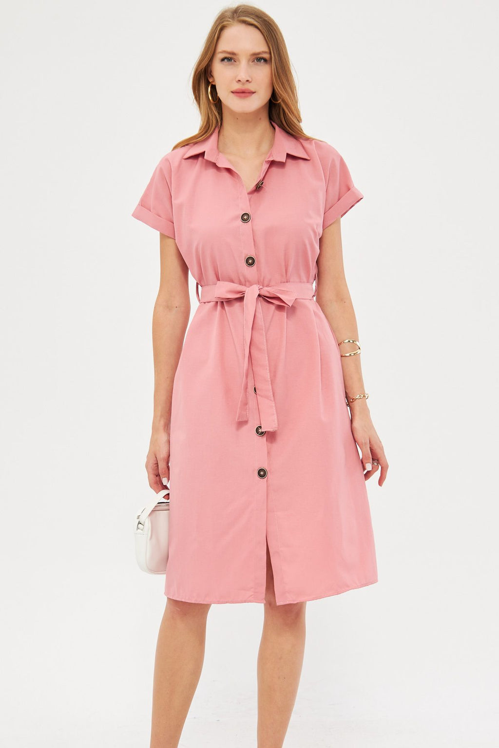 Woman Pink Waist Belt Short Sleeve Shirt Dress ARM-19Y001068