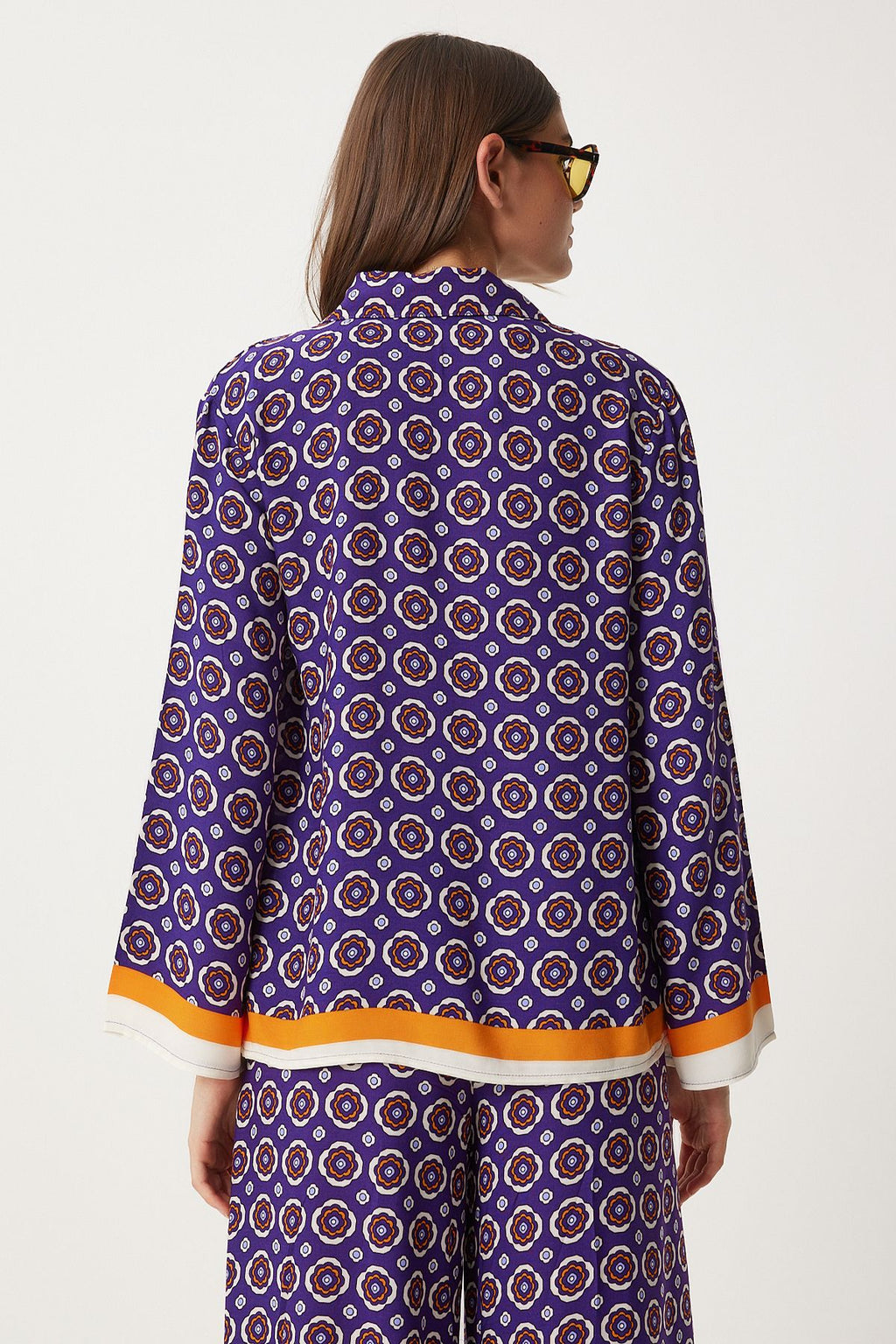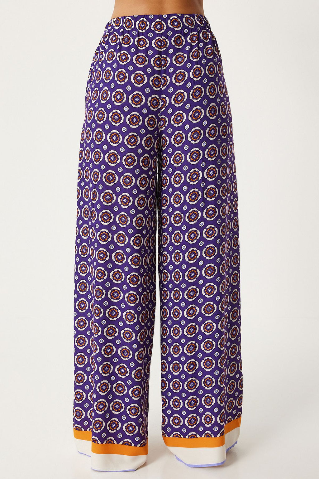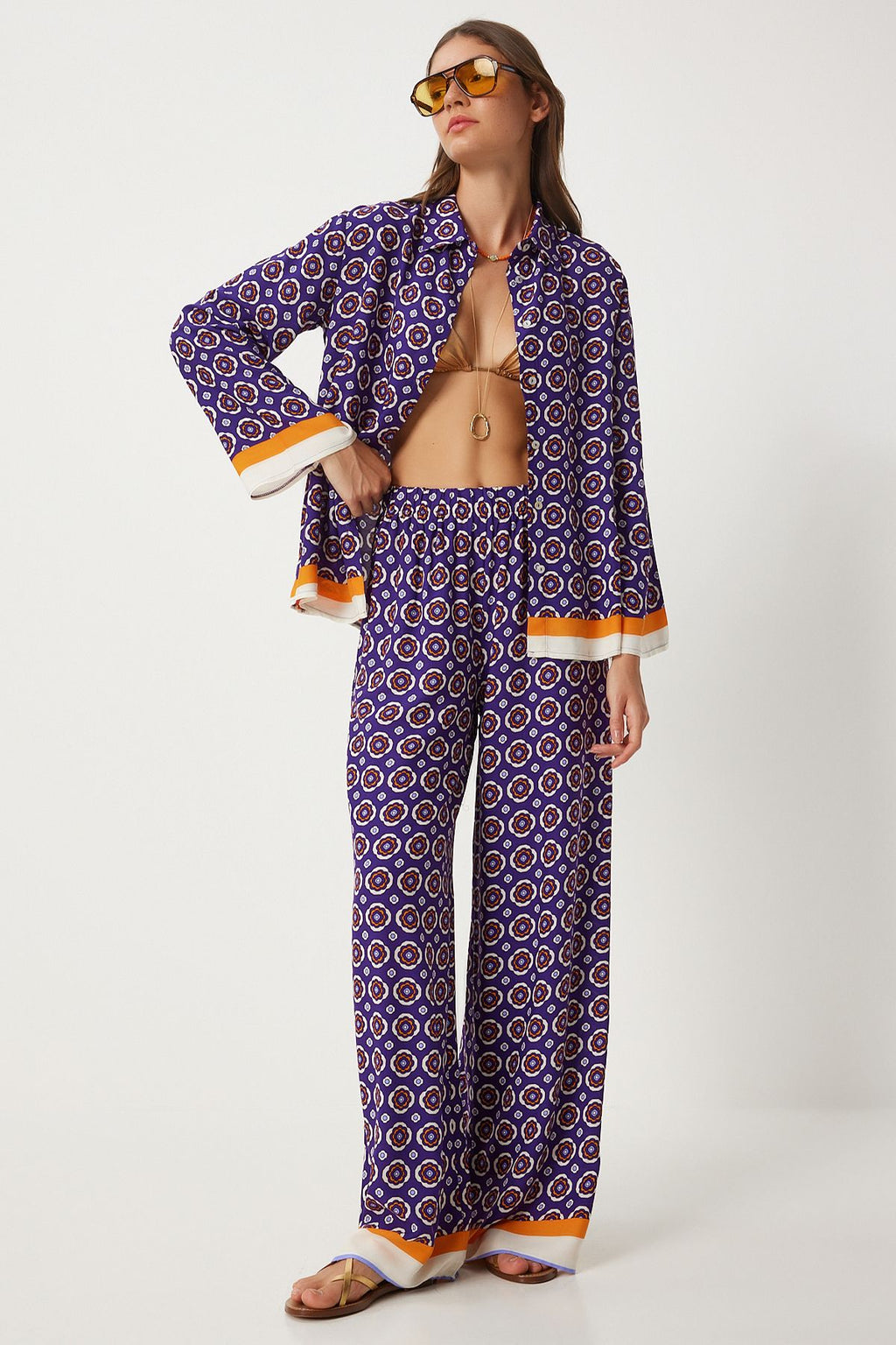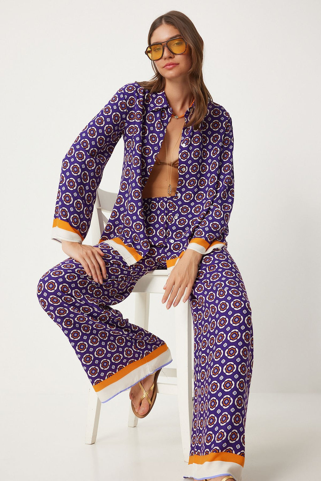 Woman purple white patterned summer viscose shirt palazzo pants set FN03272