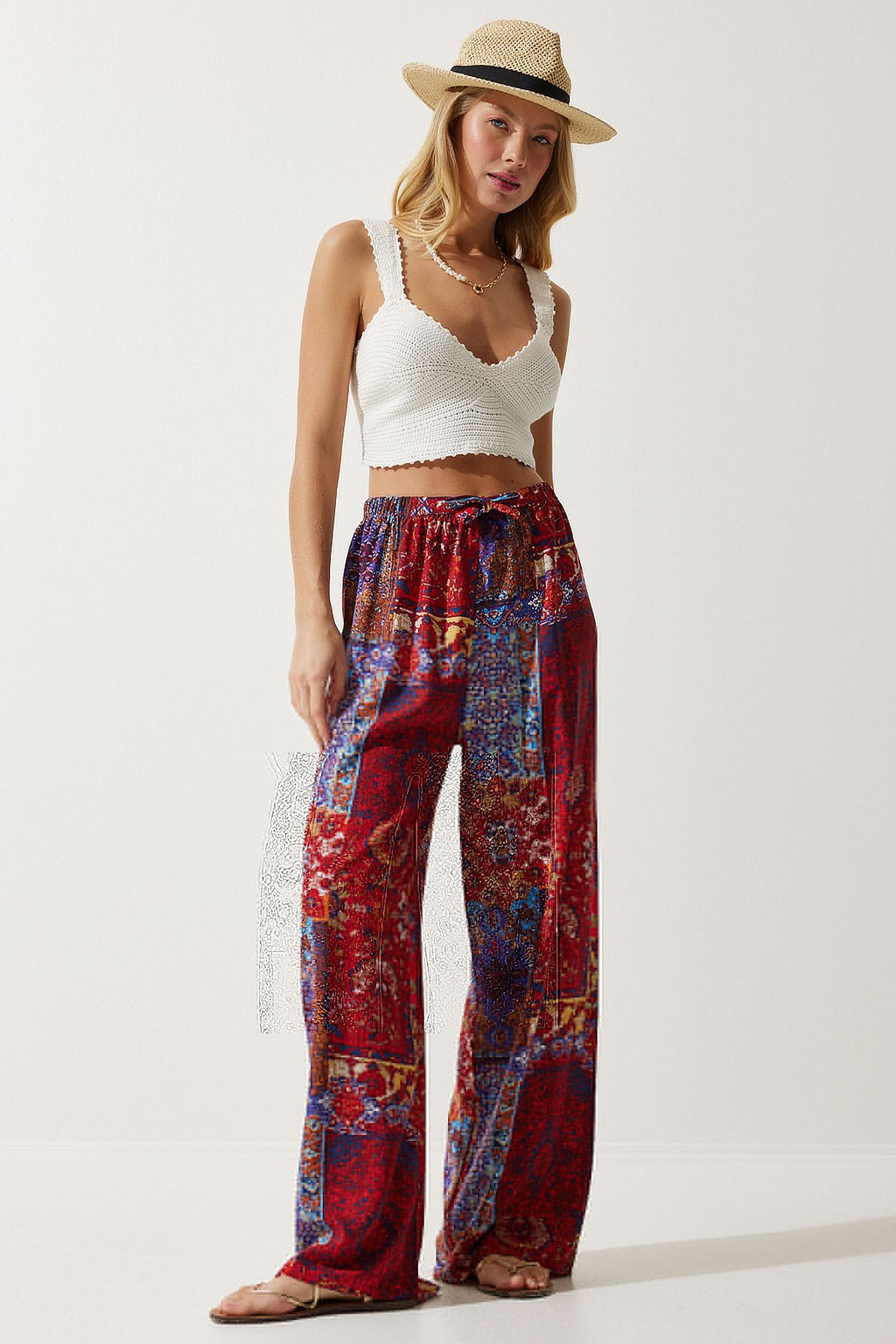 Woman Red Blue Patterned Viscose Palazzo Pants EN00606