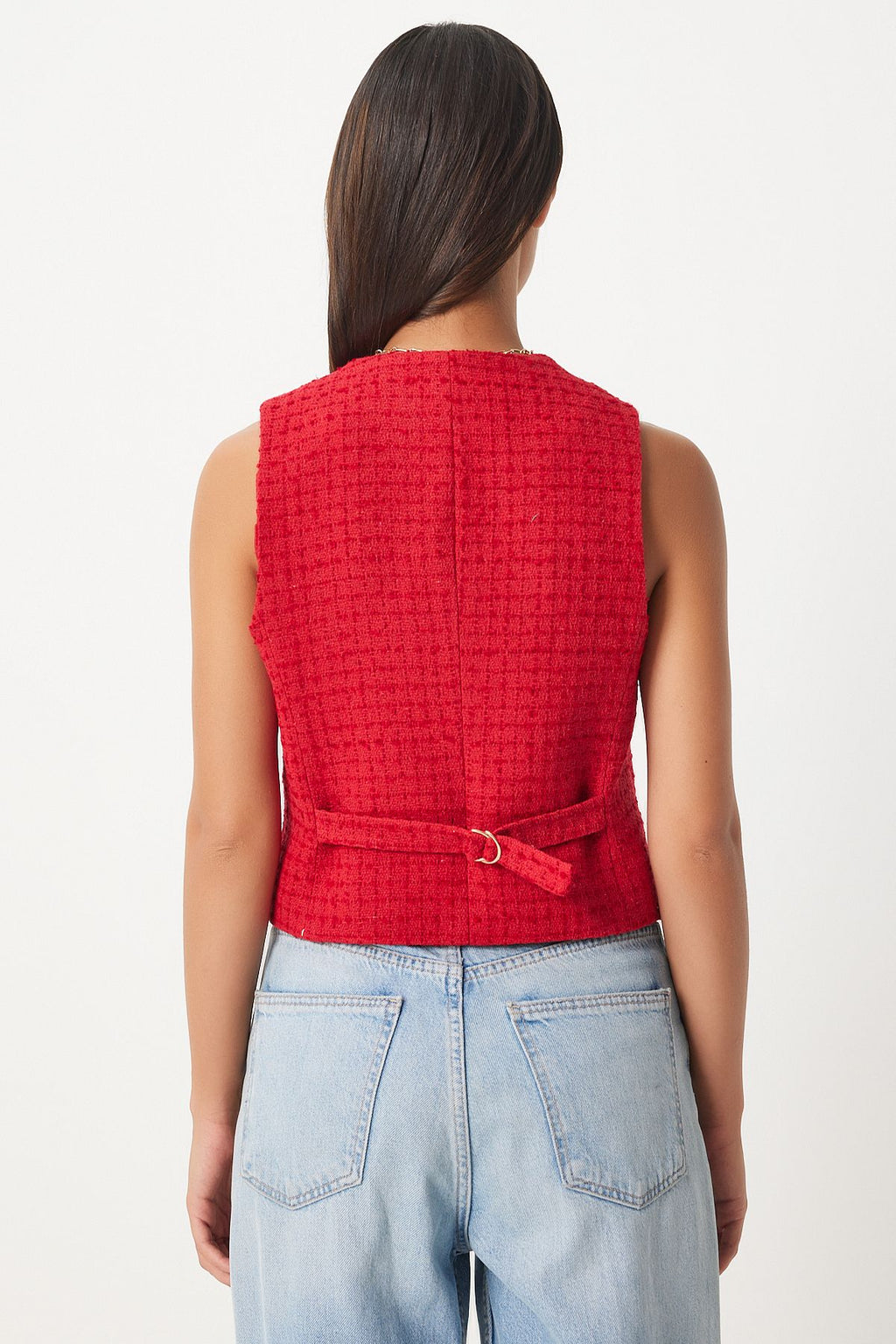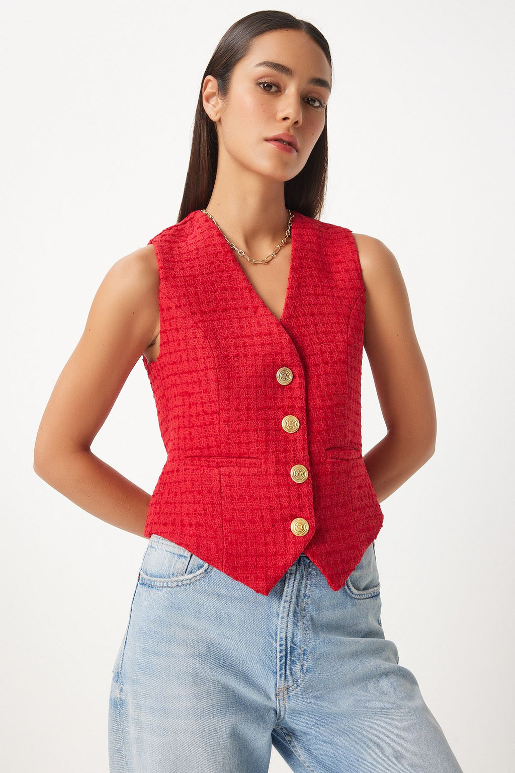 Woman Red Metal Button Detailed Stamp Vest to00111