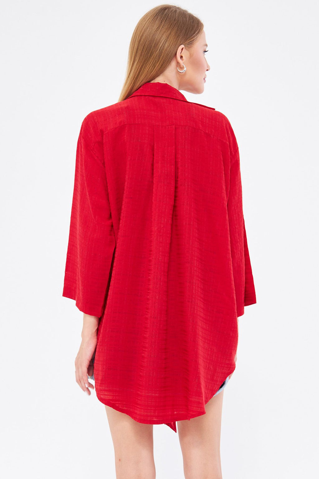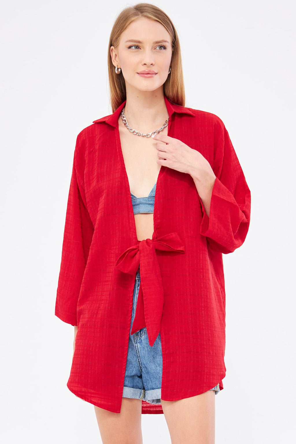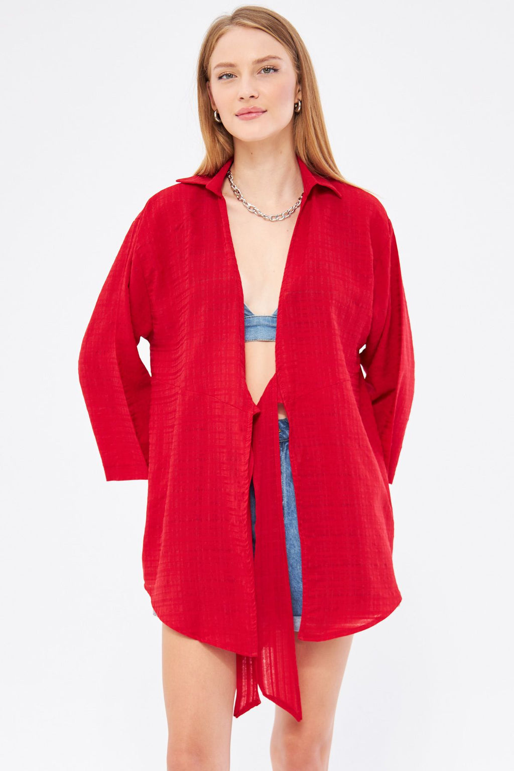 Woman Red Red Self-Striped Front Kimono Shirt ARM-24Y001101