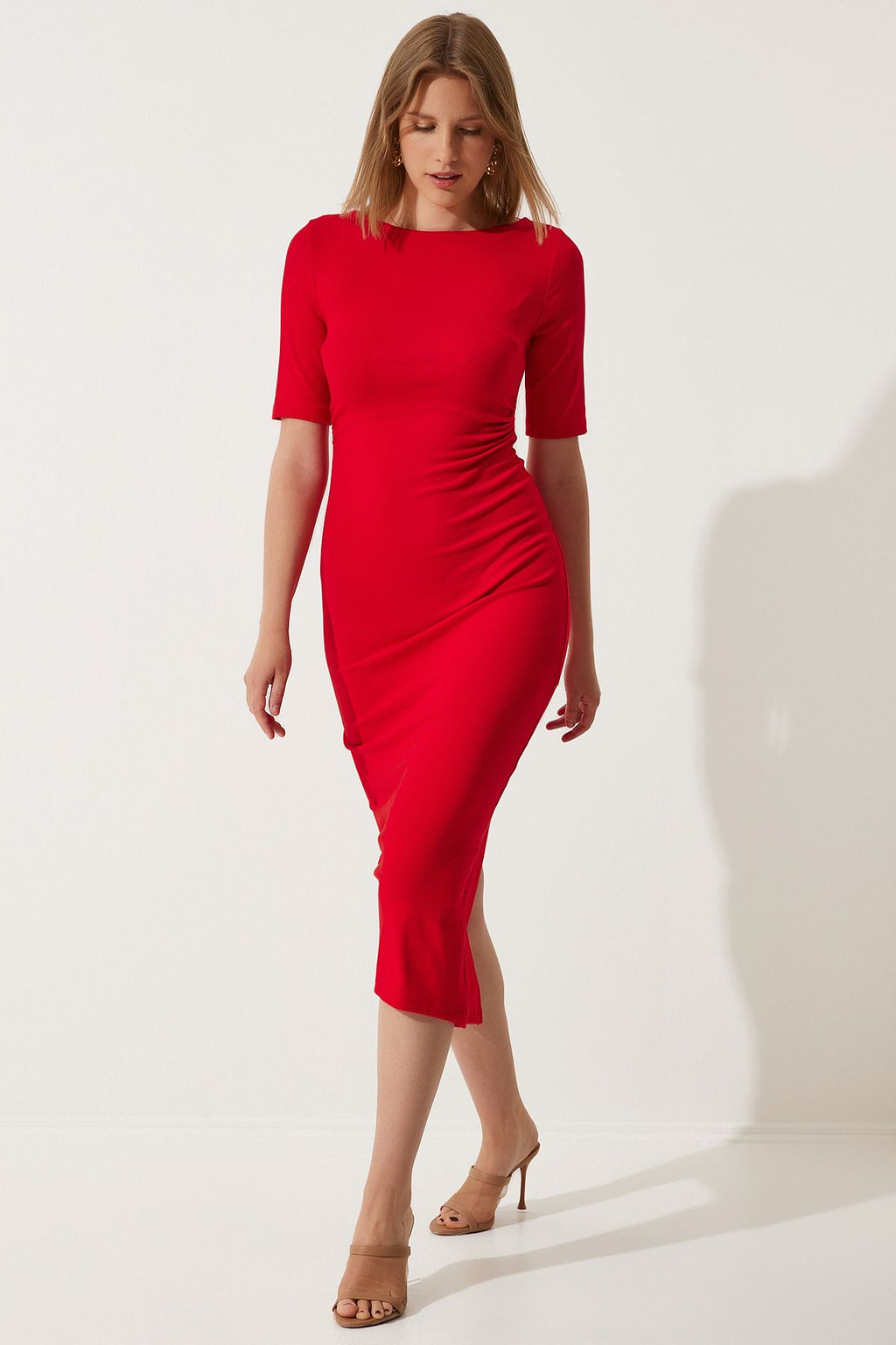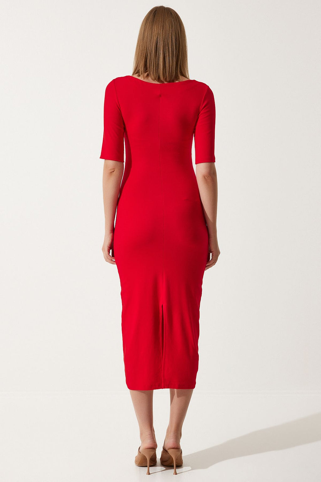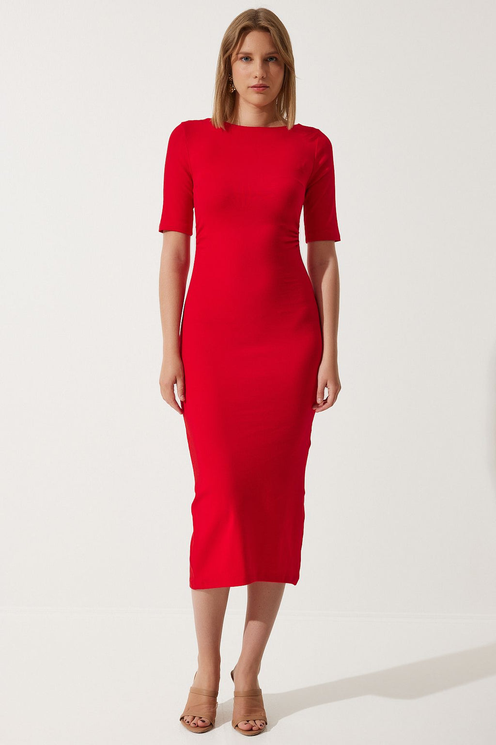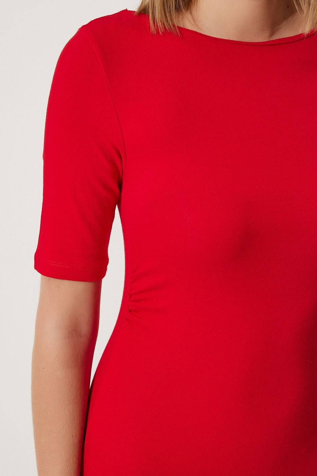 Woman Red Shirring Detailed Summer Knitting Dress UB00269