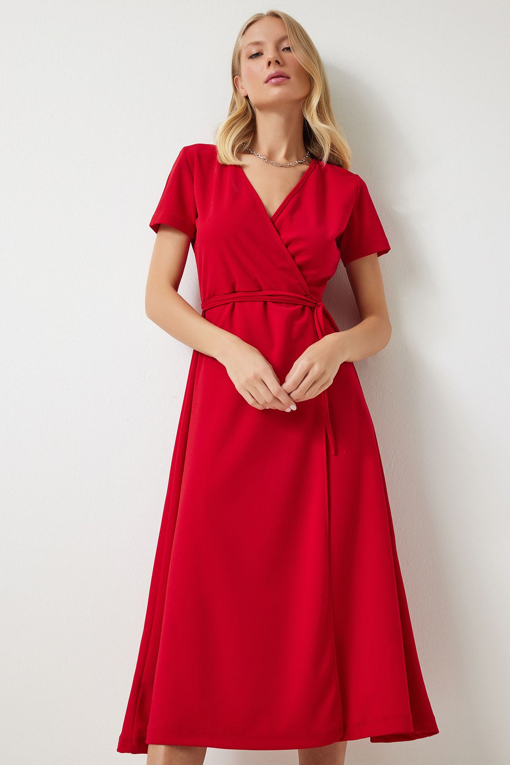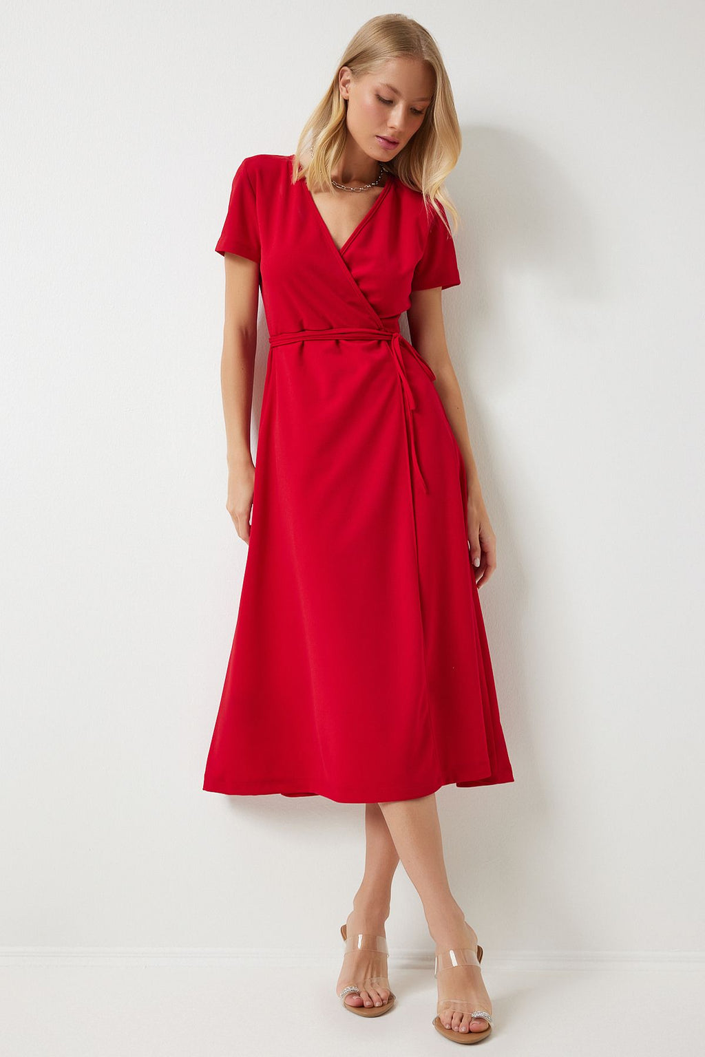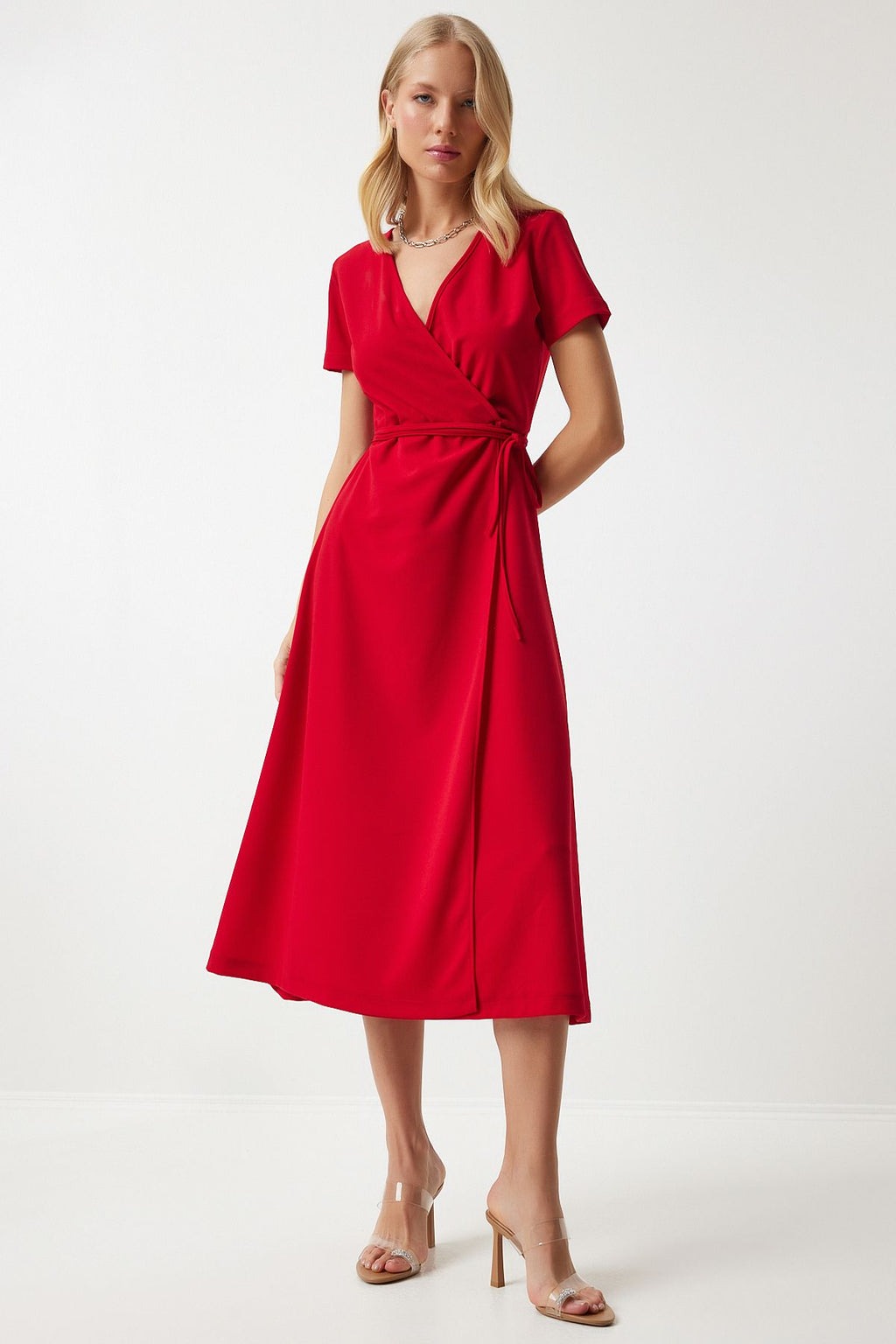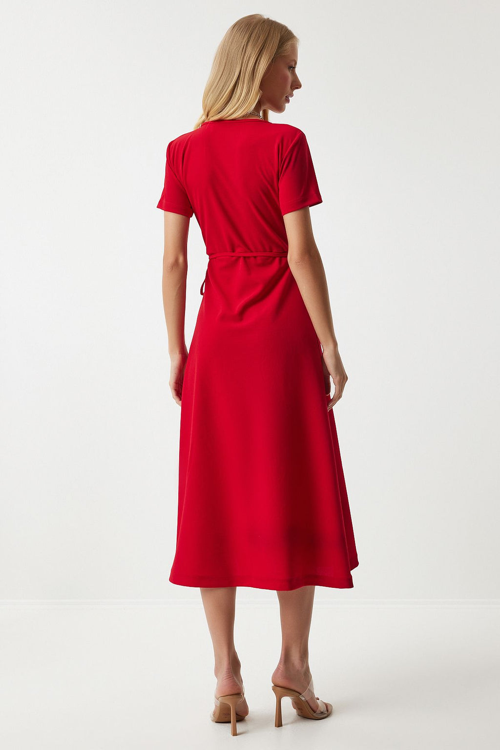 Woman Red V -Yaka Anvelop Midi Knitting Dress to00134
